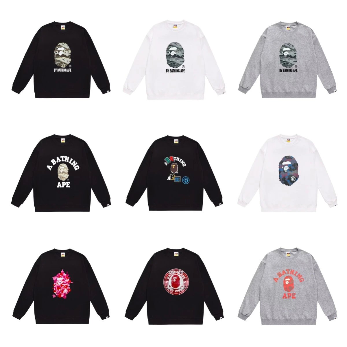Discover the iconic A Bathing Ape crewneck sweatshirts featuring classic ape head logos and bold graphics in multiple colors and patterns.