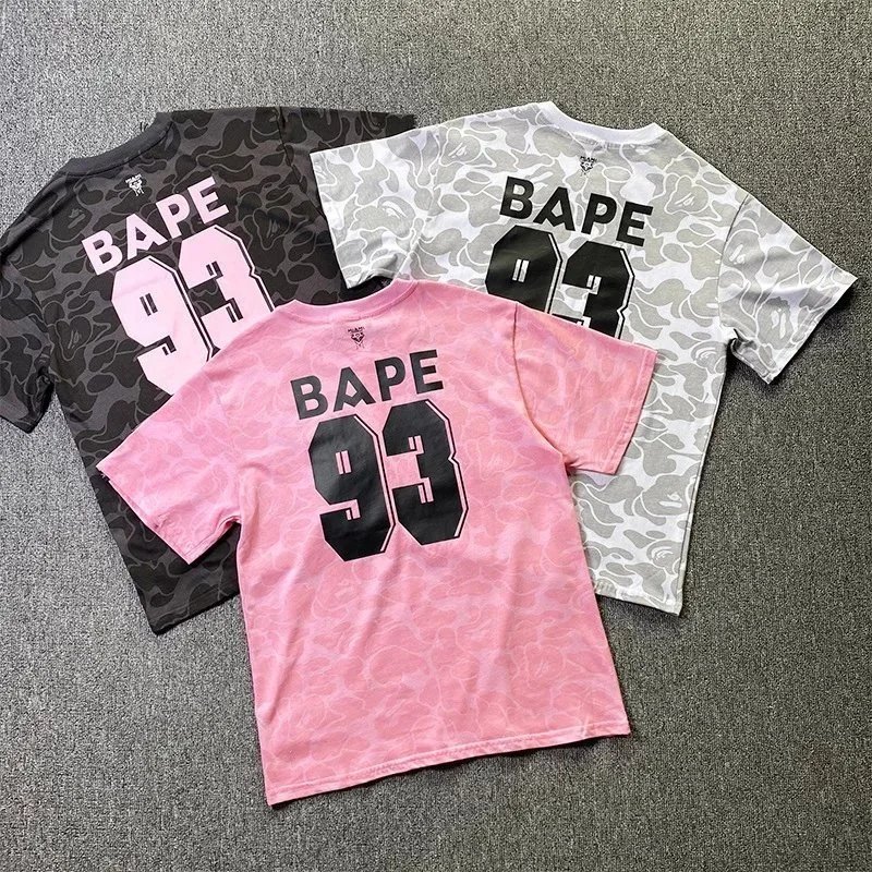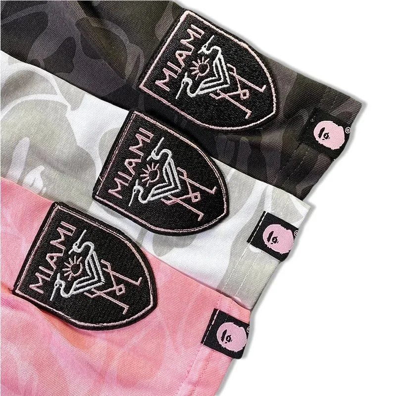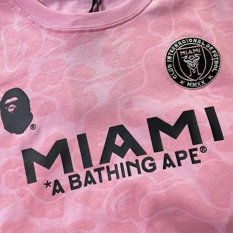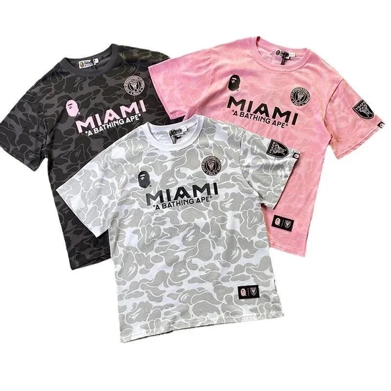 Featured are three distinct Miami x A BATHING APE camo t-shirts in black, white, and pink — each with bold branding and patch detailing. Ideal for streetwear enthusiasts seeking iconic collaborations.