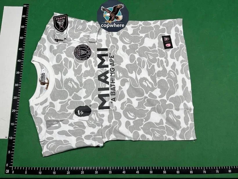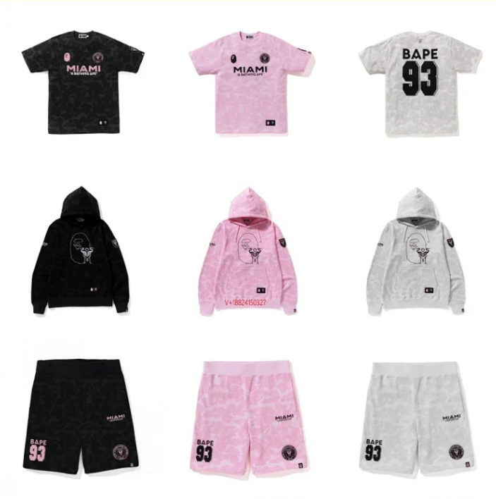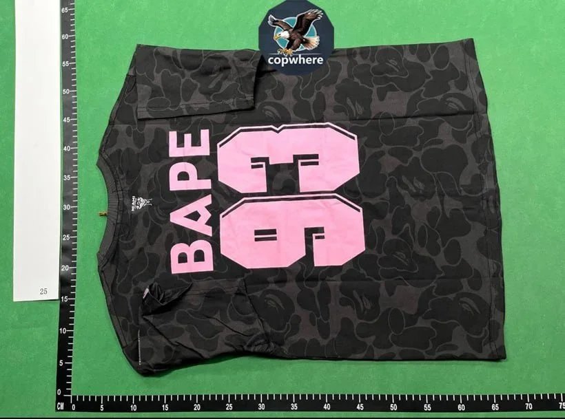 Dark camouflage t-shirt featuring bold pink 'MIAMI' text and A BATHING APE branding. Ideal for streetwear enthusiasts seeking distinctive urban style with iconic猿人头 design.