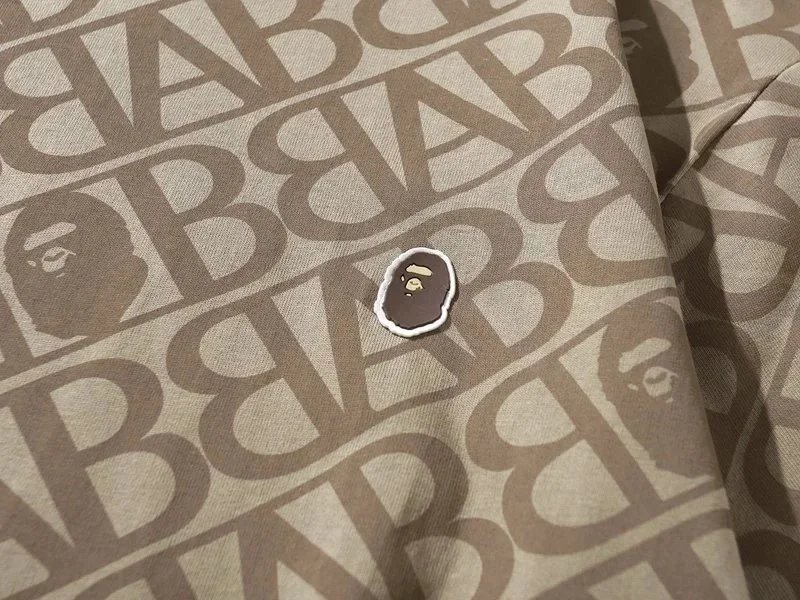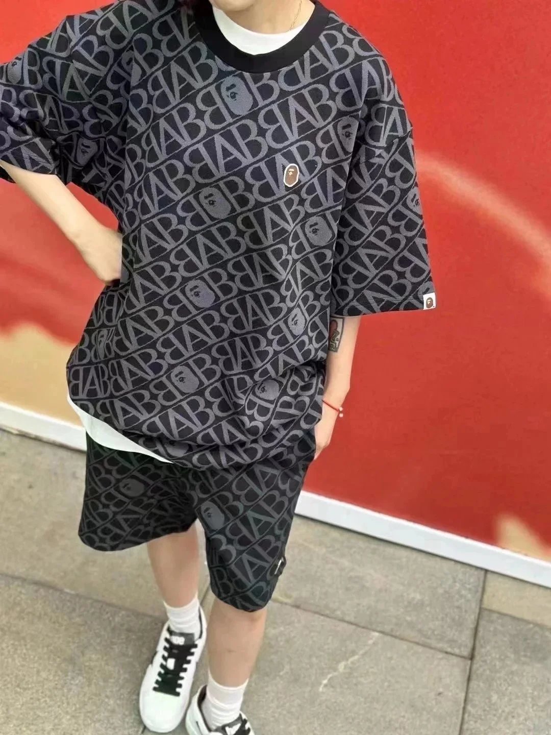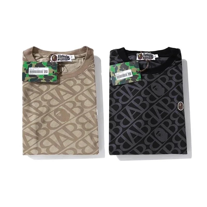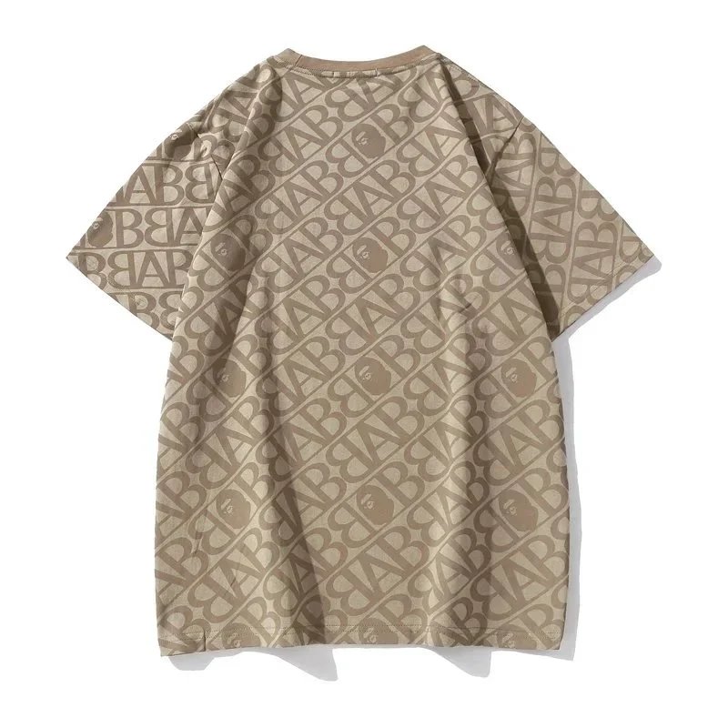 This ABATHINGAPE t-shirt features a bold diagonal monogram pattern with iconic ape head logos. Designed for urban streetwear style, it offers a relaxed fit perfect for casual outings.