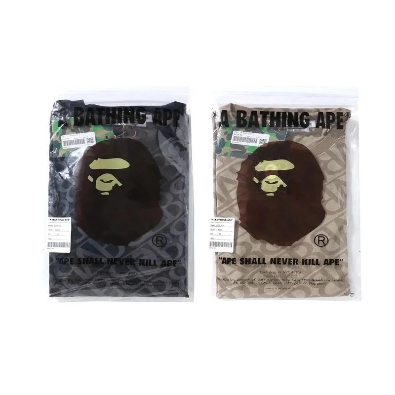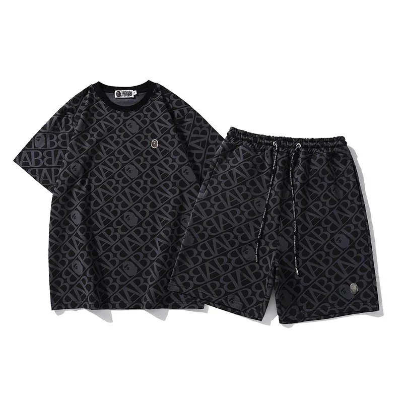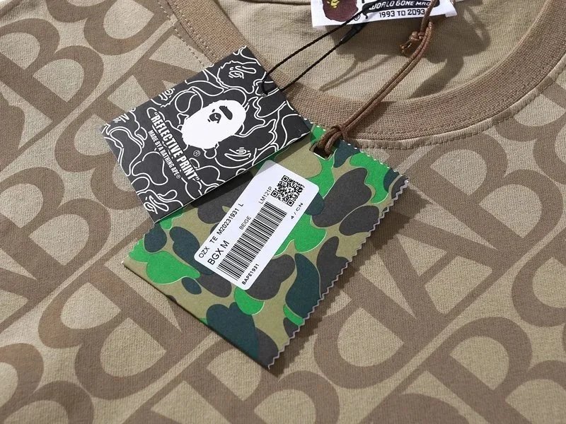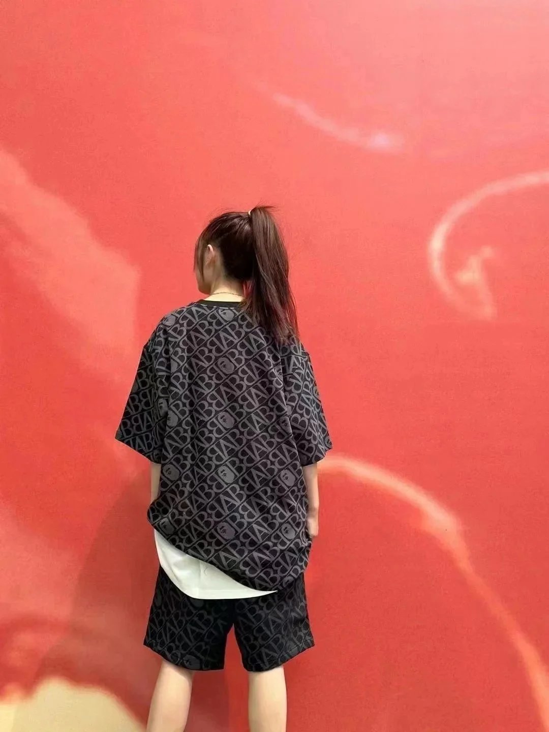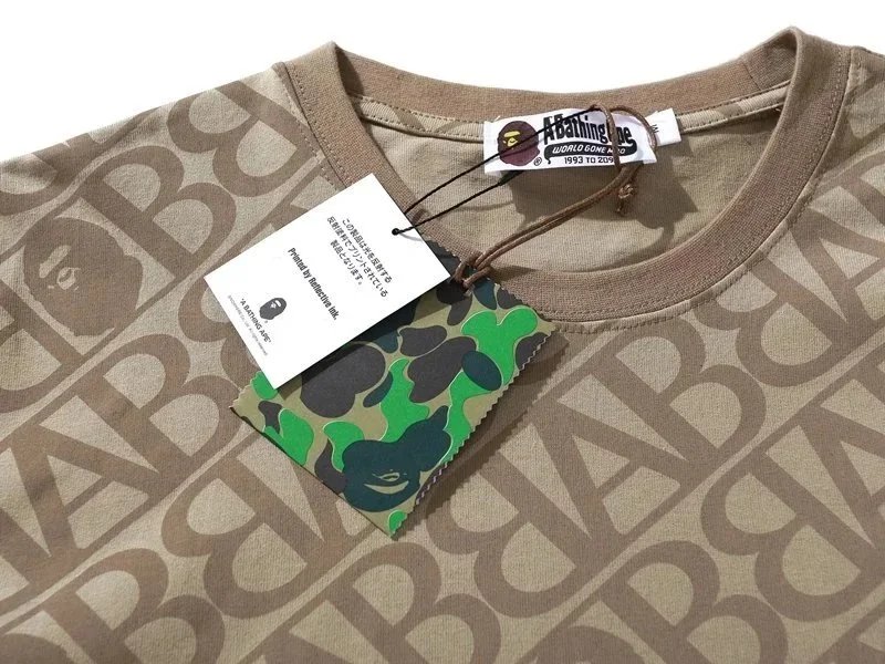 This ABATHINGAPE t-shirt features a bold diagonal monogram pattern with iconic ape head logos. Designed for urban streetwear style, it offers a relaxed fit perfect for casual outings.