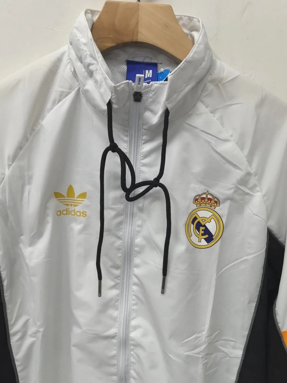 Official Adidas Real Madrid hooded jacket in white and blue, featuring the club crest and iconic three stripes. Perfect for fans and casual wear.