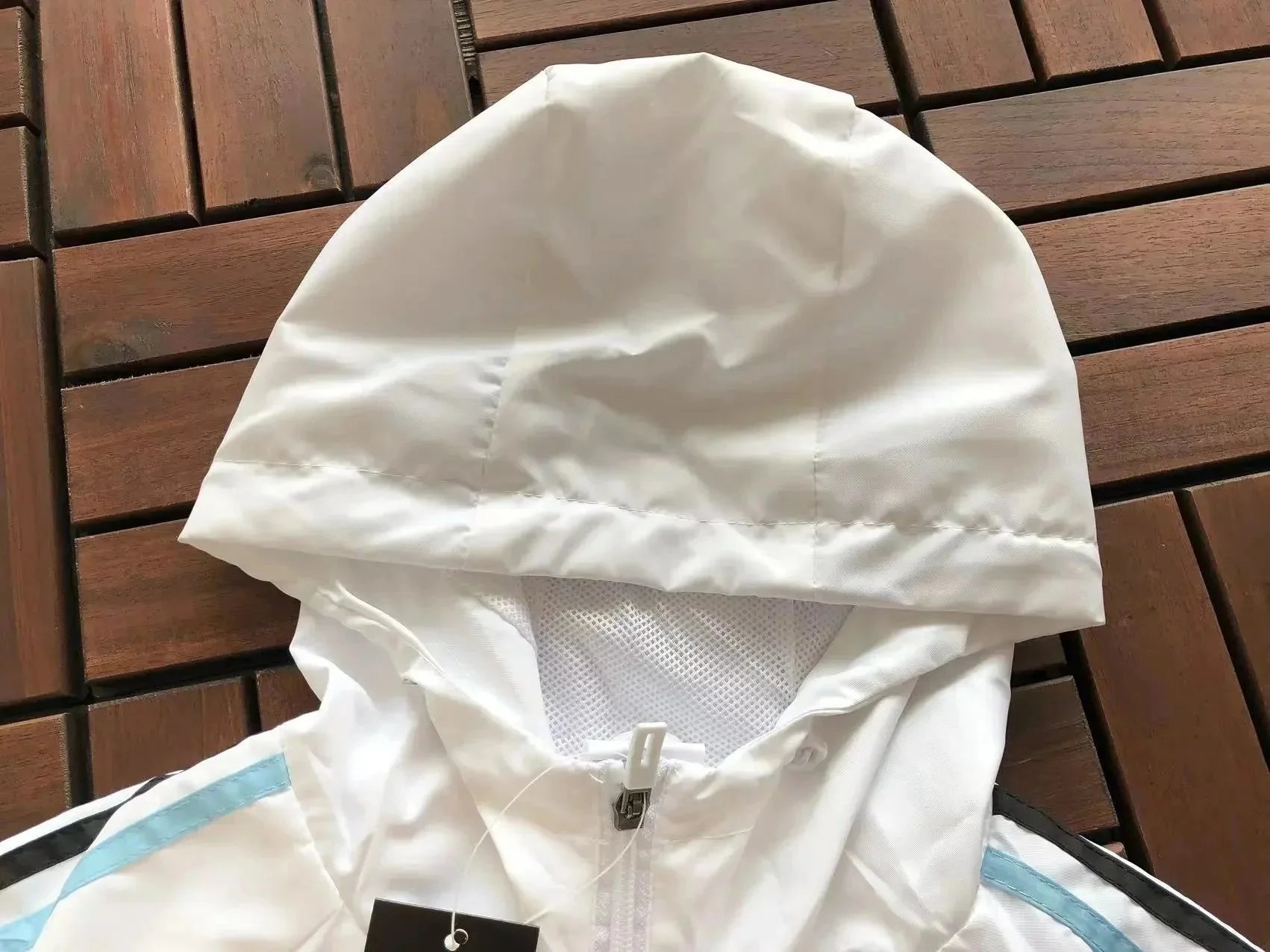 Official Adidas Real Madrid white windbreaker jacket featuring a hood and team crest. Lightweight and perfect for fans and athletes alike.