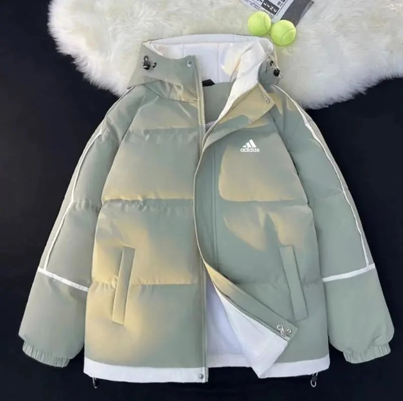 Stylish and warm Adidas winter puffer jacket in light blue with a detachable fur-lined hood. Perfect for cold weather with premium insulation and brand logo detailing.