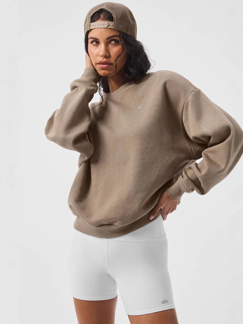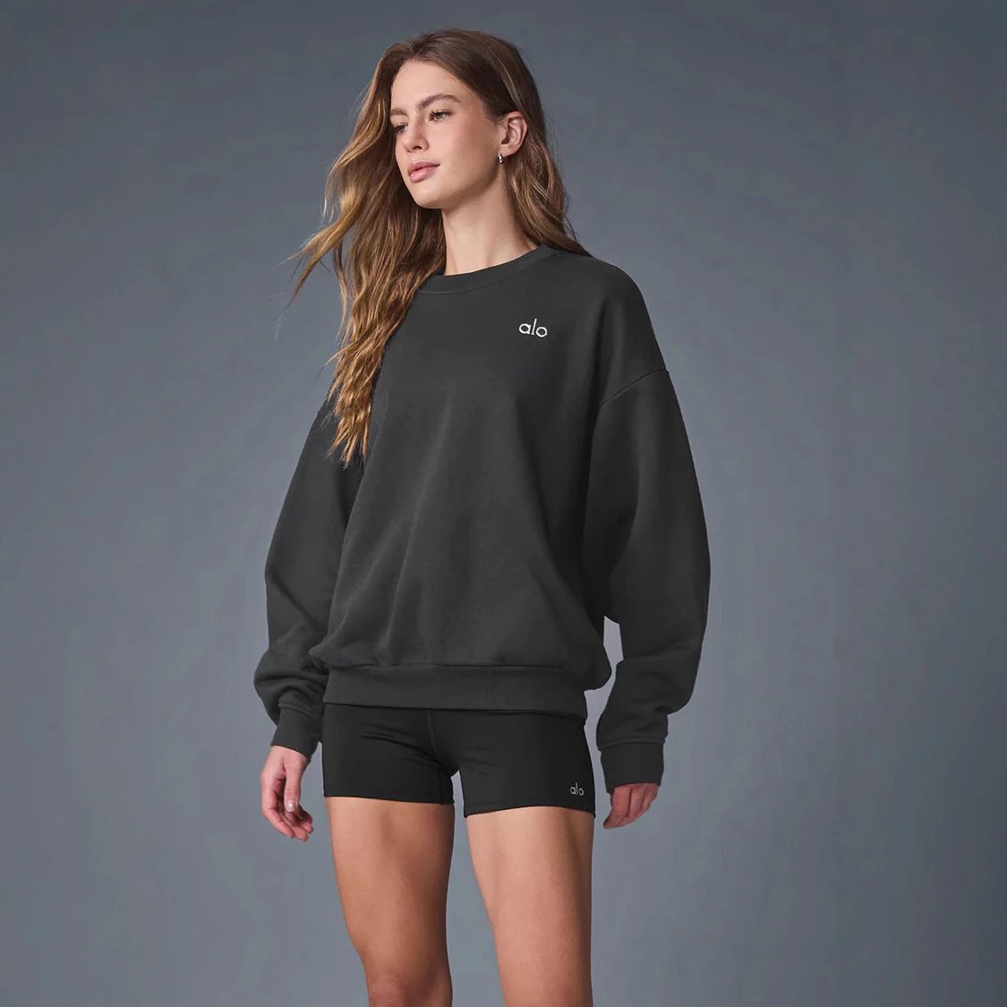 Stay stylish and comfortable in this Alo black crewneck sweatshirt featuring a minimalist white logo. Perfect for lounging or casual outings.
