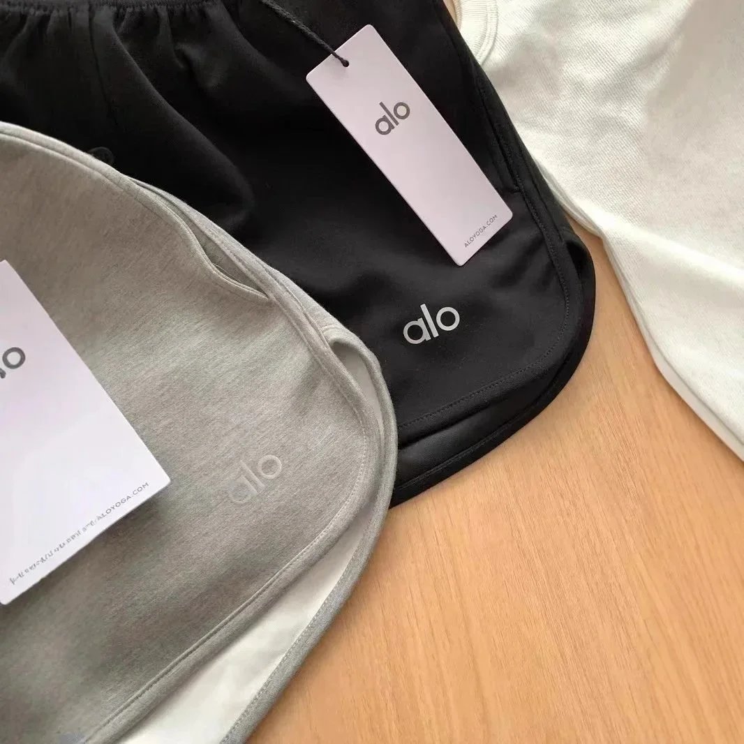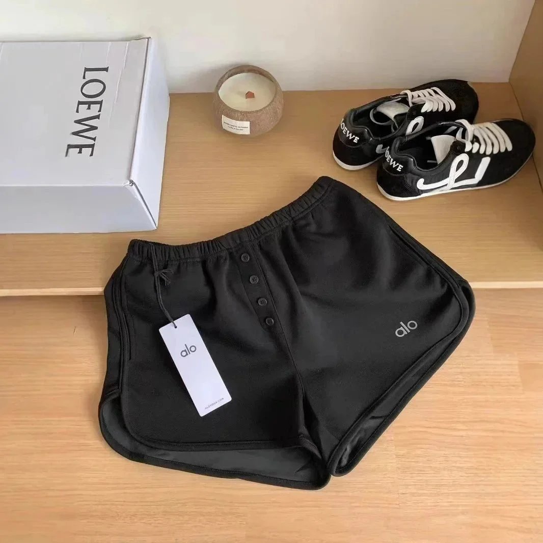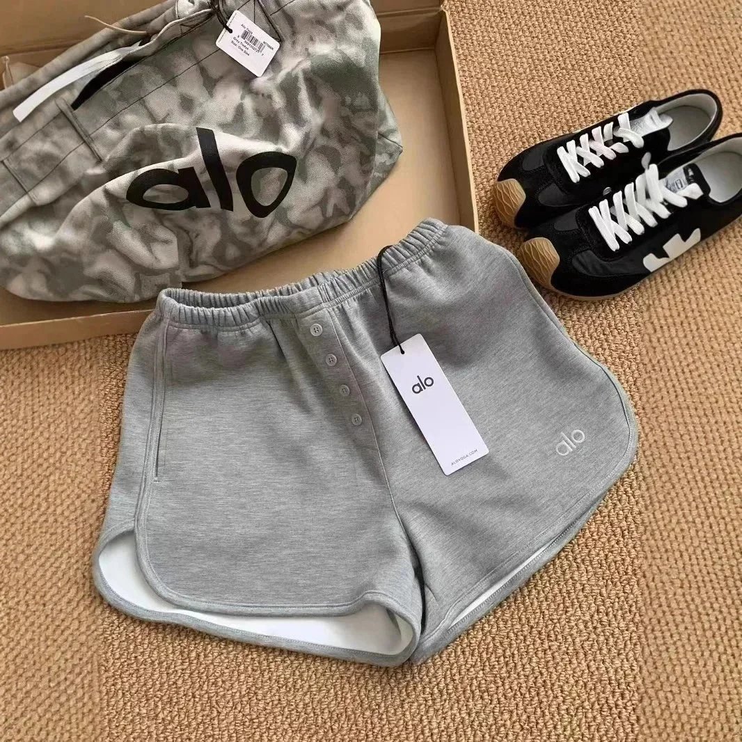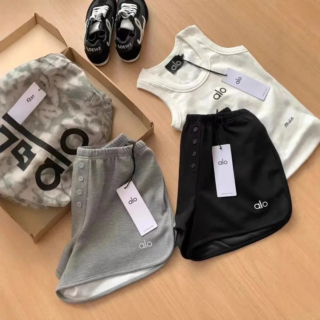 Stylish alo activewear set featuring gray and black button-front yoga shorts paired with a white tank top and matching sneakers. Perfect for workouts or casual wear.