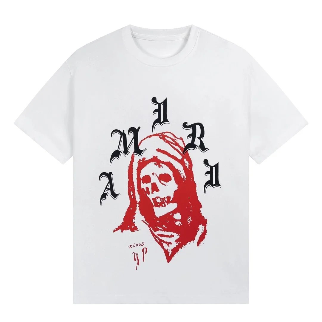 White AMARD t-shirt featuring a bold red skull graphic with black gothic lettering. Designed for edgy, urban style enthusiasts.