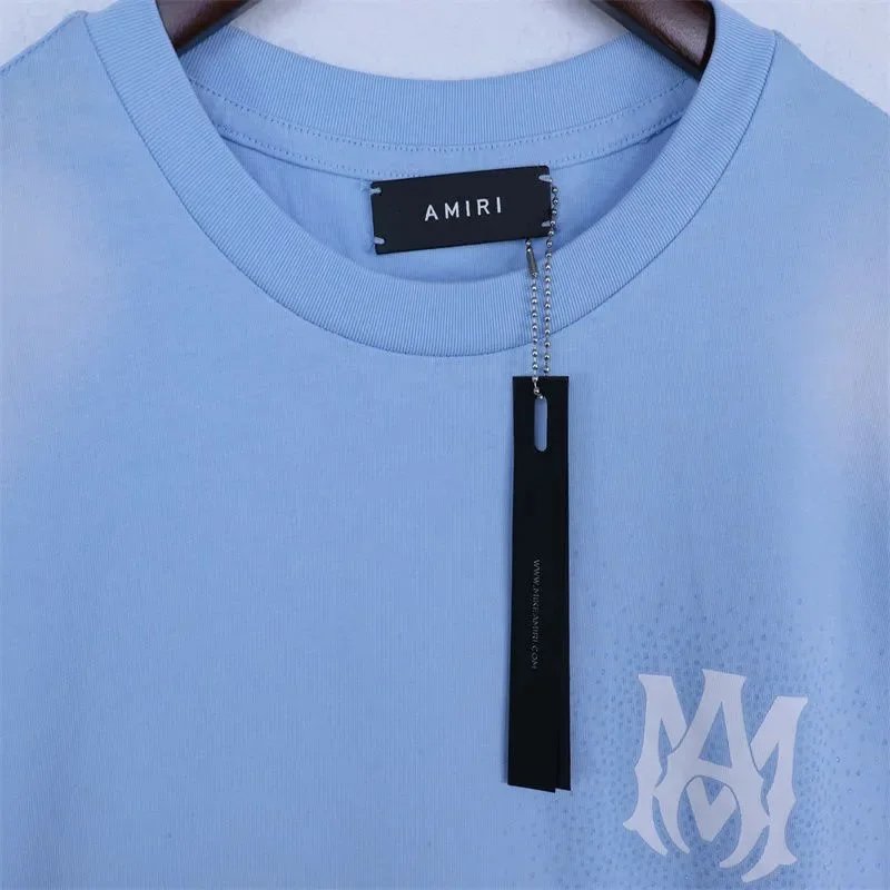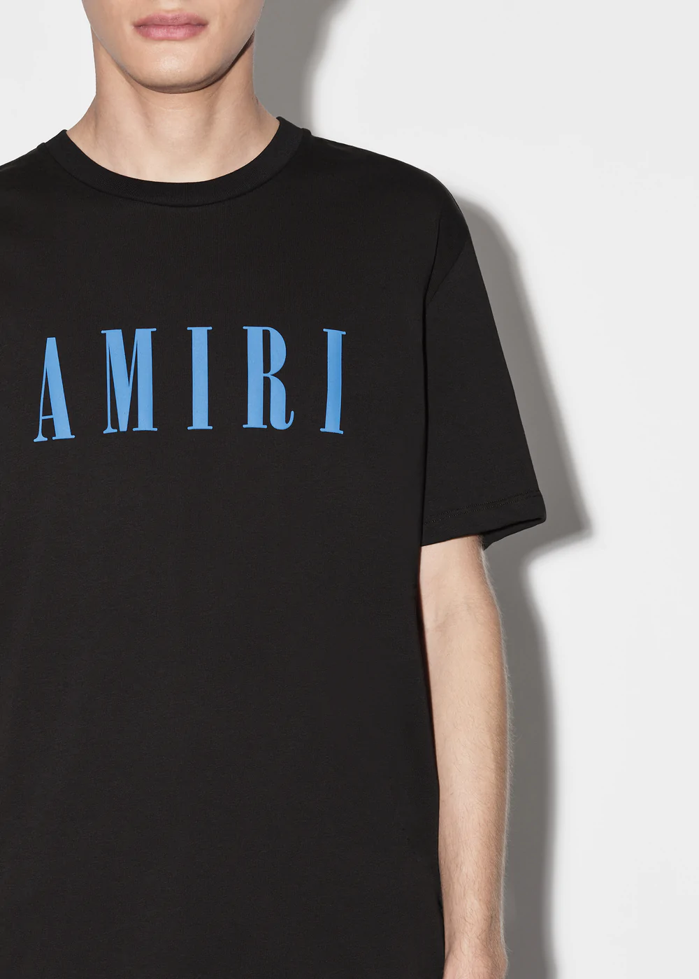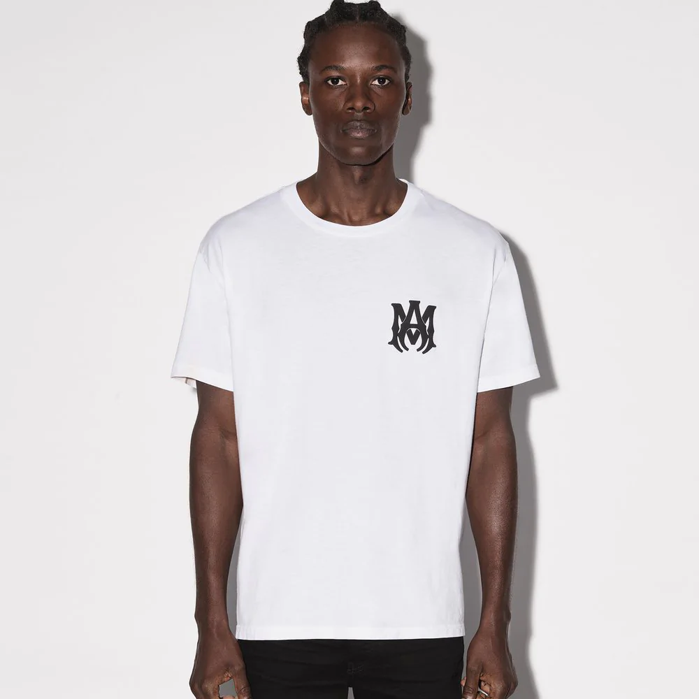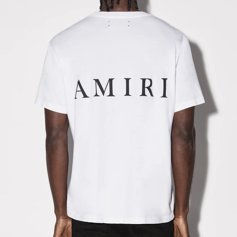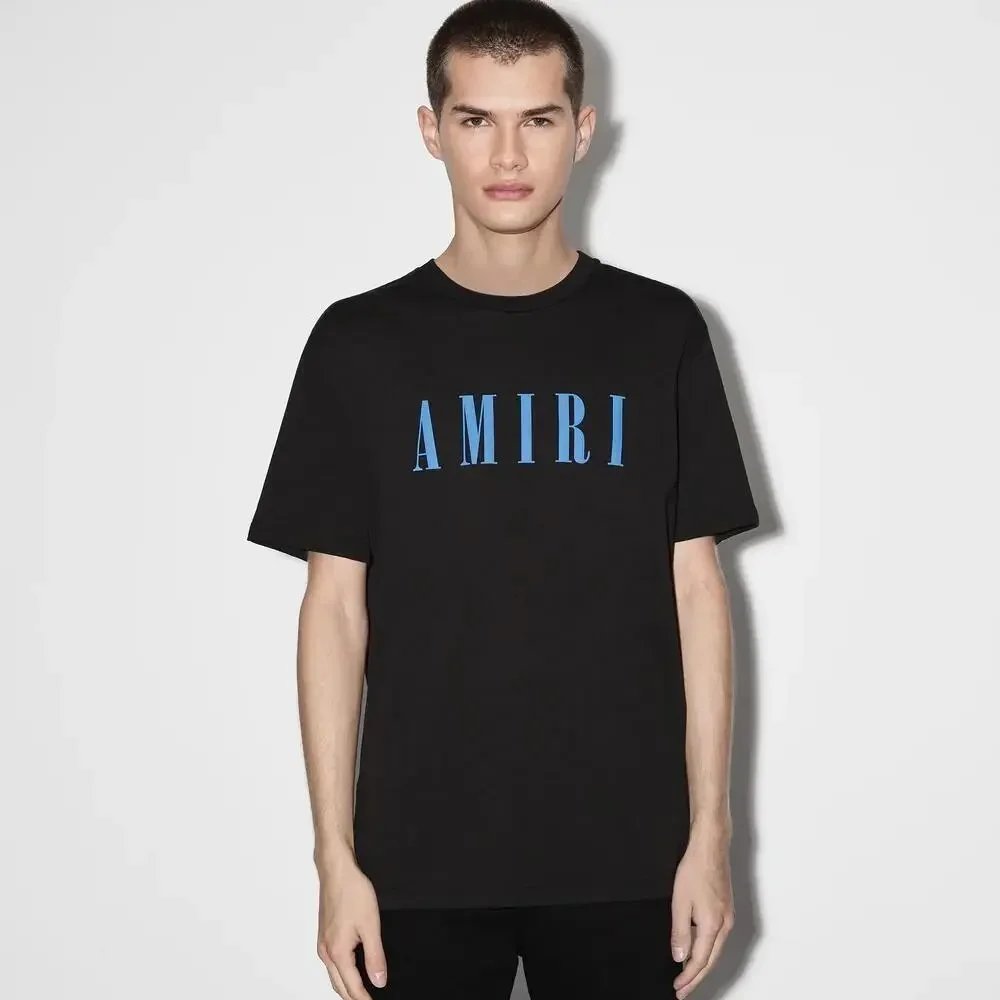 Bold black AMIRI t-shirt featuring a prominent white logo and stylized monogram between horizontal bars. Designed for urban style and brand recognition.