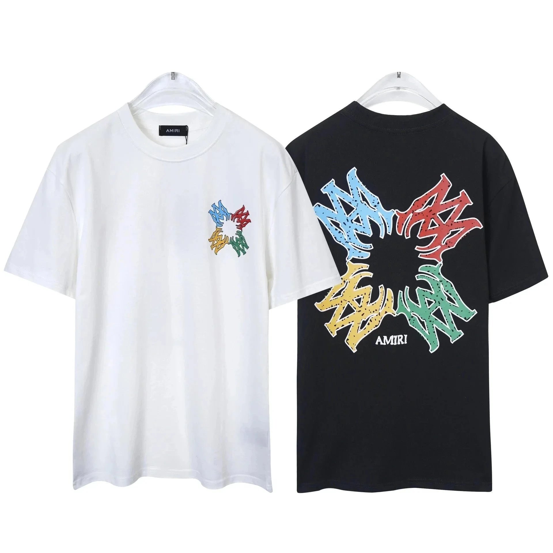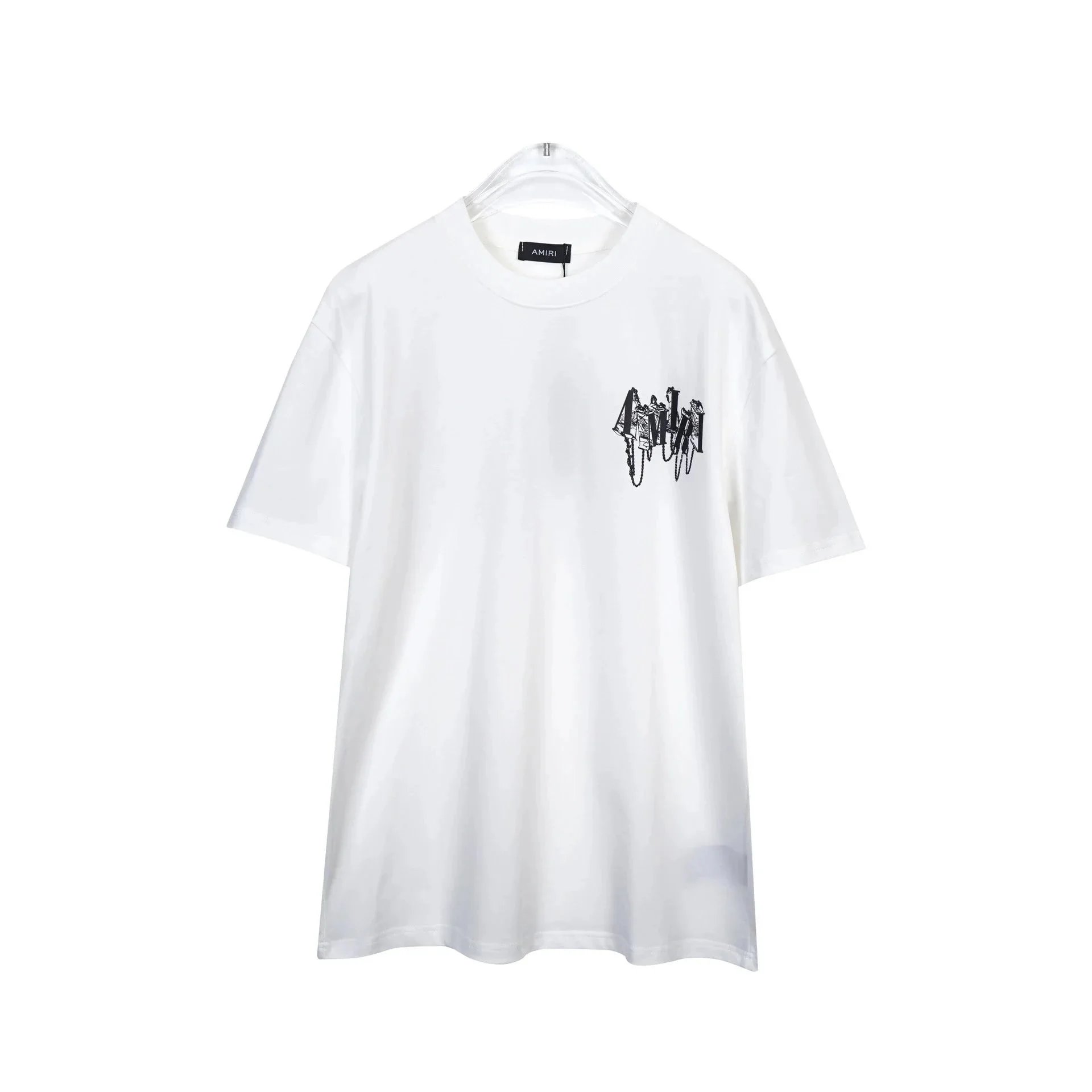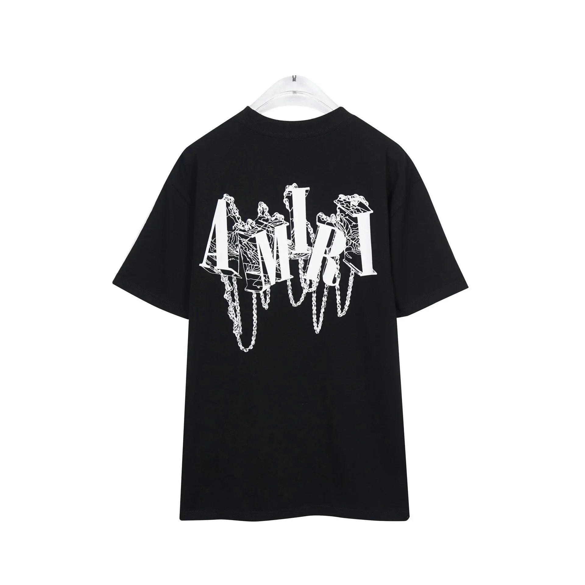 AMIRI brand t-shirts featuring bold chain-decorated logo prints — available in white and black. Designed for urban style with distinctive branding.