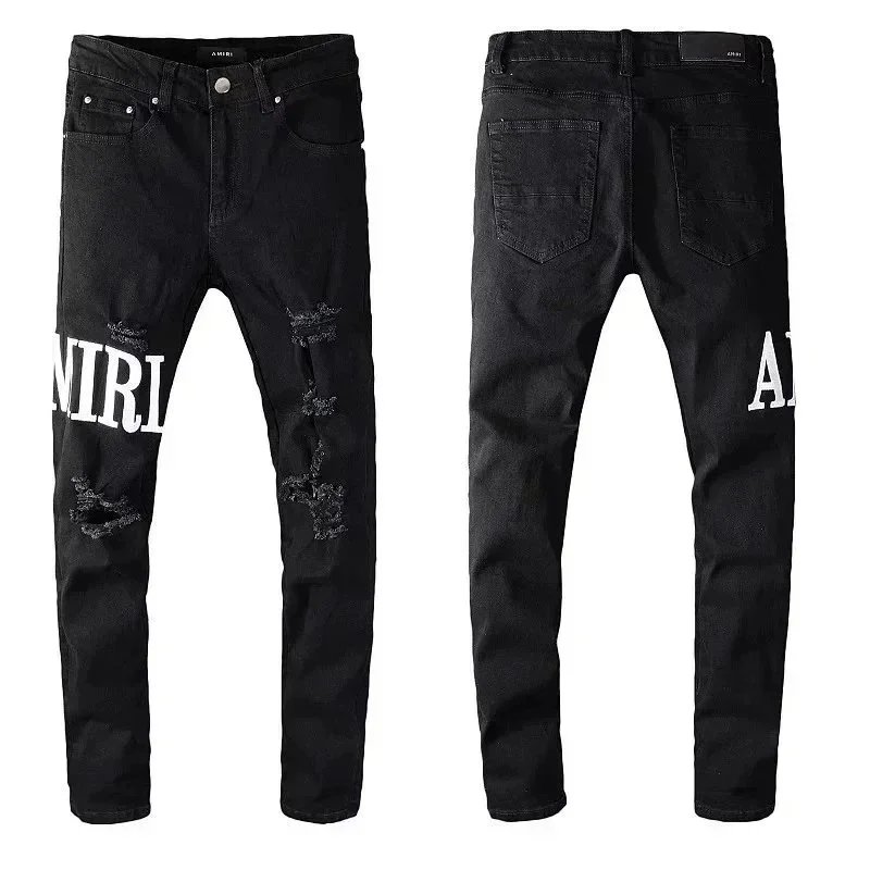 Stylish AMIRI distressed denim jeans featuring bold pink logo print and strategic rips for a rugged, high-fashion look. Perfect for edgy streetwear enthusiasts.