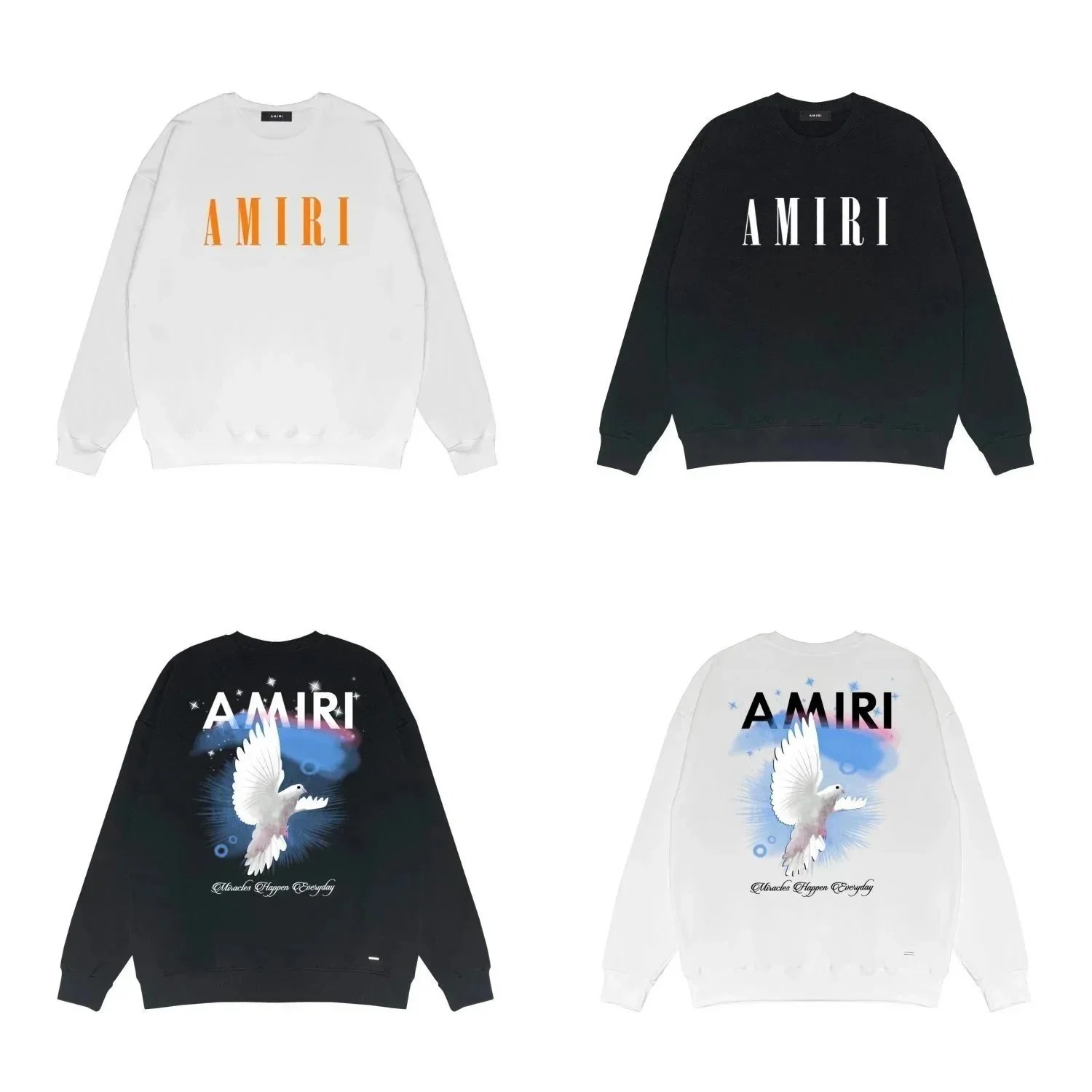 Shop AMIRI's premium sweatshirts featuring bold logo and dove graphic designs in white and black. Perfect for casual, elevated streetwear.