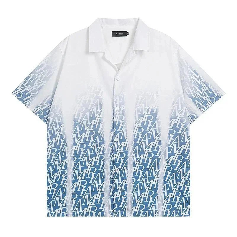 AMIRI men's gradient logo shirt and matching shorts set in white, blue, and black. Features bold monogram print with ombre effect for a modern streetwear look.