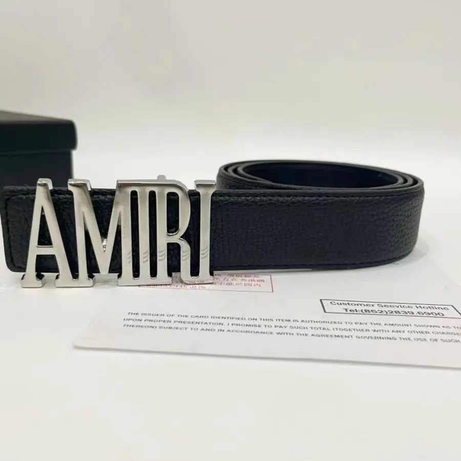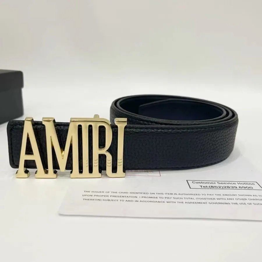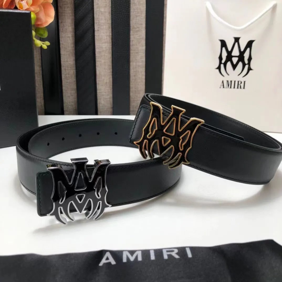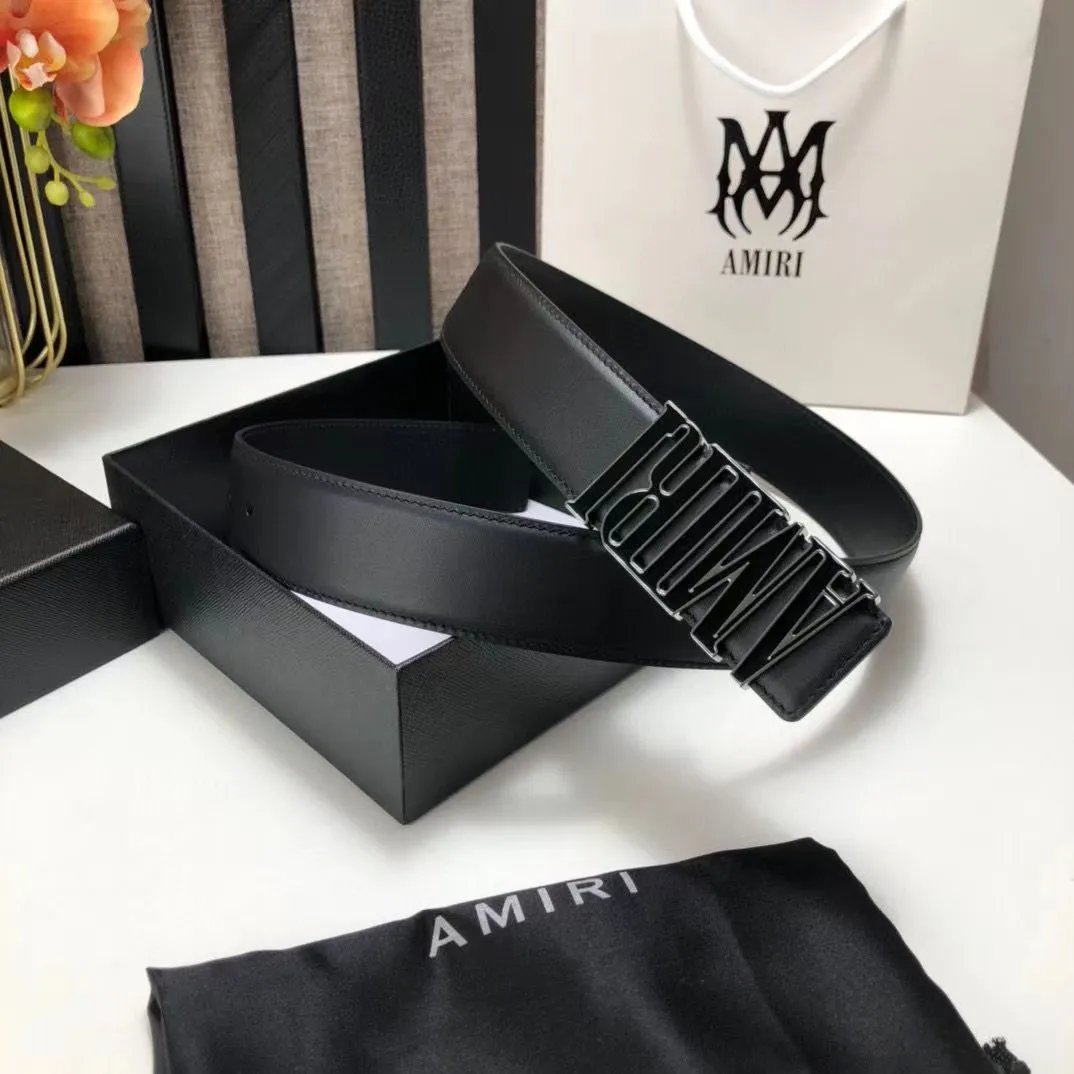 Elegant AMIRI black leather belt featuring distinctive metal logo buckles in various finishes. Designed for luxury appeal and premium craftsmanship.