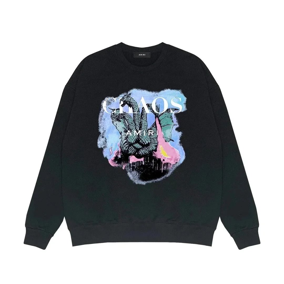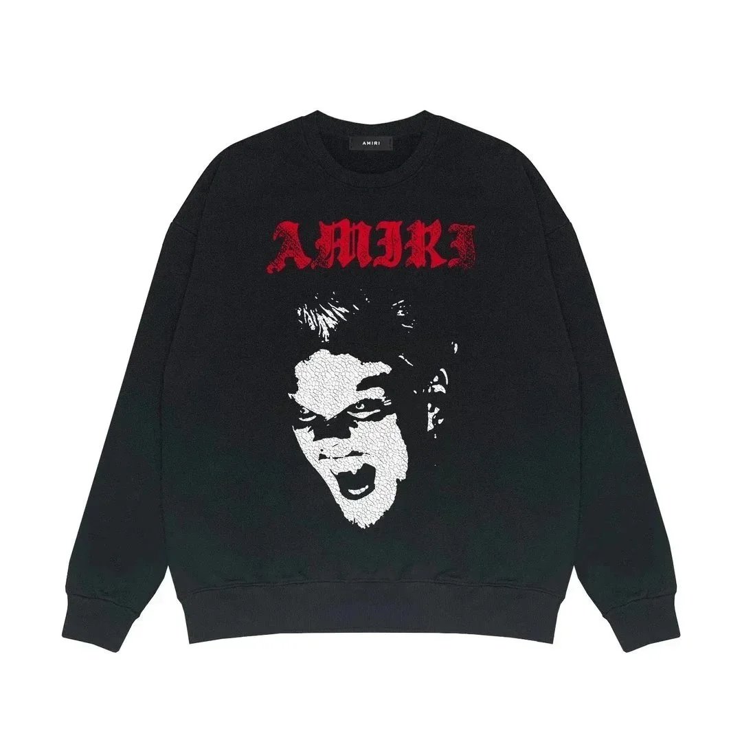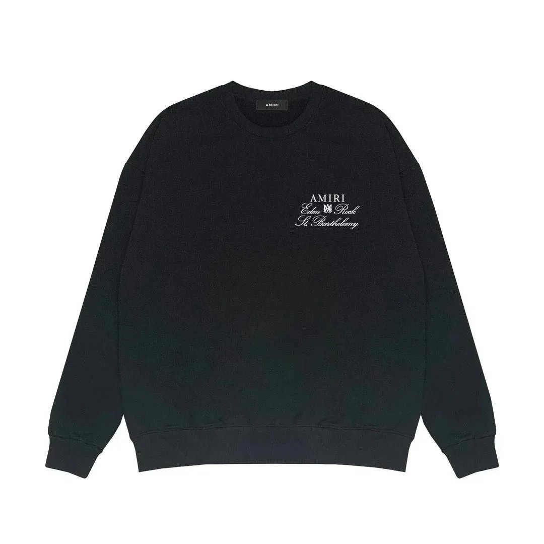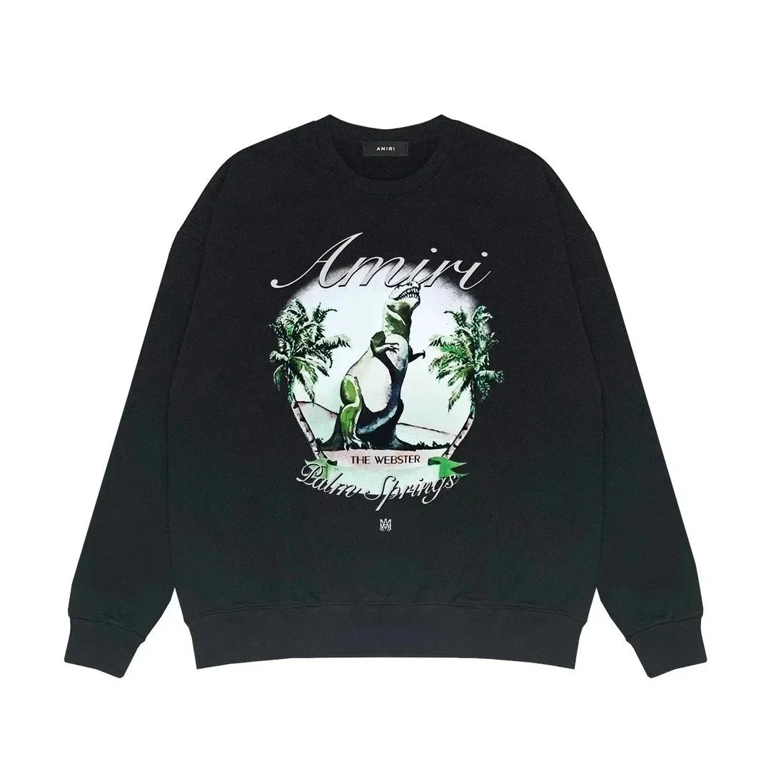 Bold Amiri black sweatshirt featuring a vibrant mermaid graphic with palm trees and sunset. Perfect for statement streetwear looks.