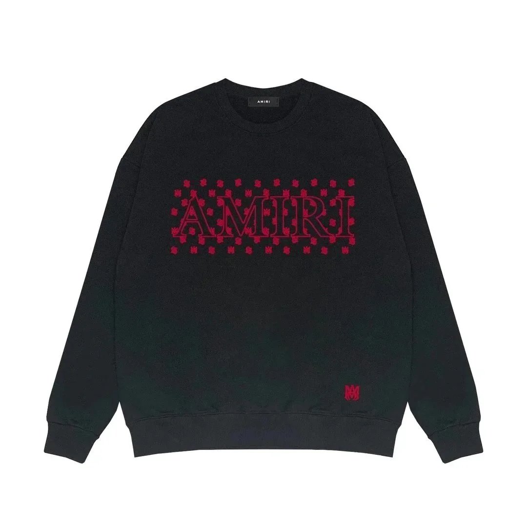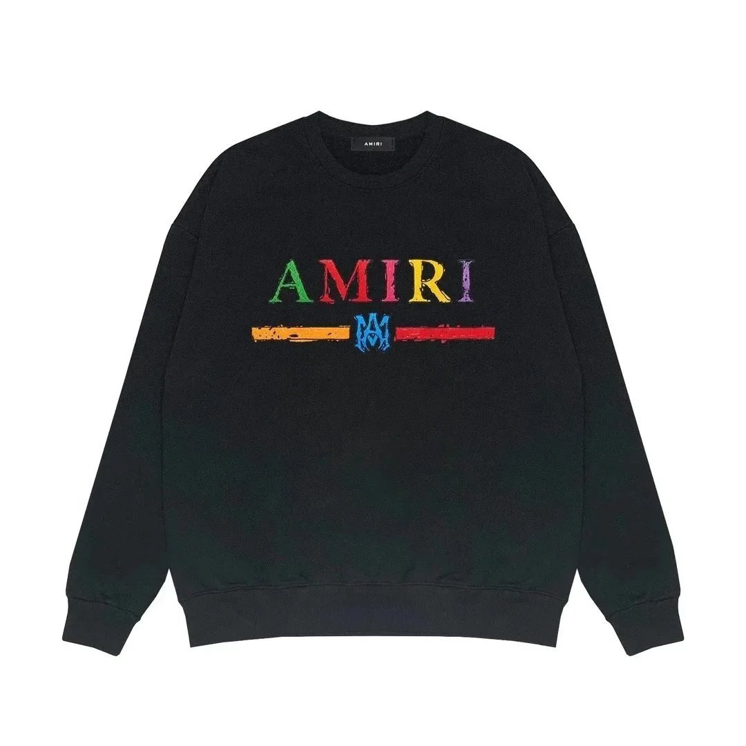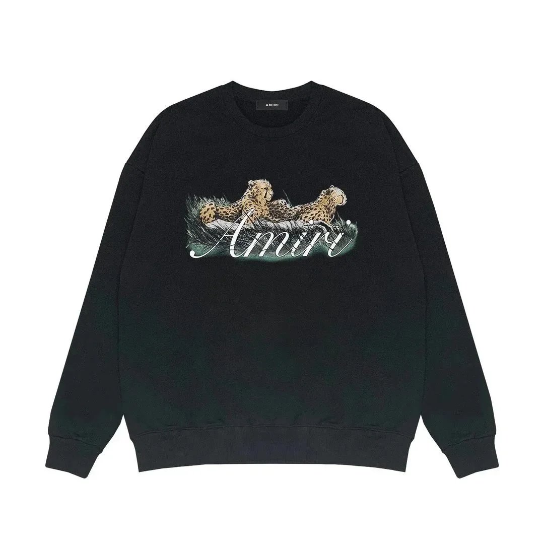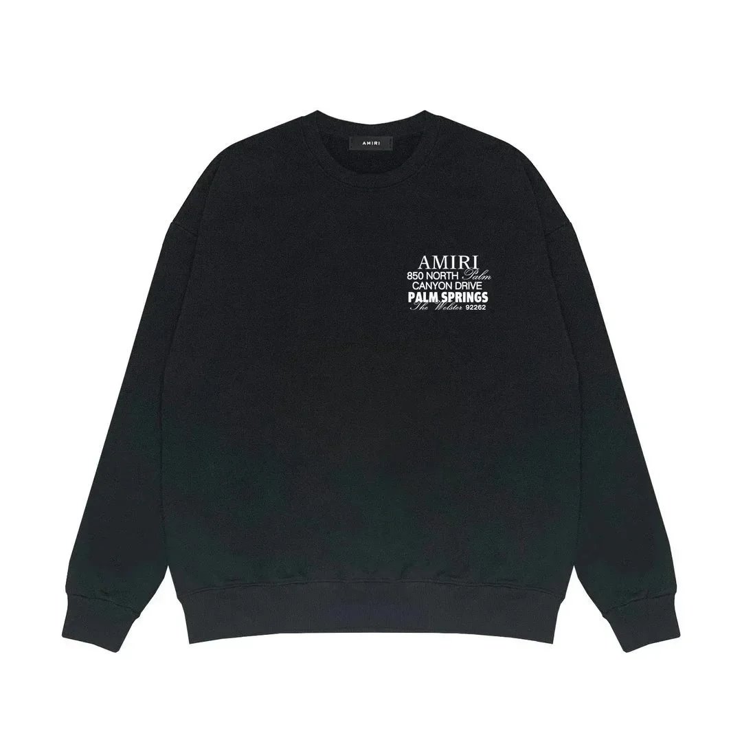Bold Amiri black sweatshirt featuring a vibrant mermaid graphic with palm trees and sunset. Perfect for statement streetwear looks.
