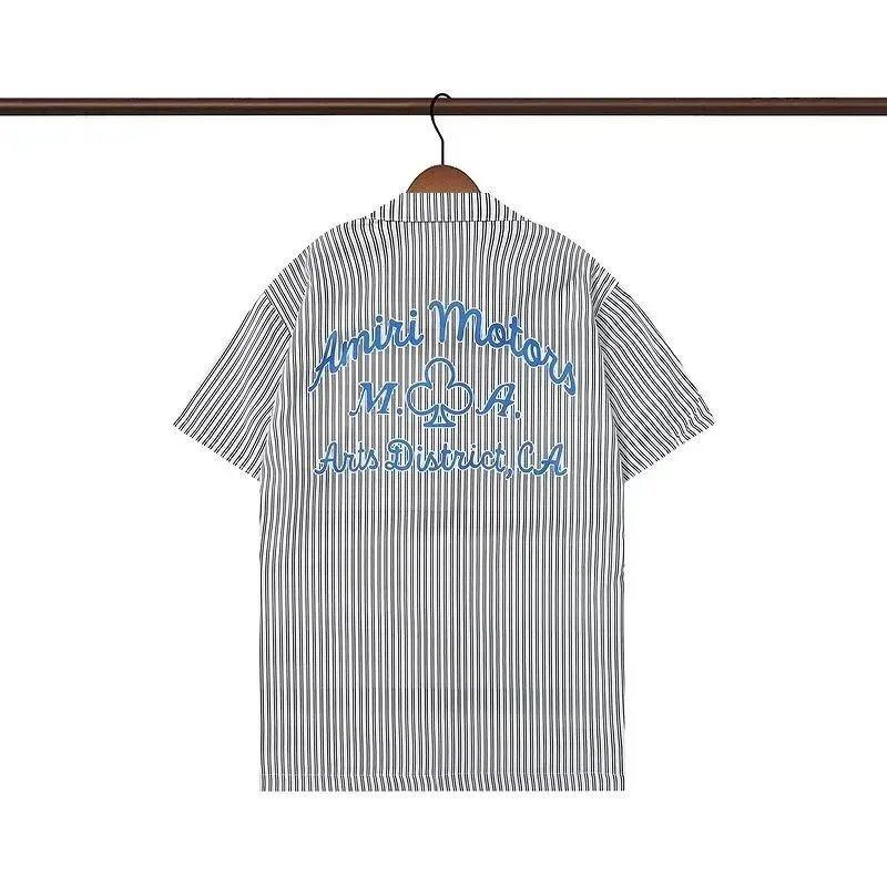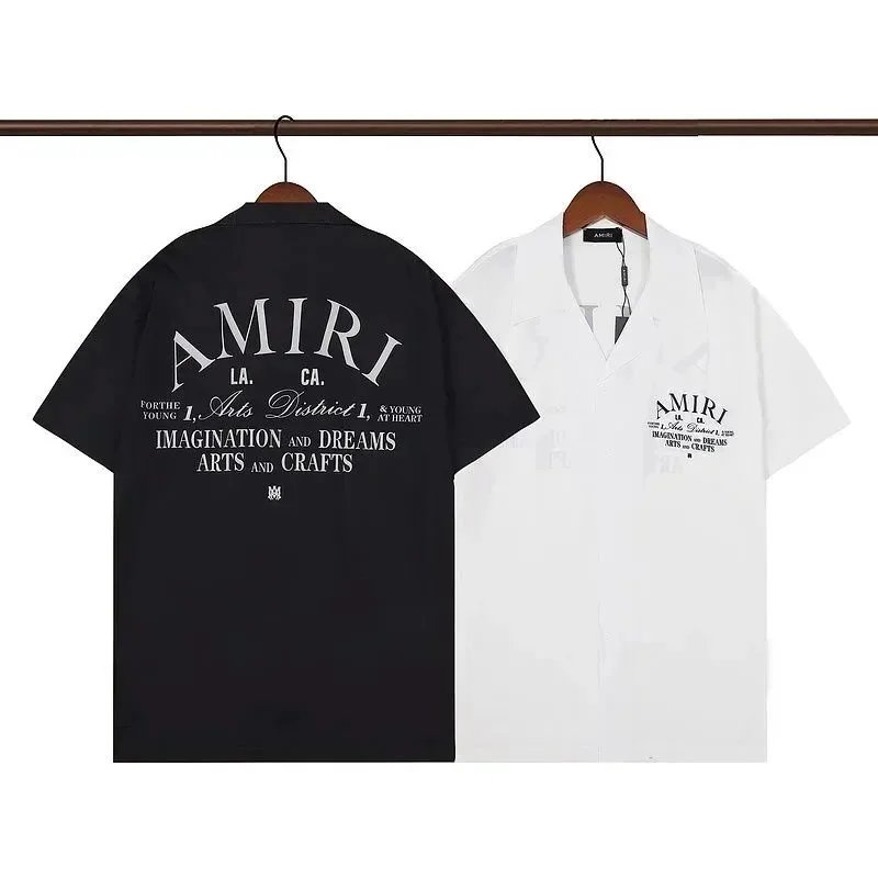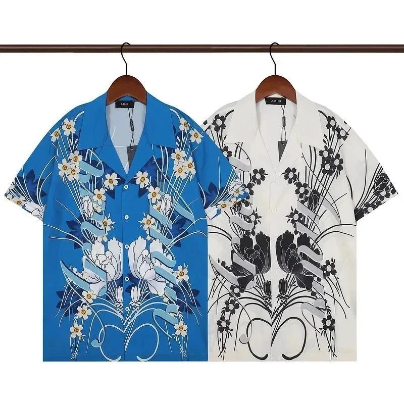 Premium AMIRI short-sleeve button-up shirts featuring bold graphics including botanical prints, skulls, tie-dye, and iconic LA motifs. Crafted with high-end detailing and distinctive branding for statement streetwear.