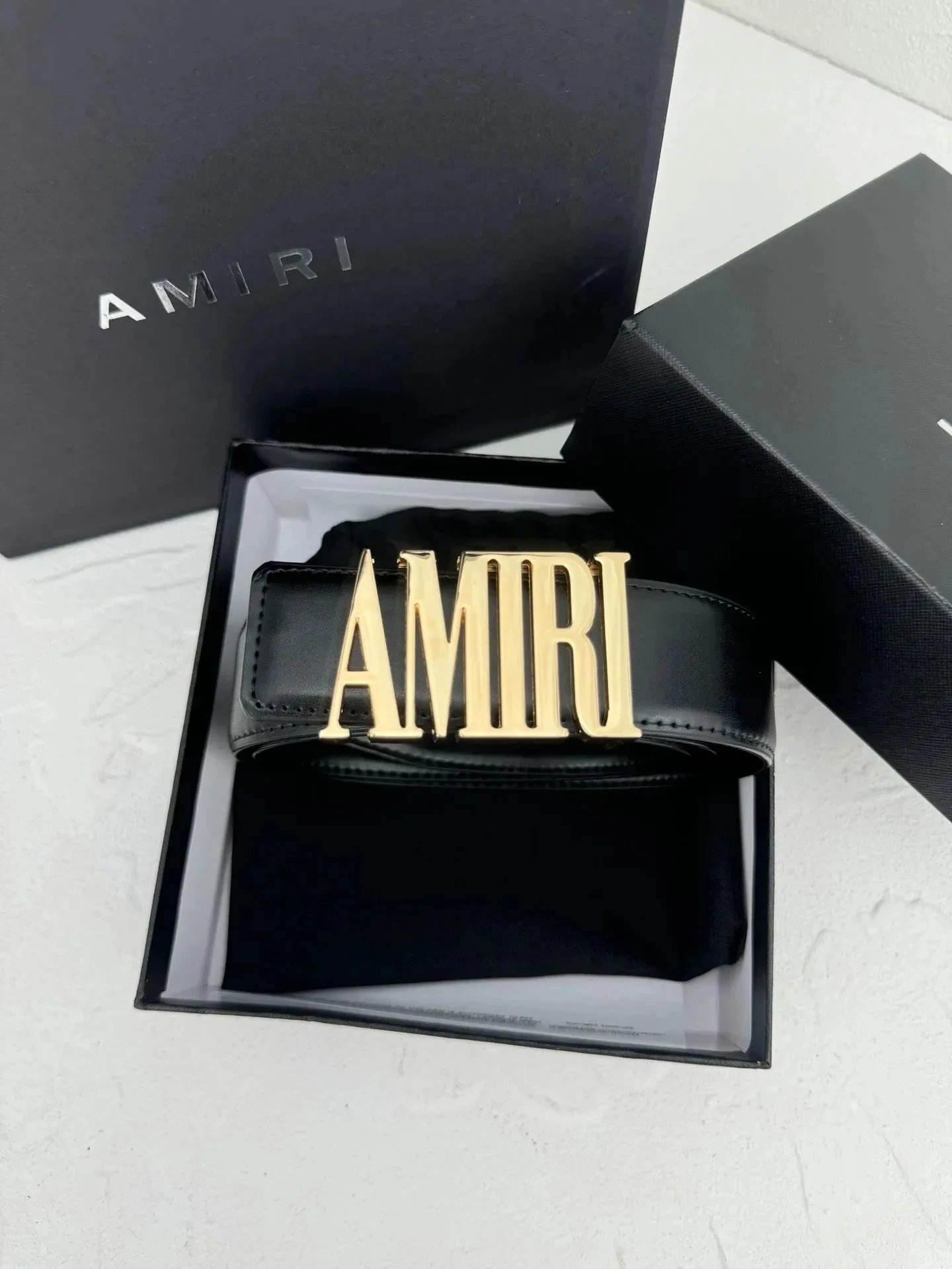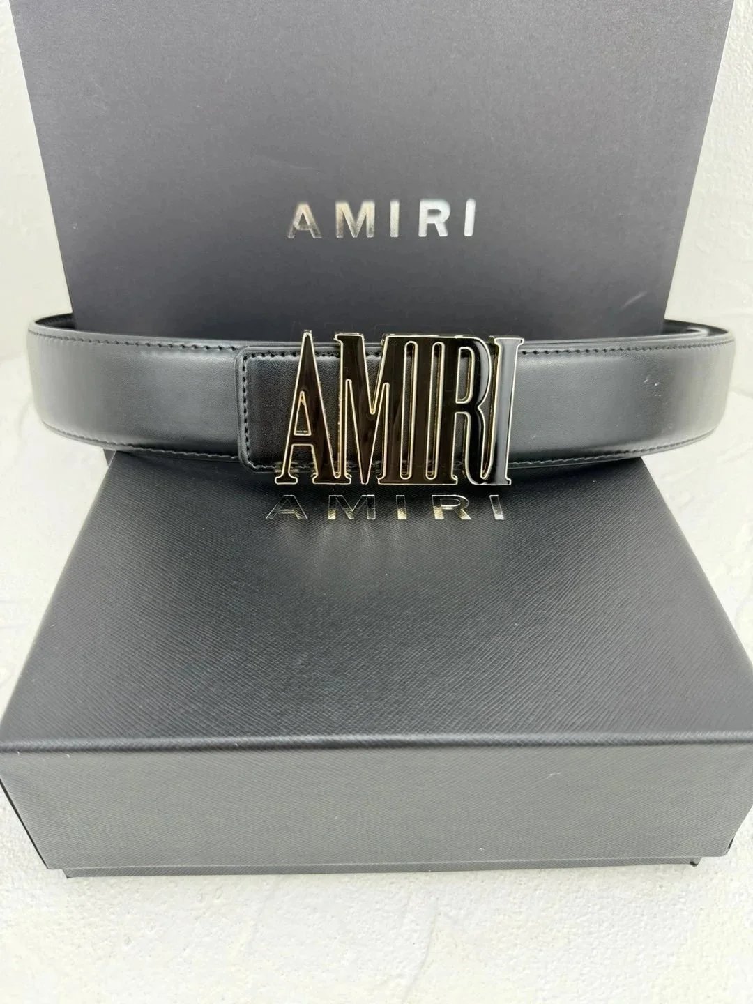 Elevate your style with the AMIRI white leather belt featuring a bold gold-tone logo buckle. A statement accessory for modern fashion enthusiasts.