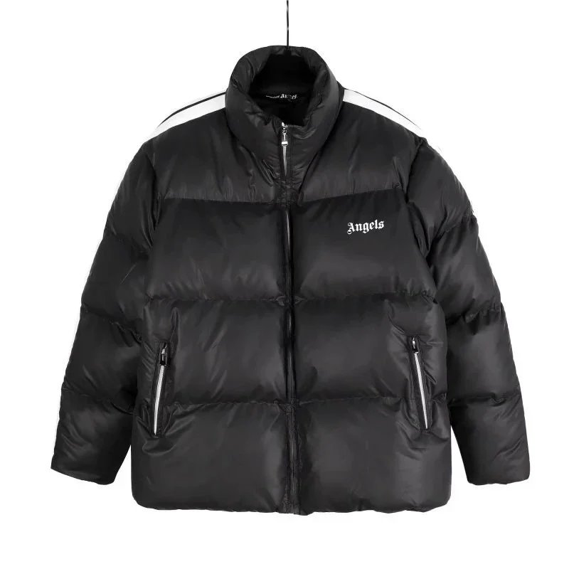 Stylish black puffer jacket featuring a bold 'Angels' logo and white shoulder stripes. Perfect for cold weather with a modern, urban look.