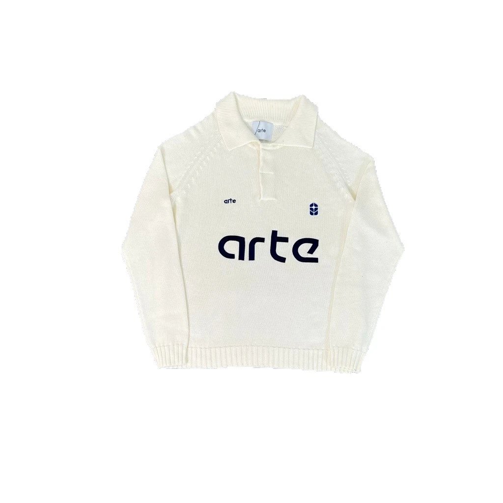 Discover the arte collection featuring stylish knit polos and zip-up sweaters with bold logo designs in navy, cream, green, and off-white.