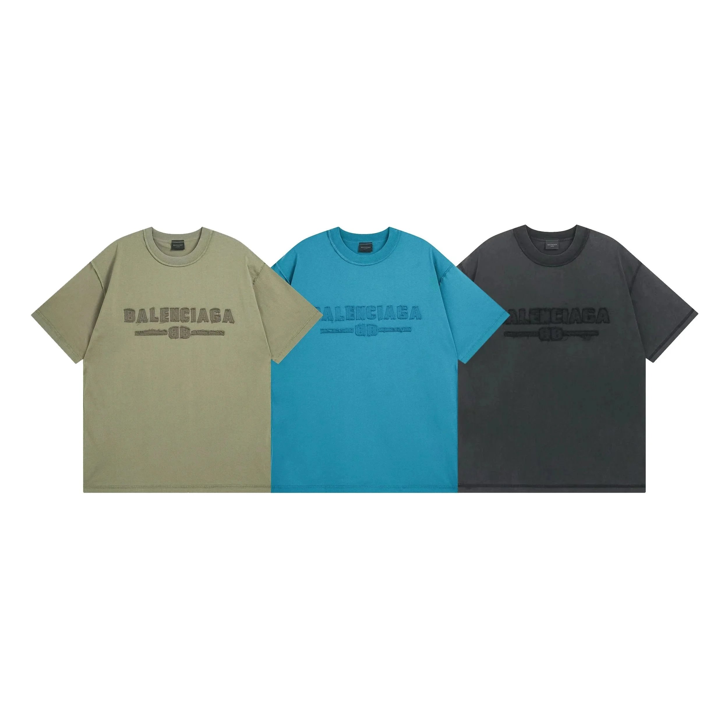 Balenciaga 01 series T-shirts featuring bold arched logo and number '01' across the chest. Available in white, purple, blue, and black with relaxed fit and branded tags.