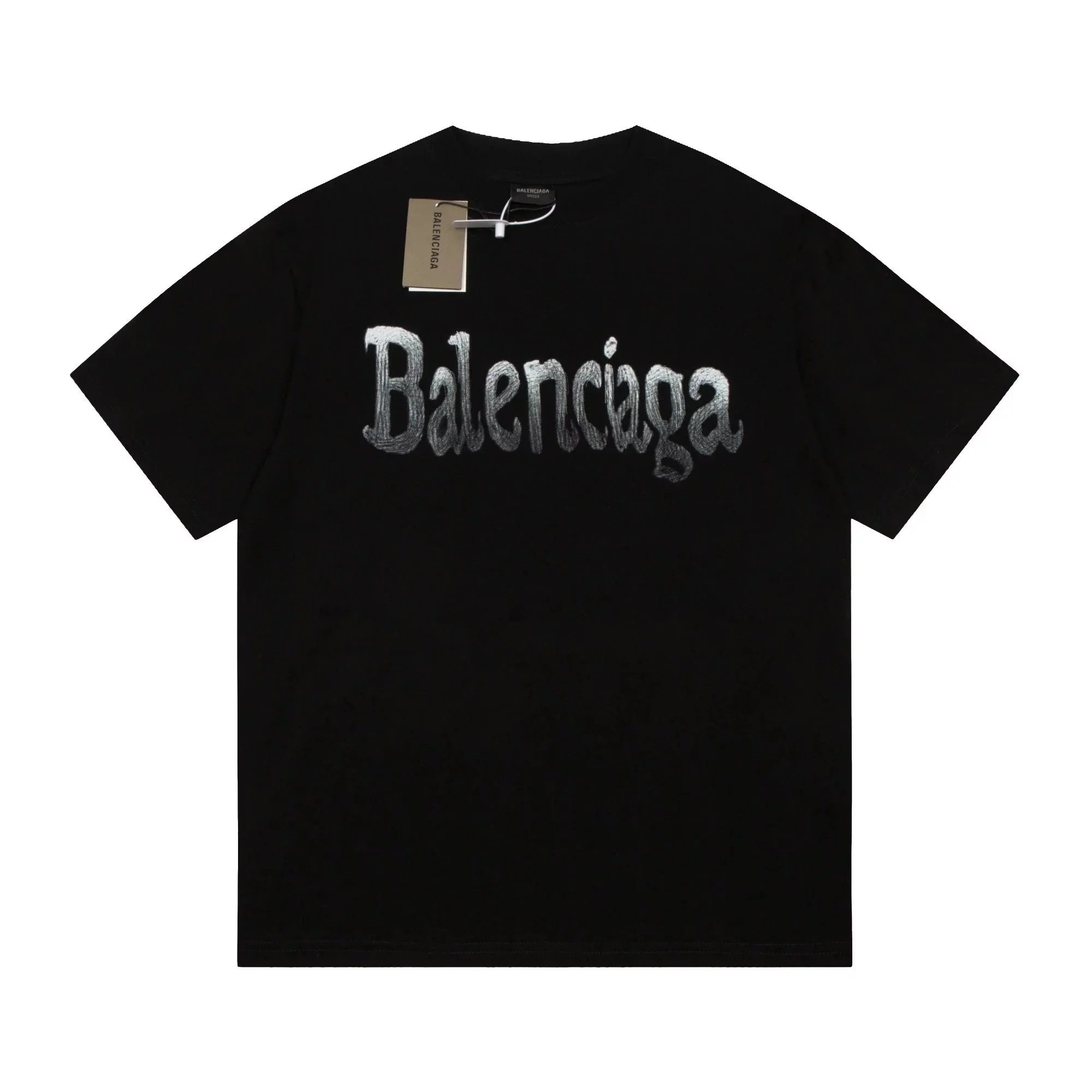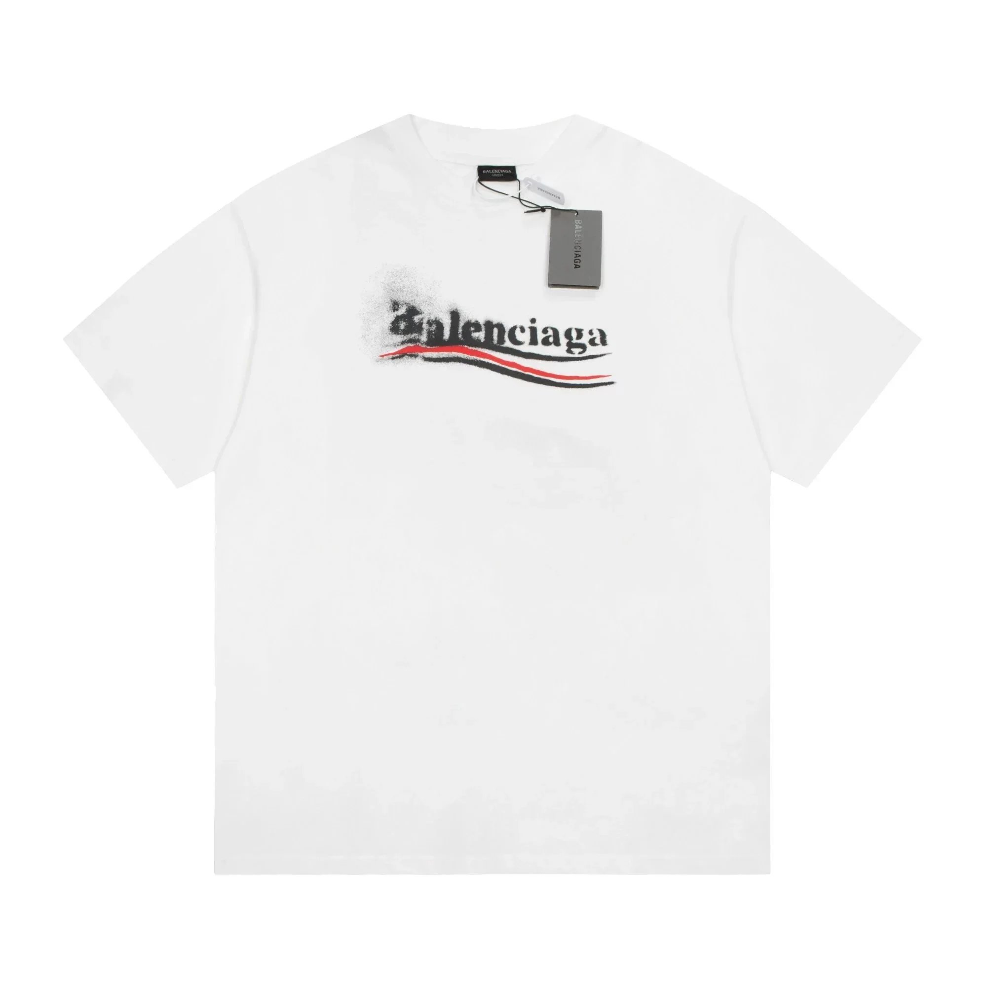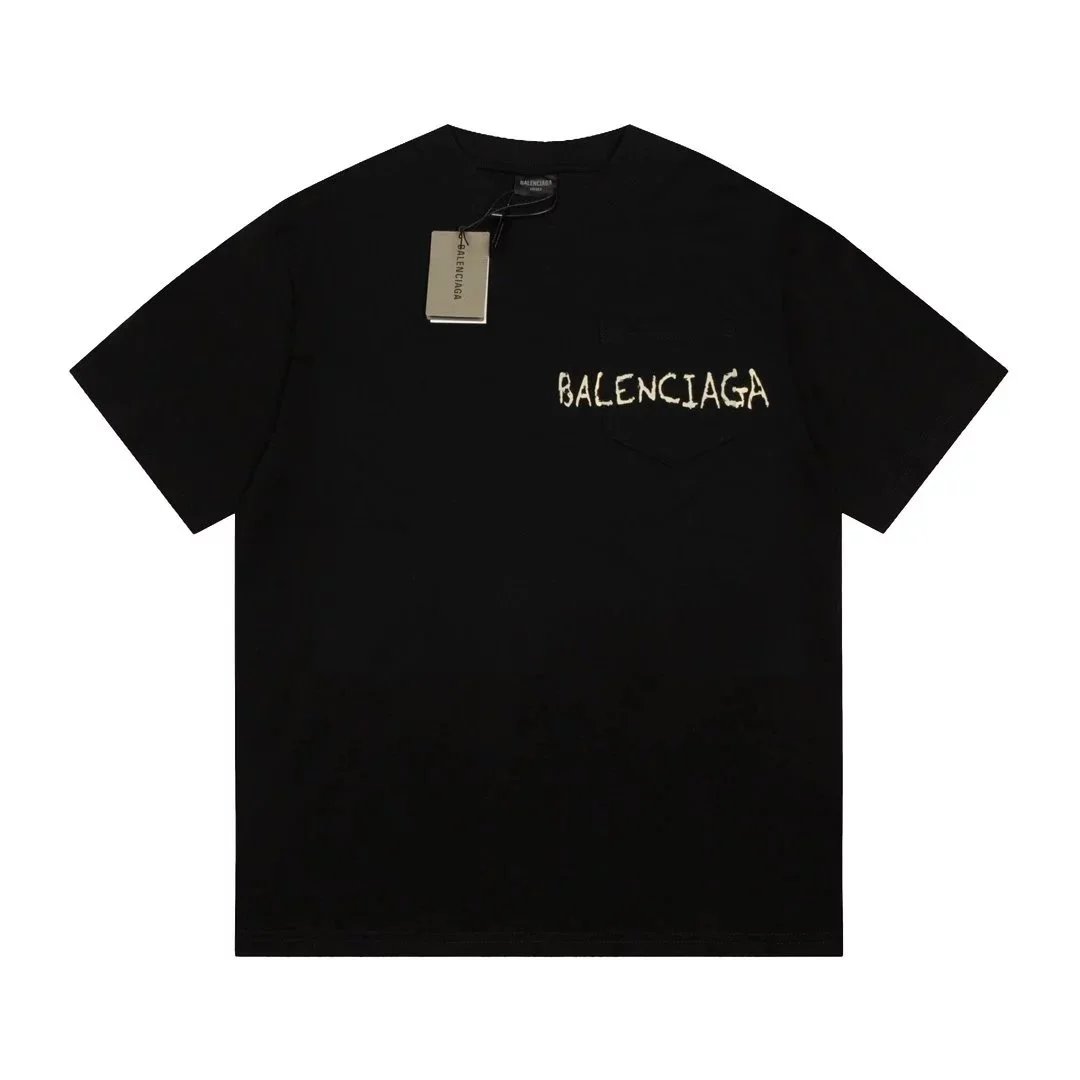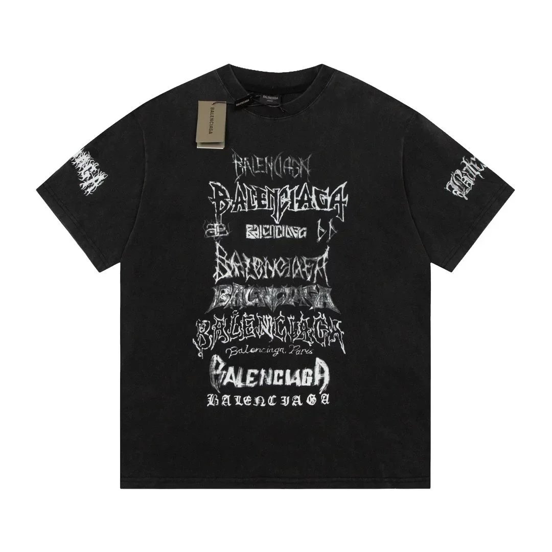 Black Balenciaga t-shirt featuring a bold white logo with red and green wave accents. Designed for urban style enthusiasts seeking high-end streetwear.
