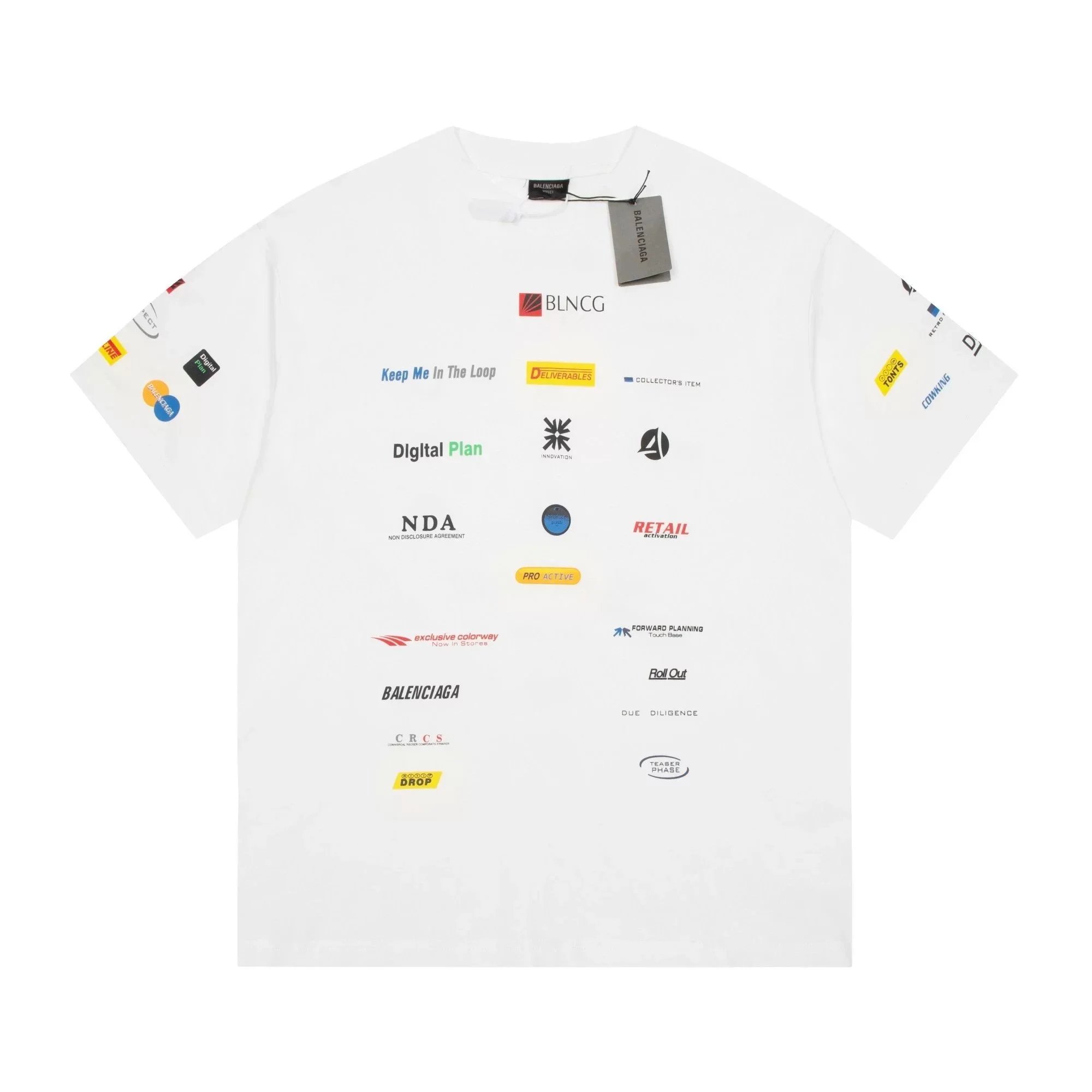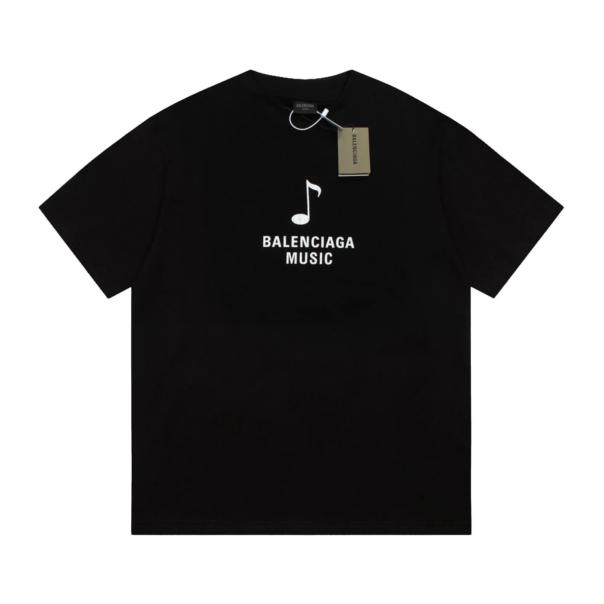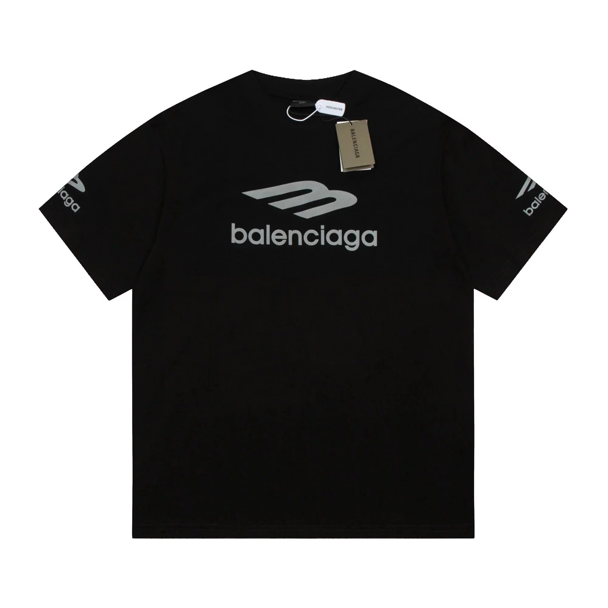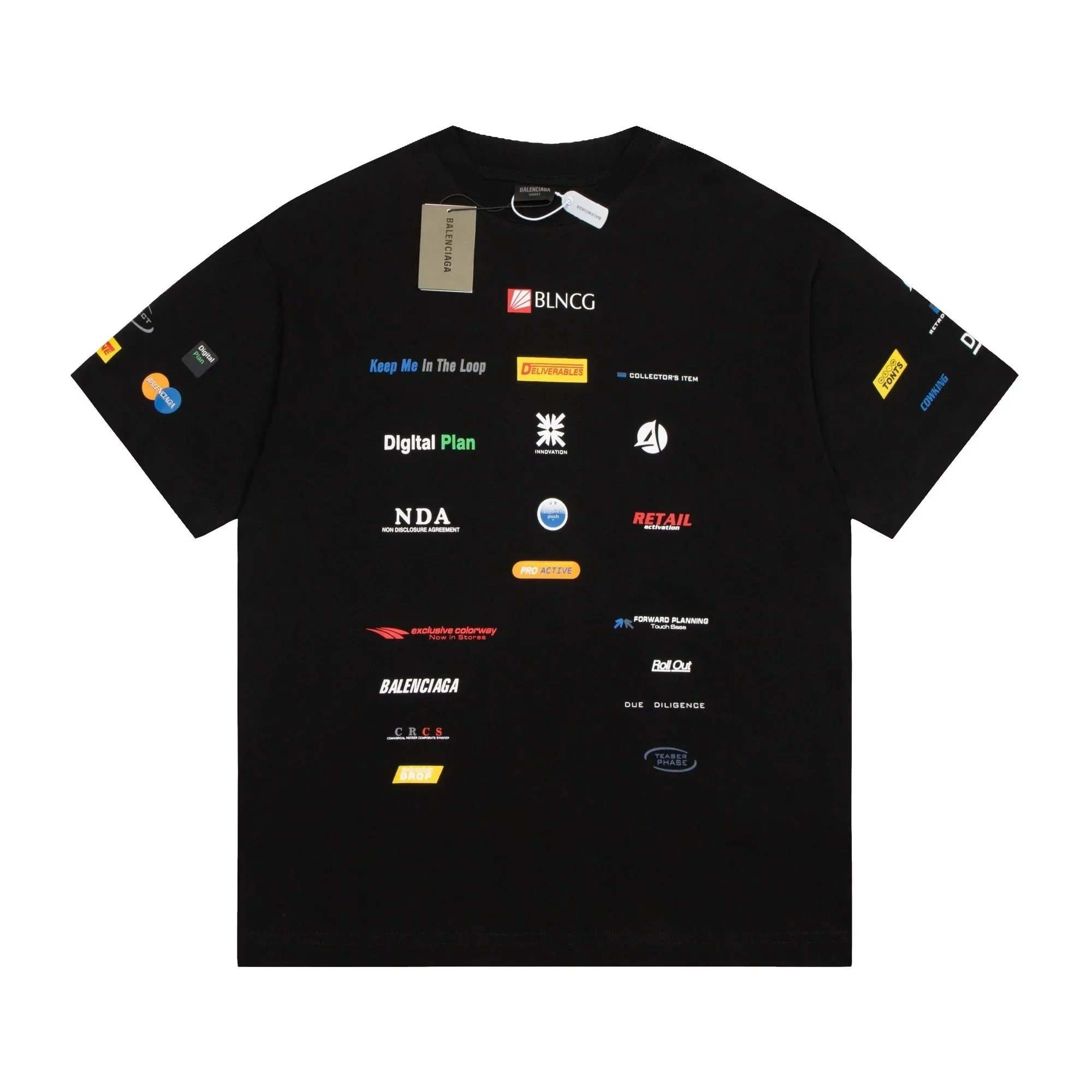 Black Balenciaga t-shirt featuring a bold white logo with red and green wave accents. Designed for urban style enthusiasts seeking high-end streetwear.
