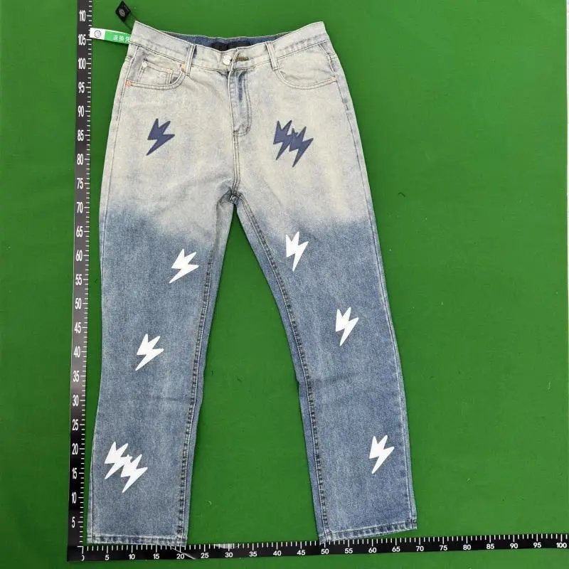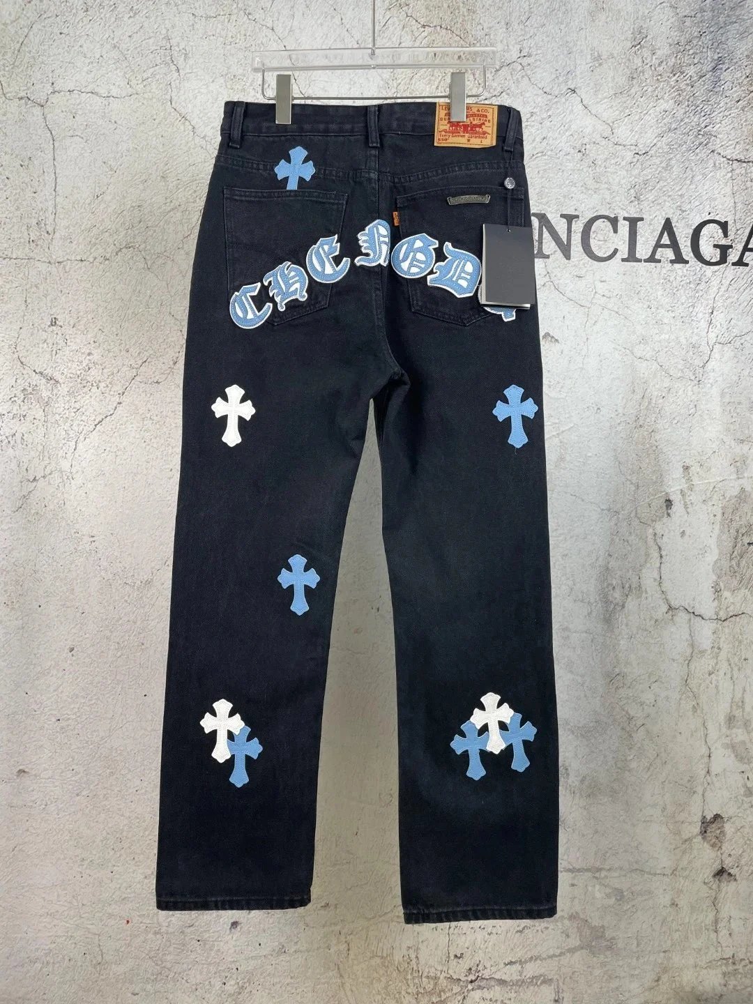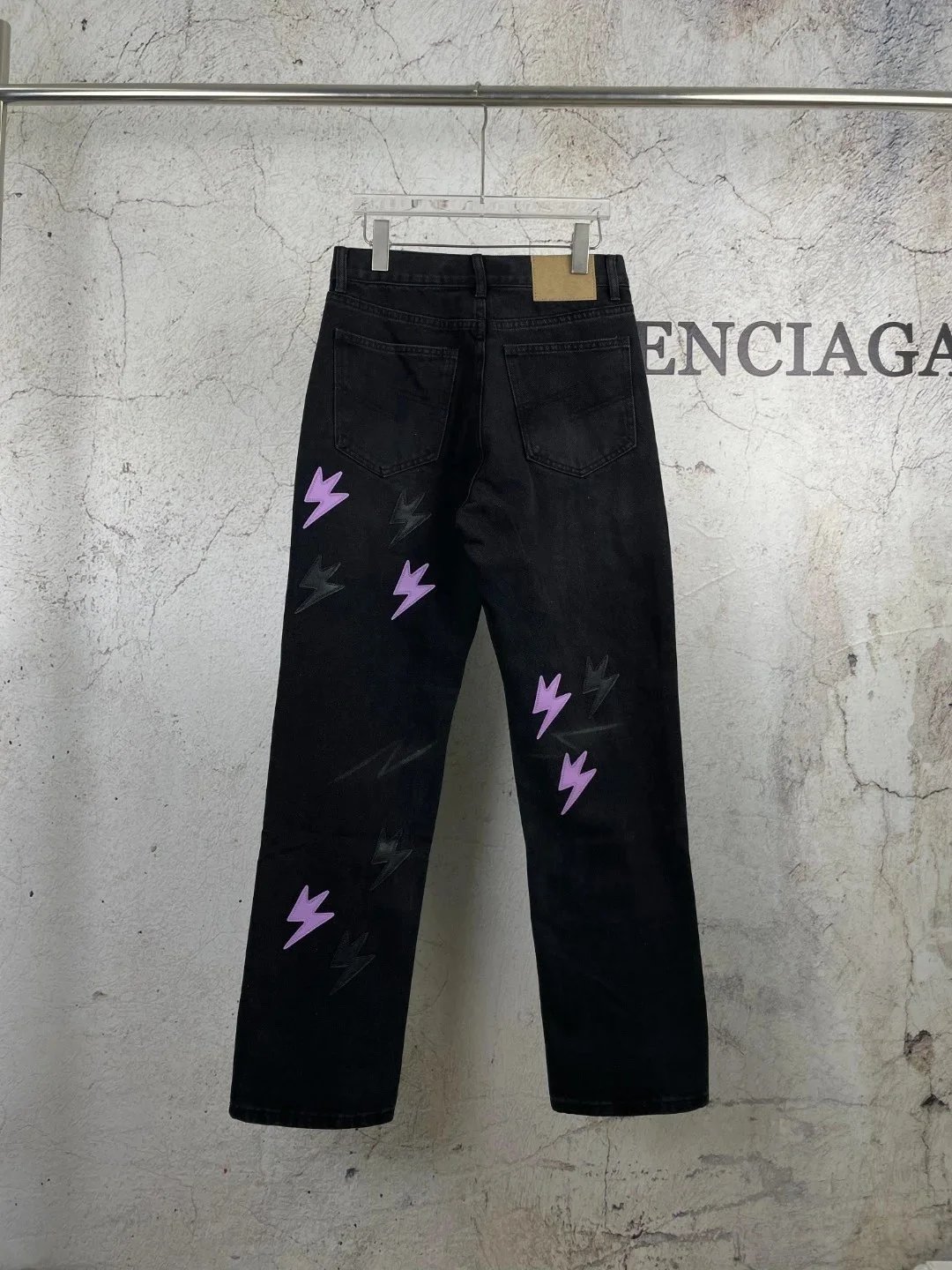 Bold Balenciaga jeans featuring vibrant cross and skull embroidery in pink, red, and white. A high-fashion statement piece with distinctive detailing.