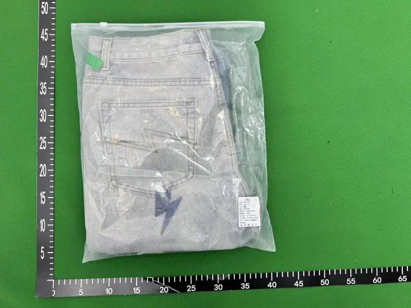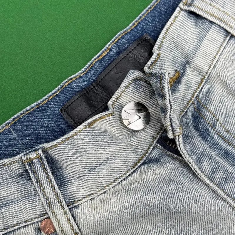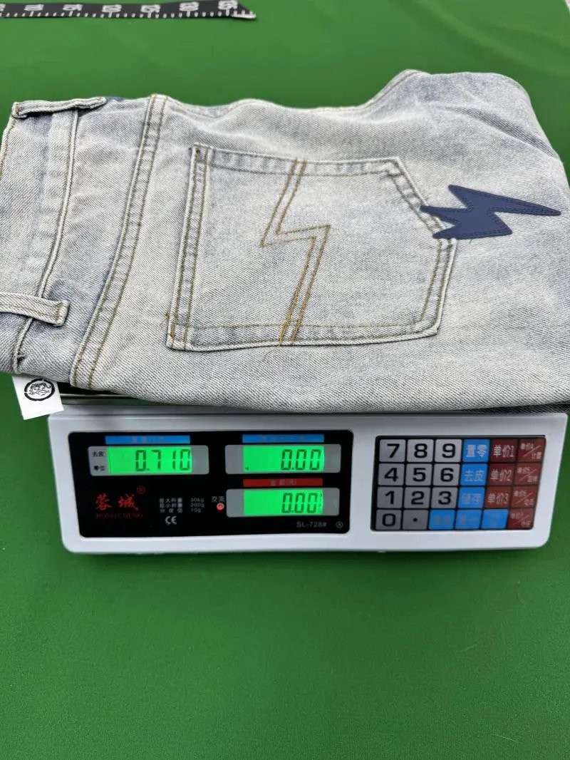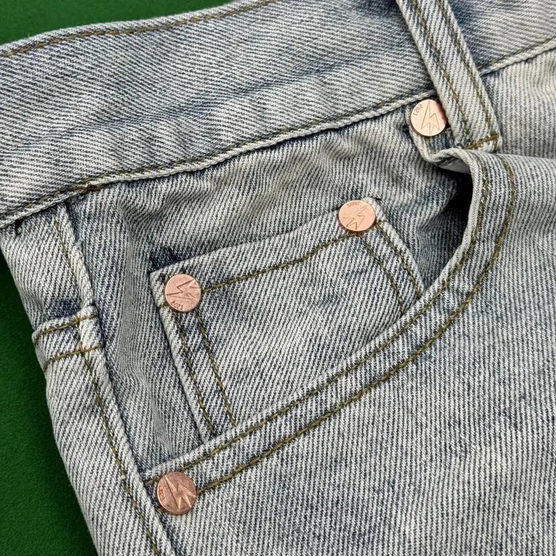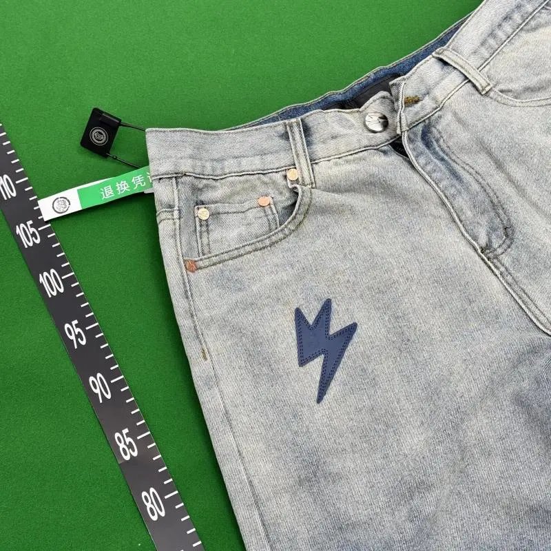 Bold Balenciaga jeans featuring vibrant cross and skull embroidery in pink, red, and white. A high-fashion statement piece with distinctive detailing.