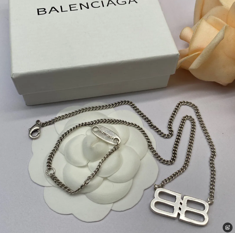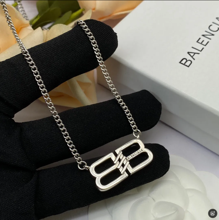 Stylish Balenciaga silver chain necklace featuring the iconic double B logo pendant. A statement piece for modern fashion lovers.