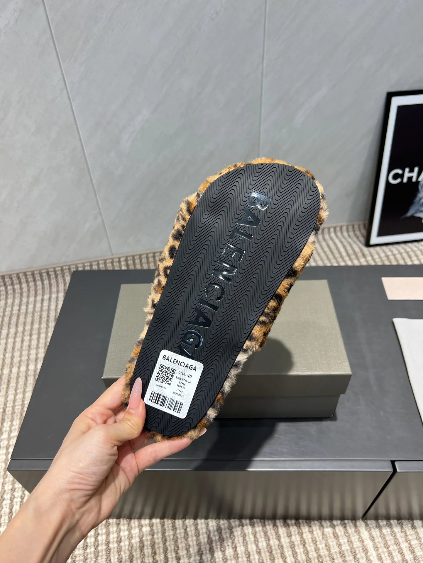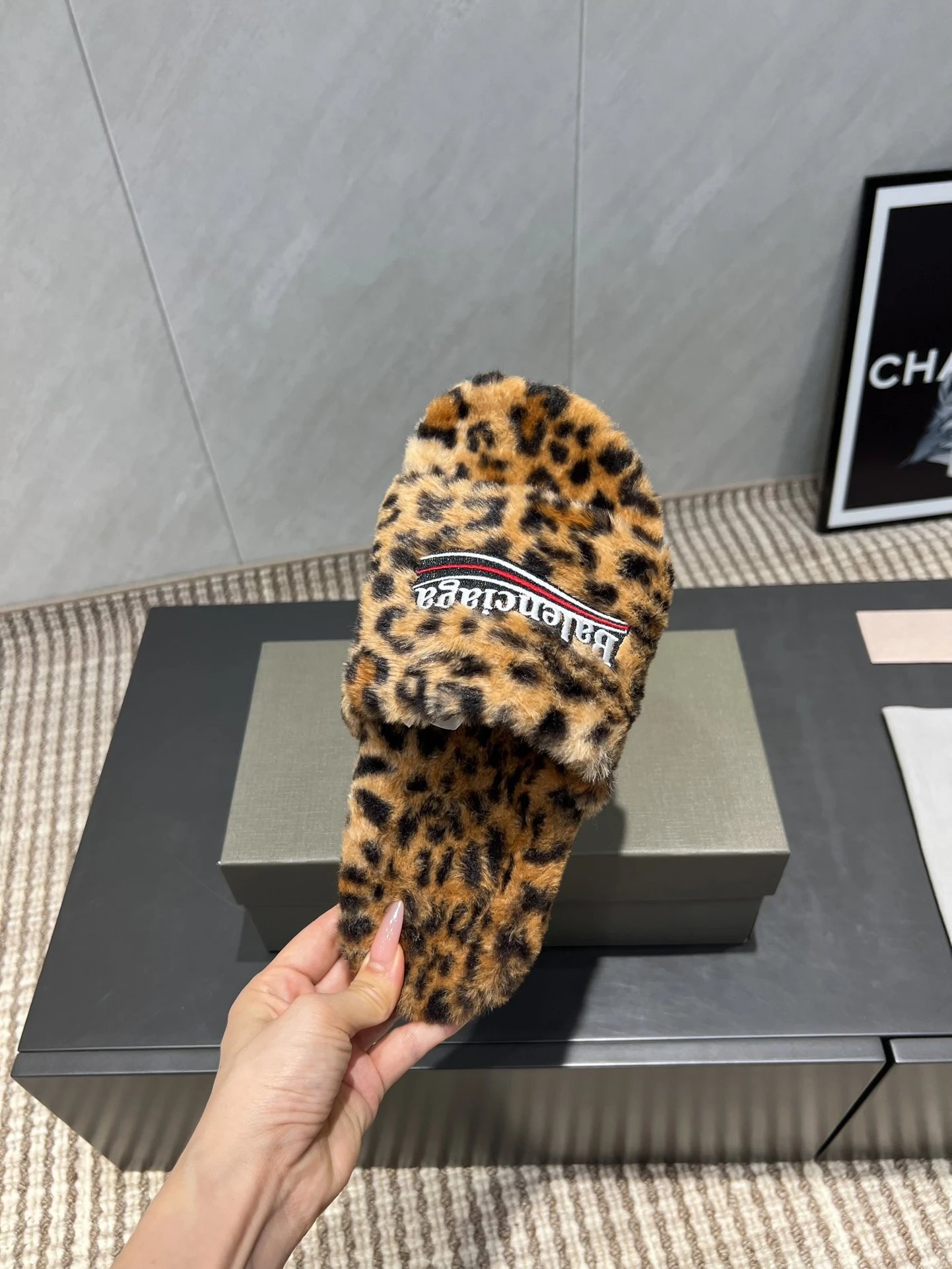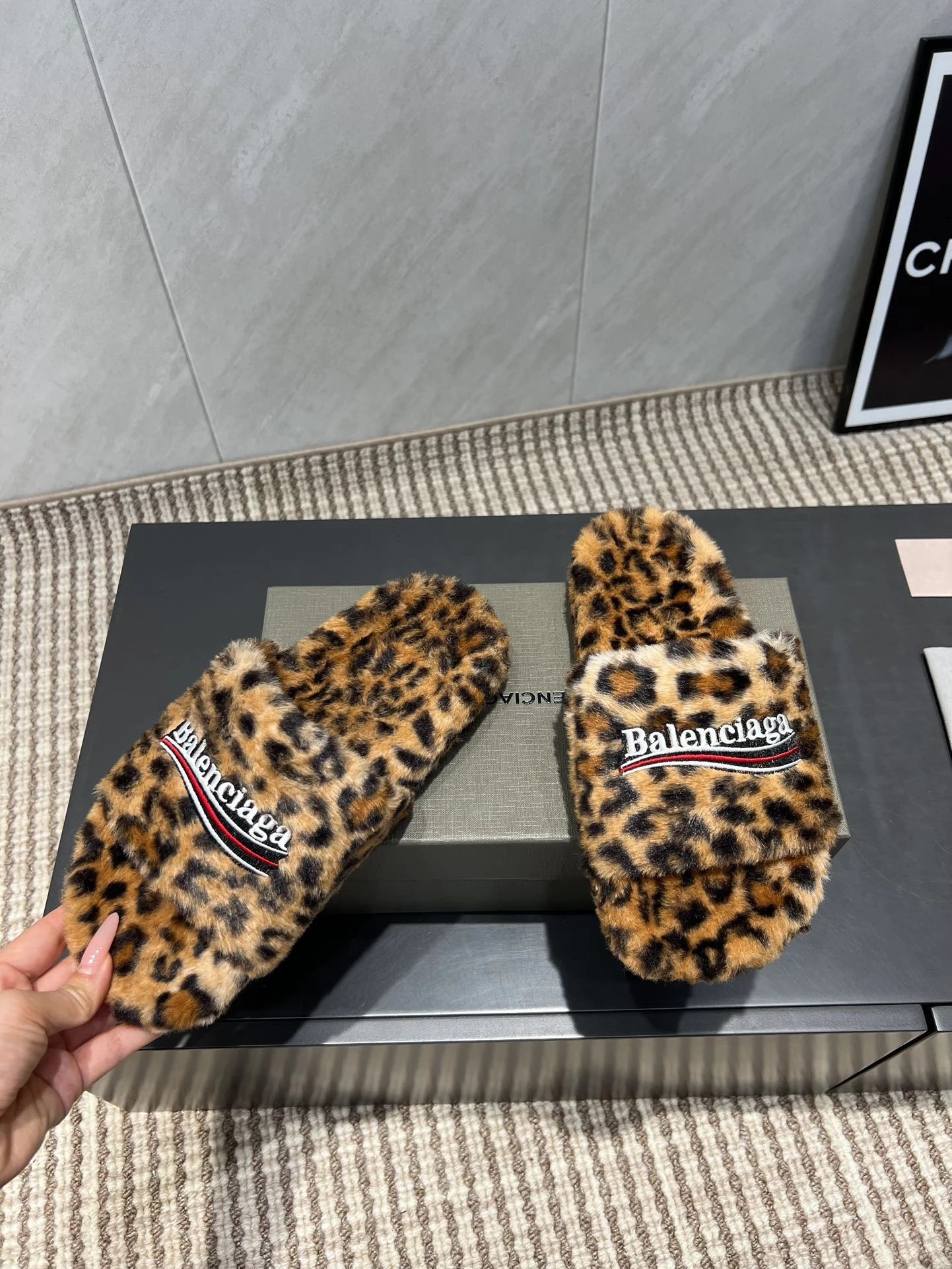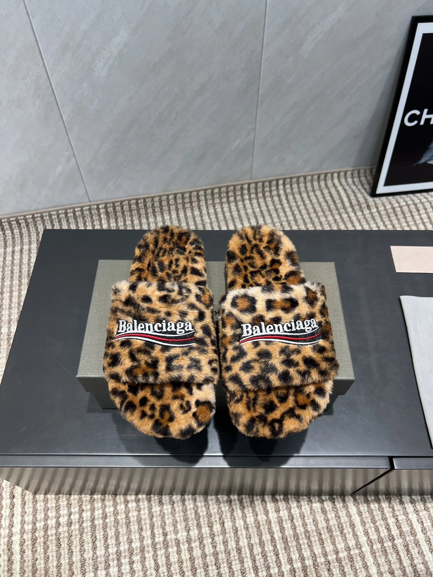 Luxurious leopard-print faux fur slides by Balenciaga, featuring a plush design and signature logo stripe for bold, comfortable style.