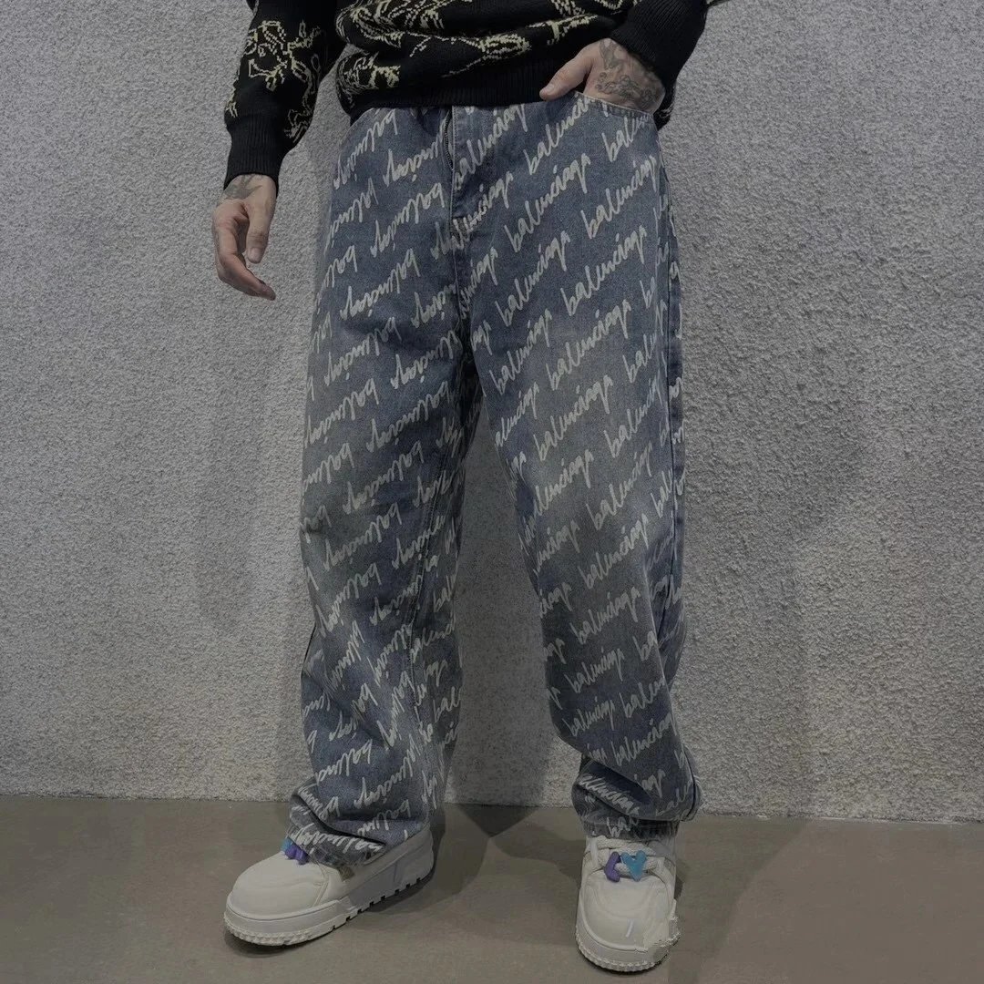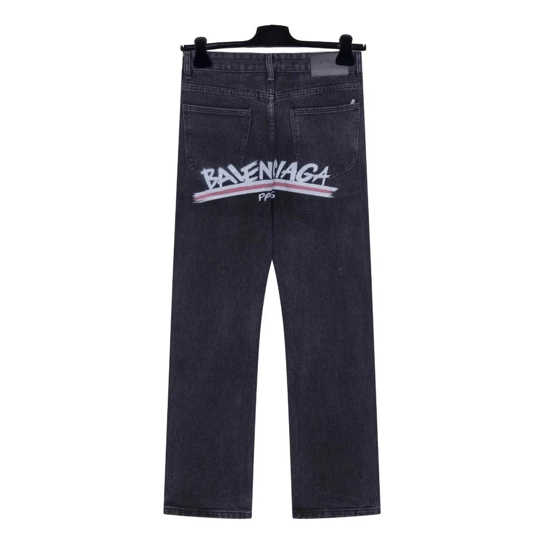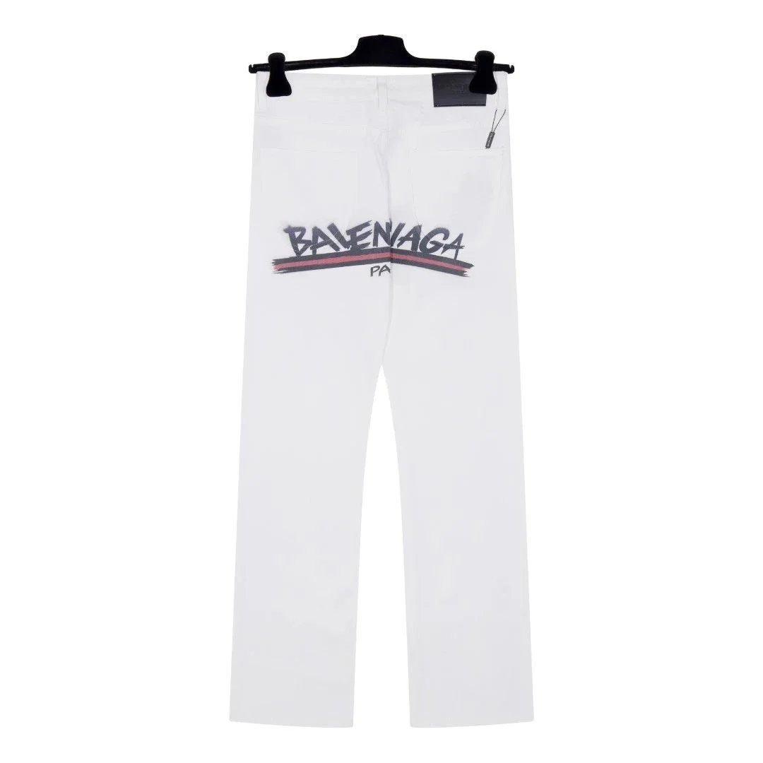 Stylish Balenciaga logo jeans available in black, white, and light blue washes. Featuring bold branding and premium denim quality for a statement look.