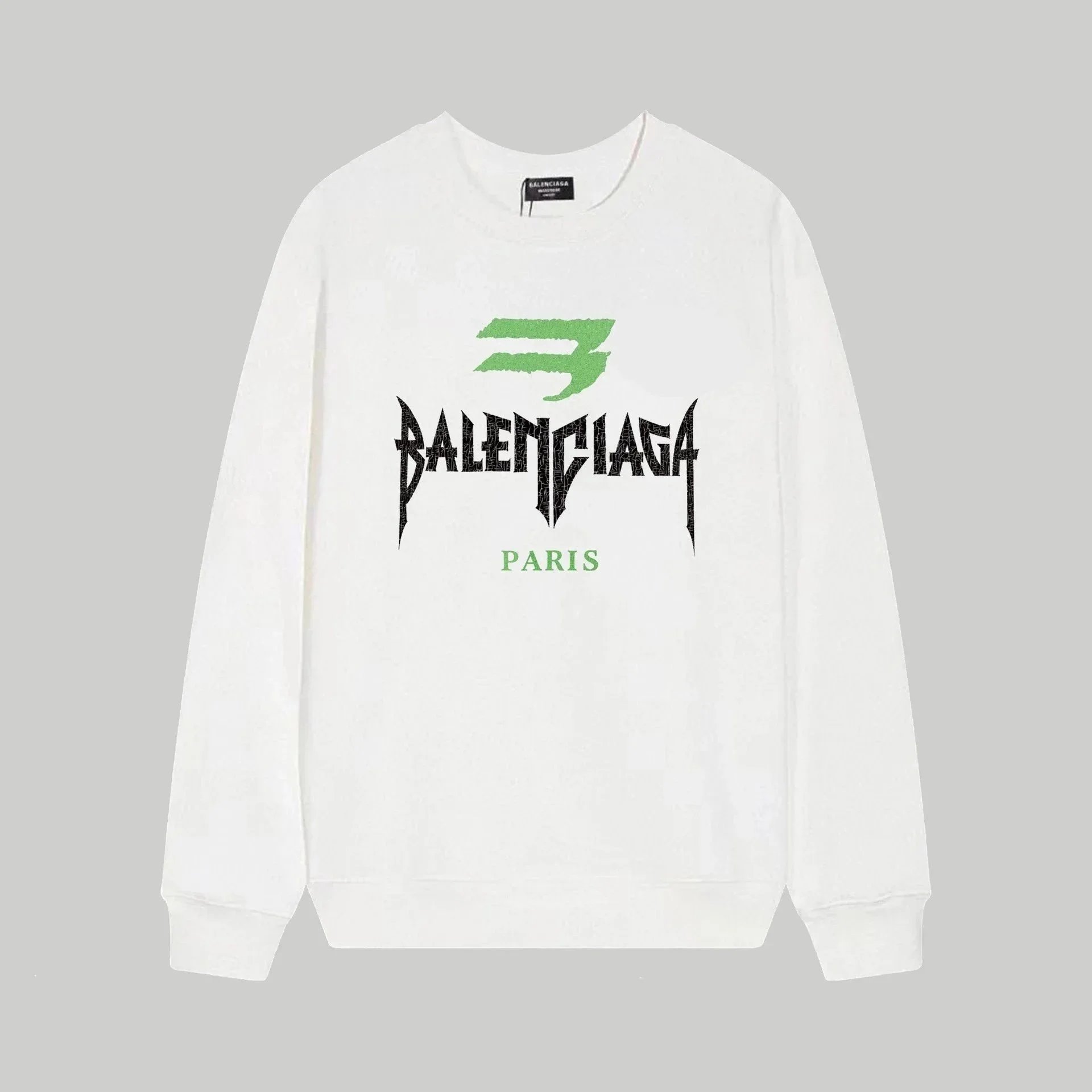 Bold Balenciaga logo sweatshirts in black and white with green accents. Premium streetwear design for modern fashion enthusiasts.