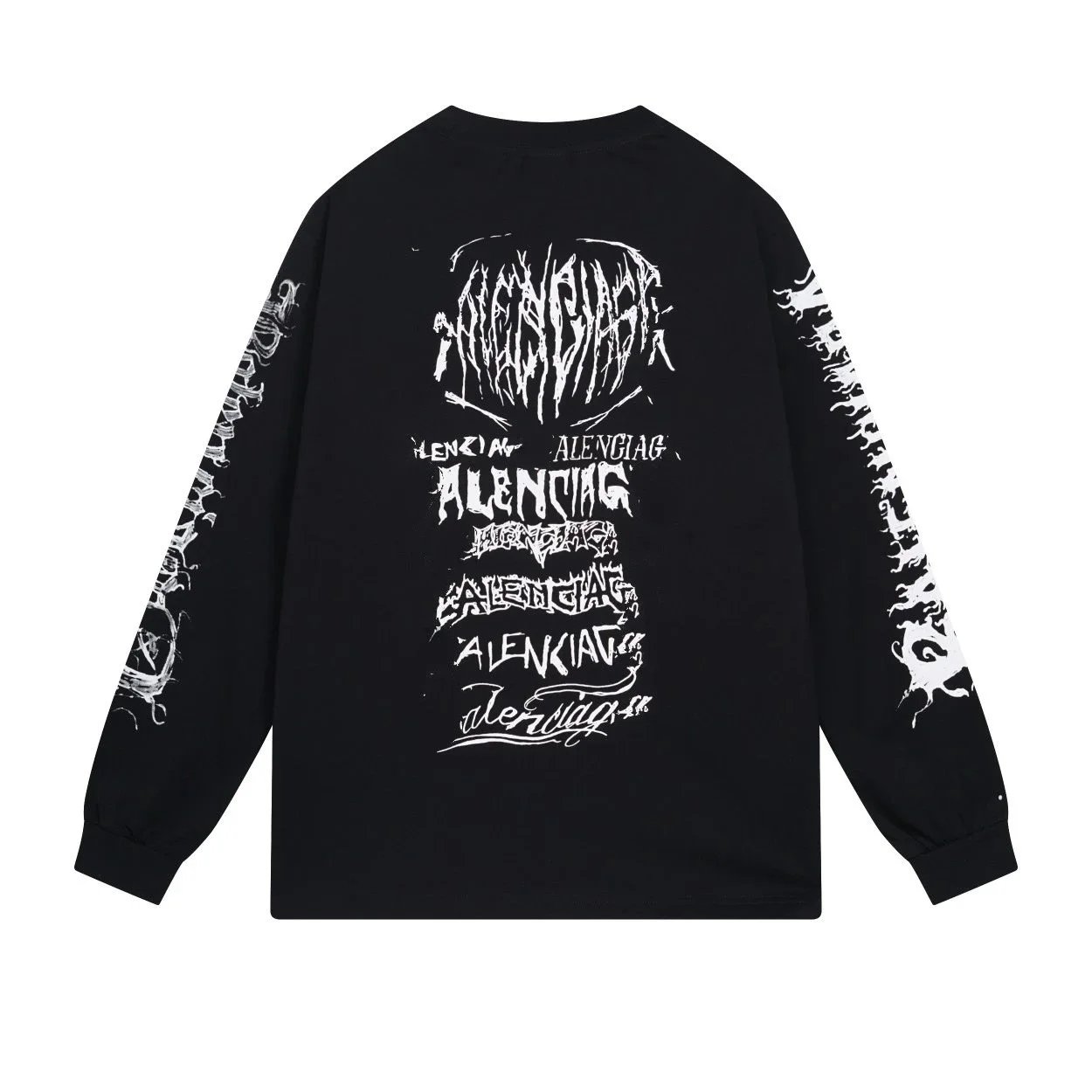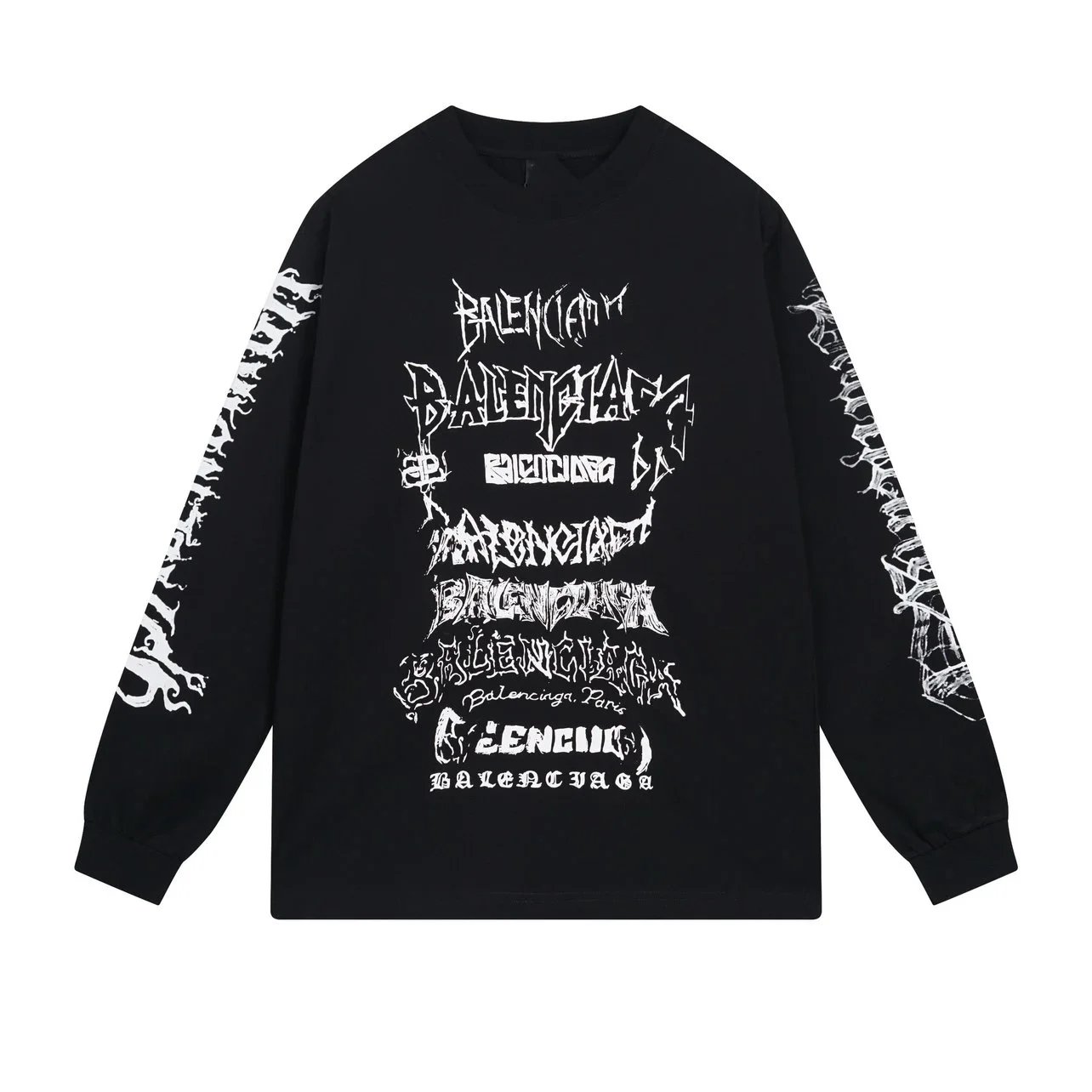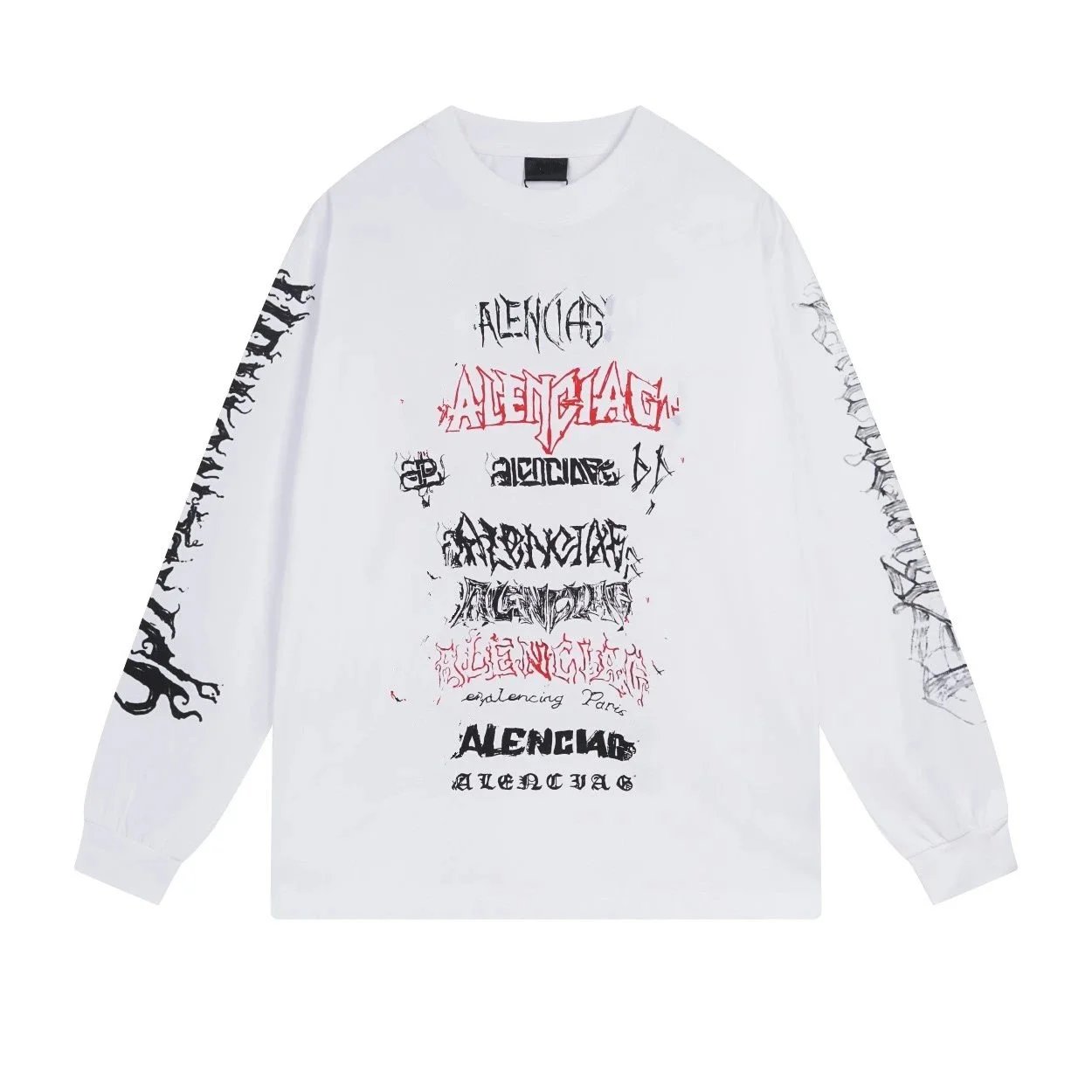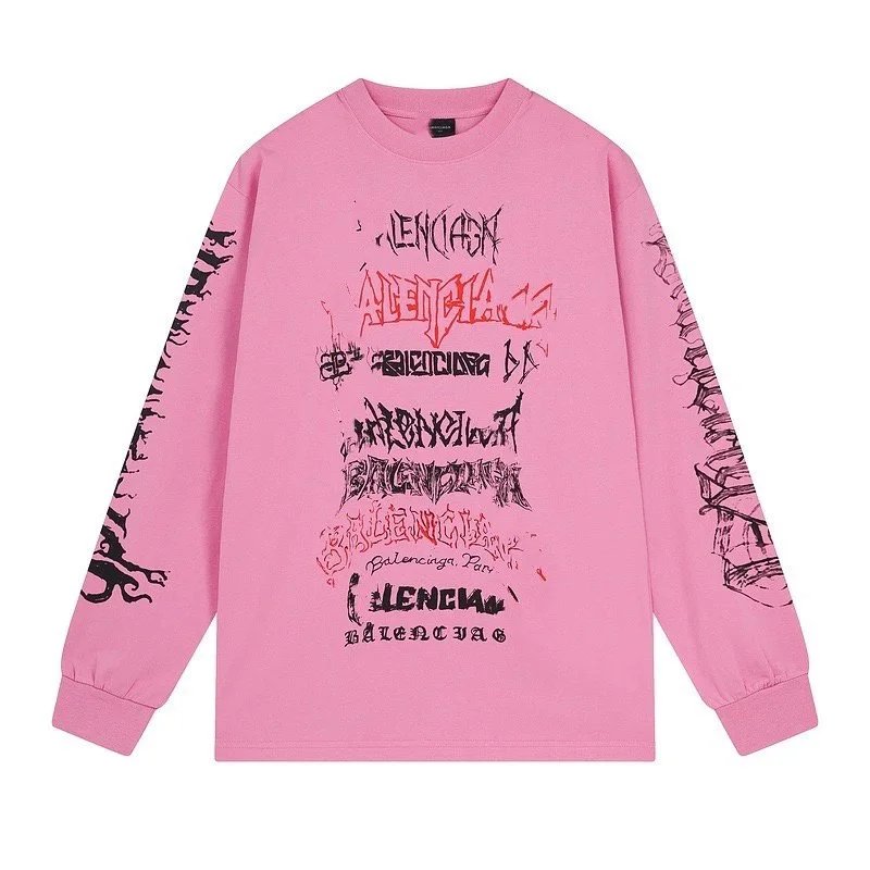 Bold Balenciaga long sleeve tees featuring edgy graffiti-style logos in white, pink, and black. Perfect for high-impact streetwear looks.