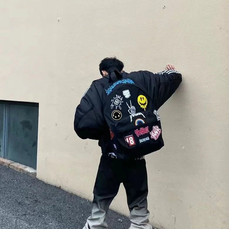 Stylish Balenciaga black backpack featuring bold patches including the iconic Balenciaga logo, alien, Eiffel Tower, and anti-racism slogans. Perfect for urban fashion enthusiasts.