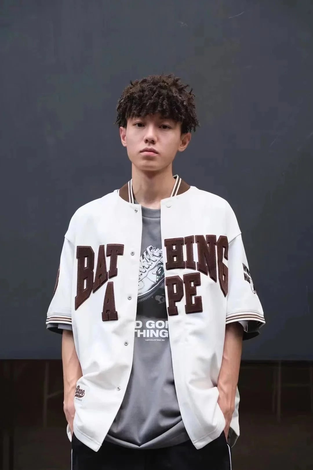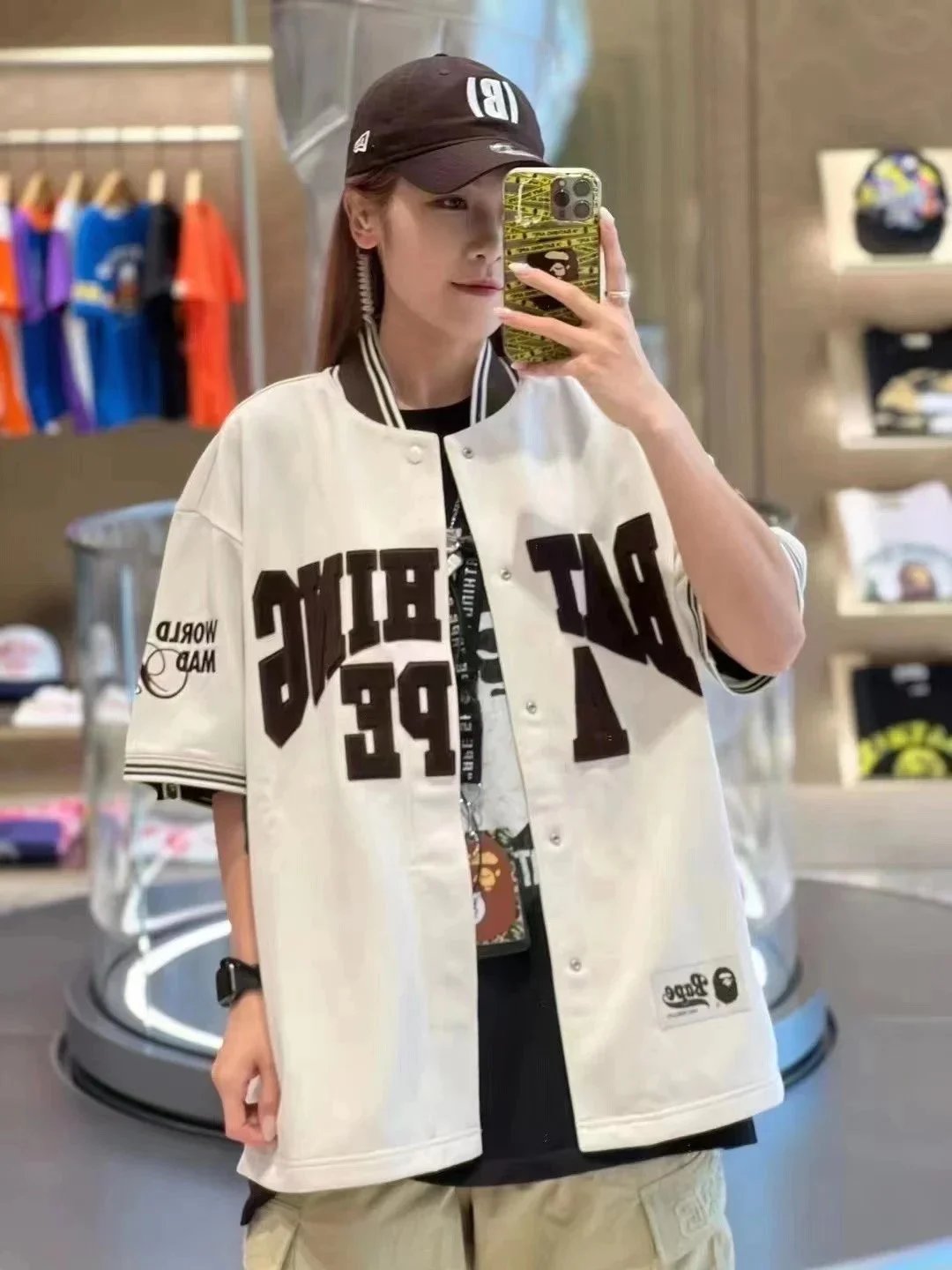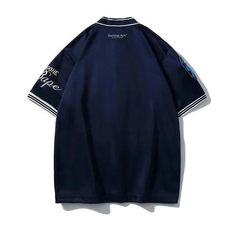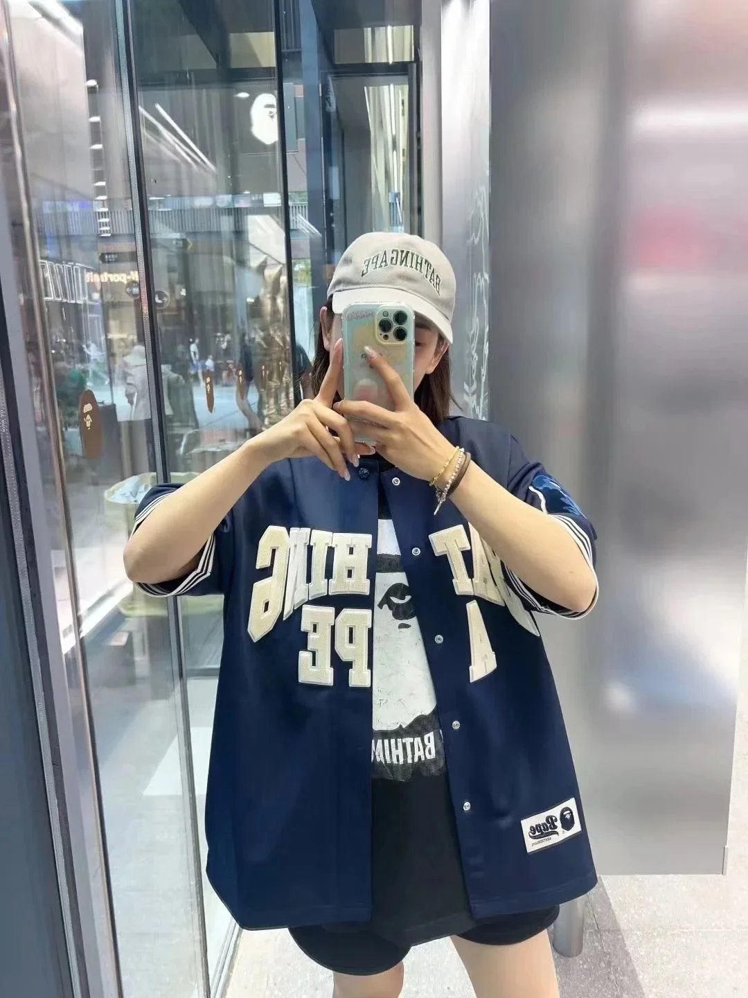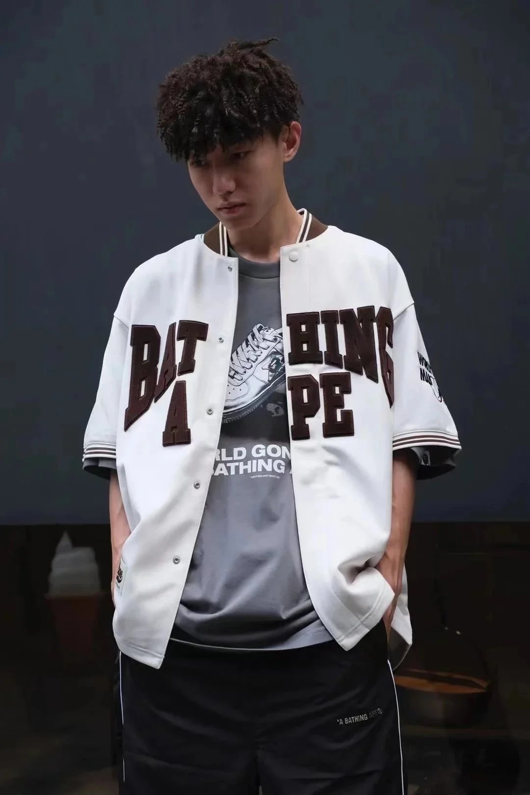 Men's BAPE baseball jackets in navy and white, featuring bold lettering, Ape Head logos, and classic varsity styling. Ideal for streetwear enthusiasts seeking iconic urban apparel.