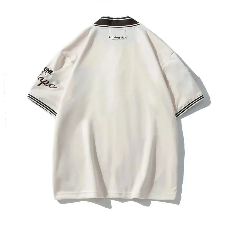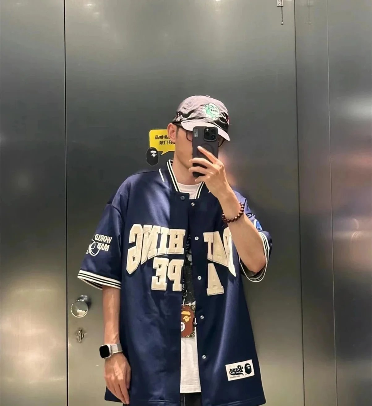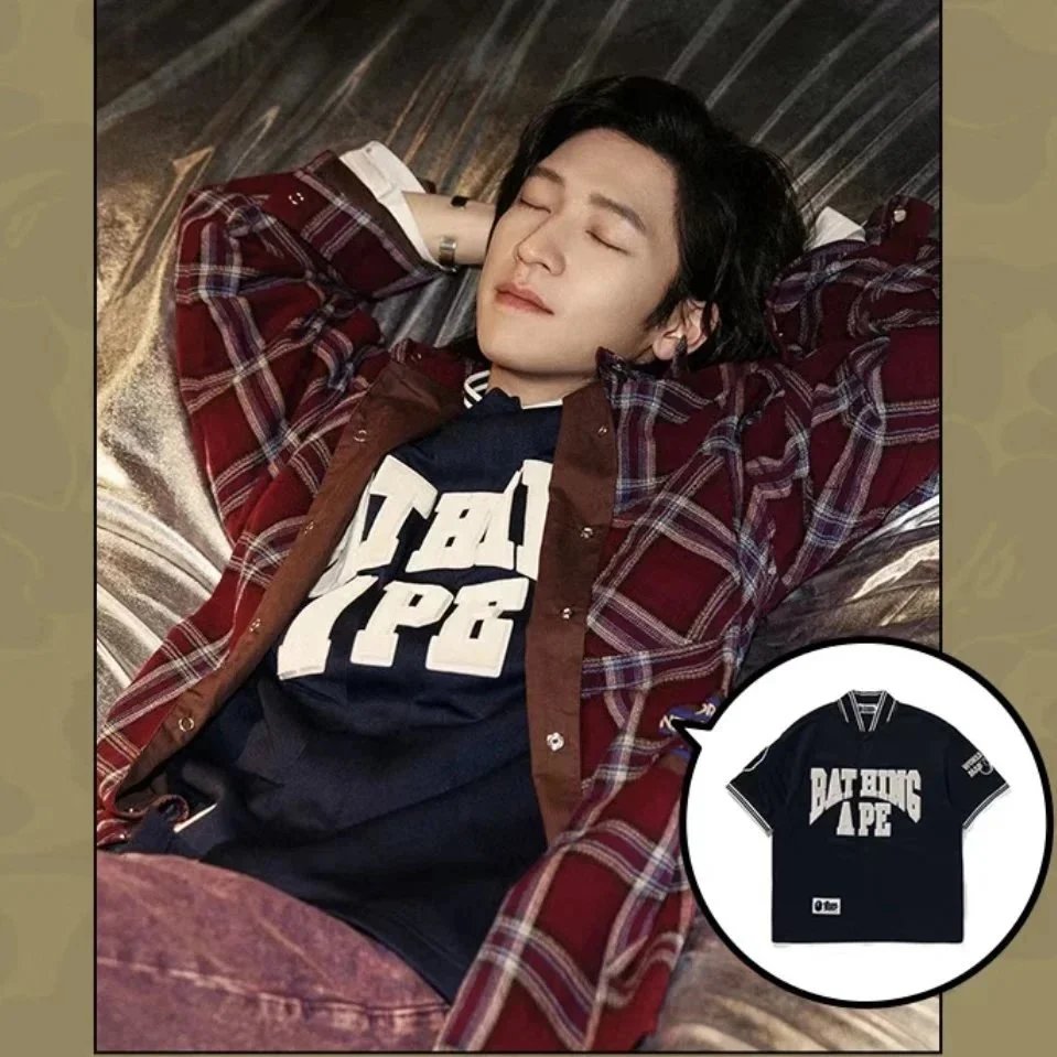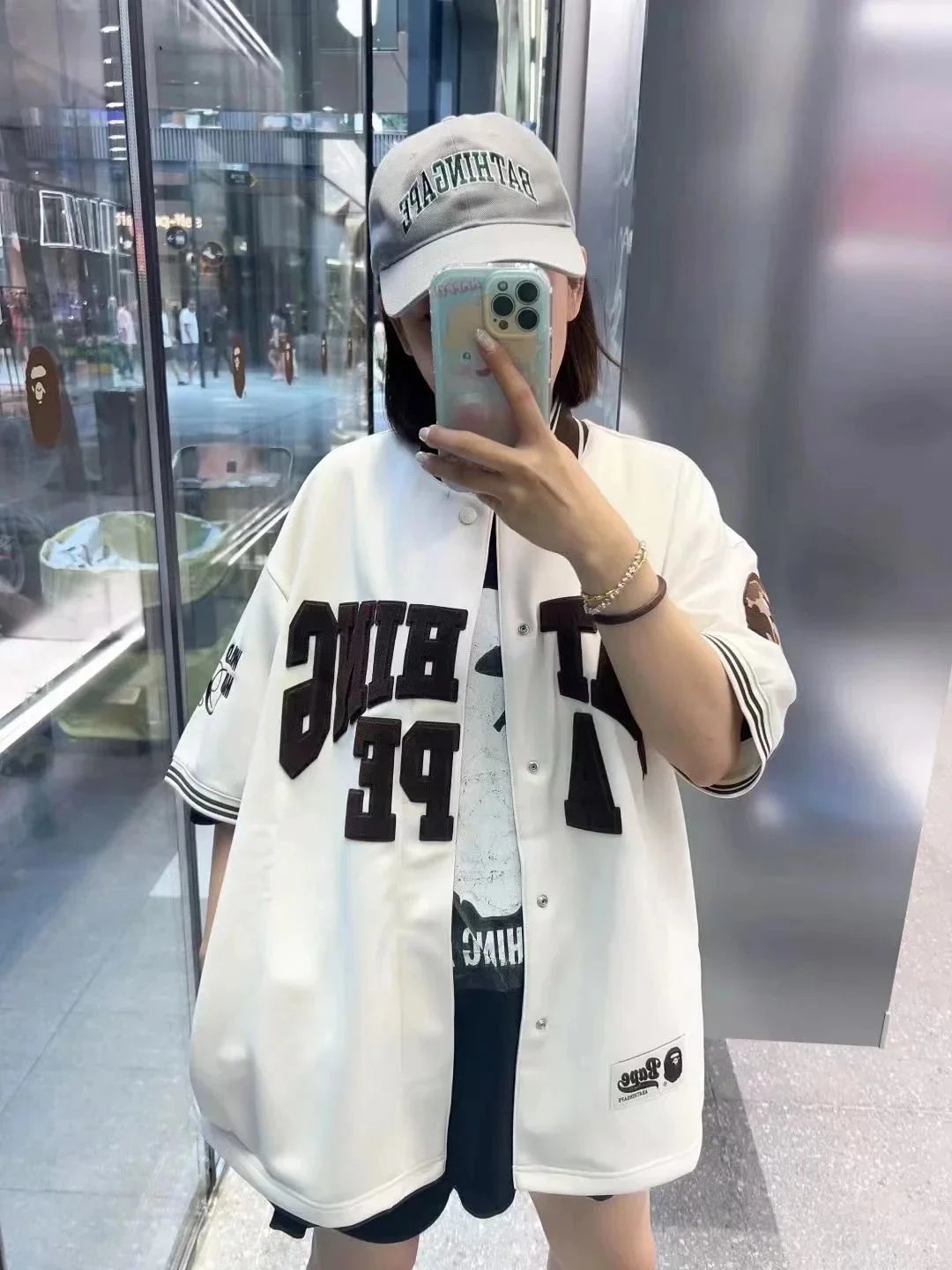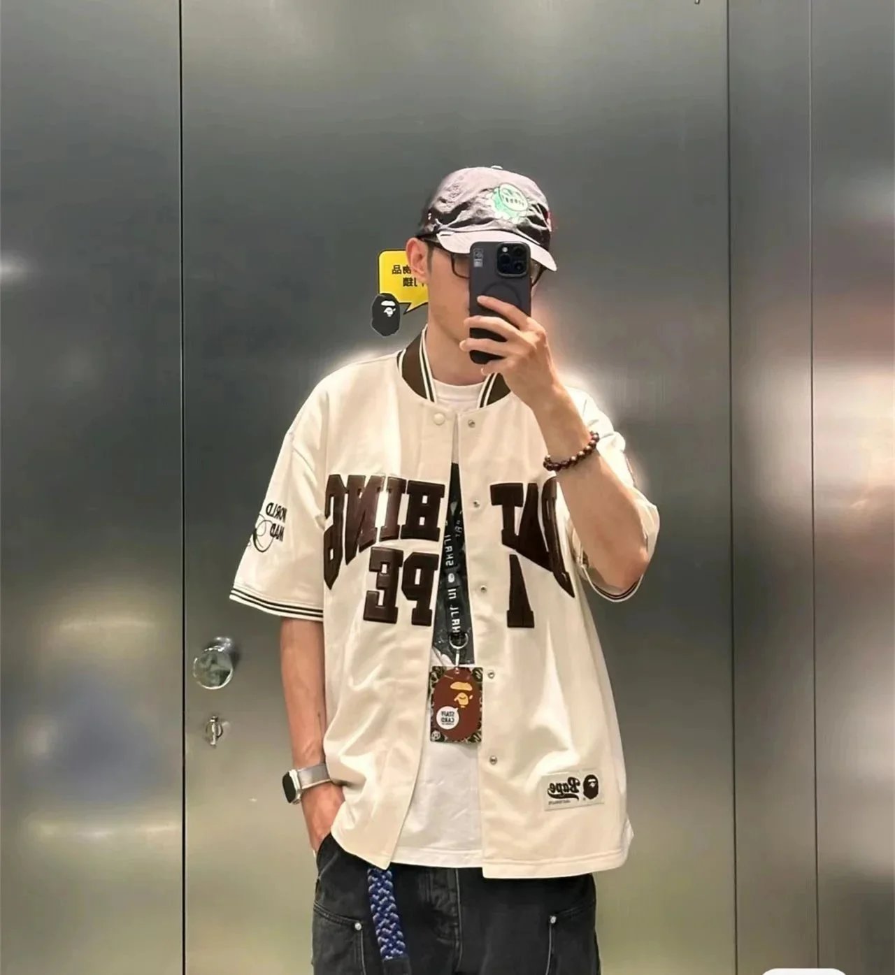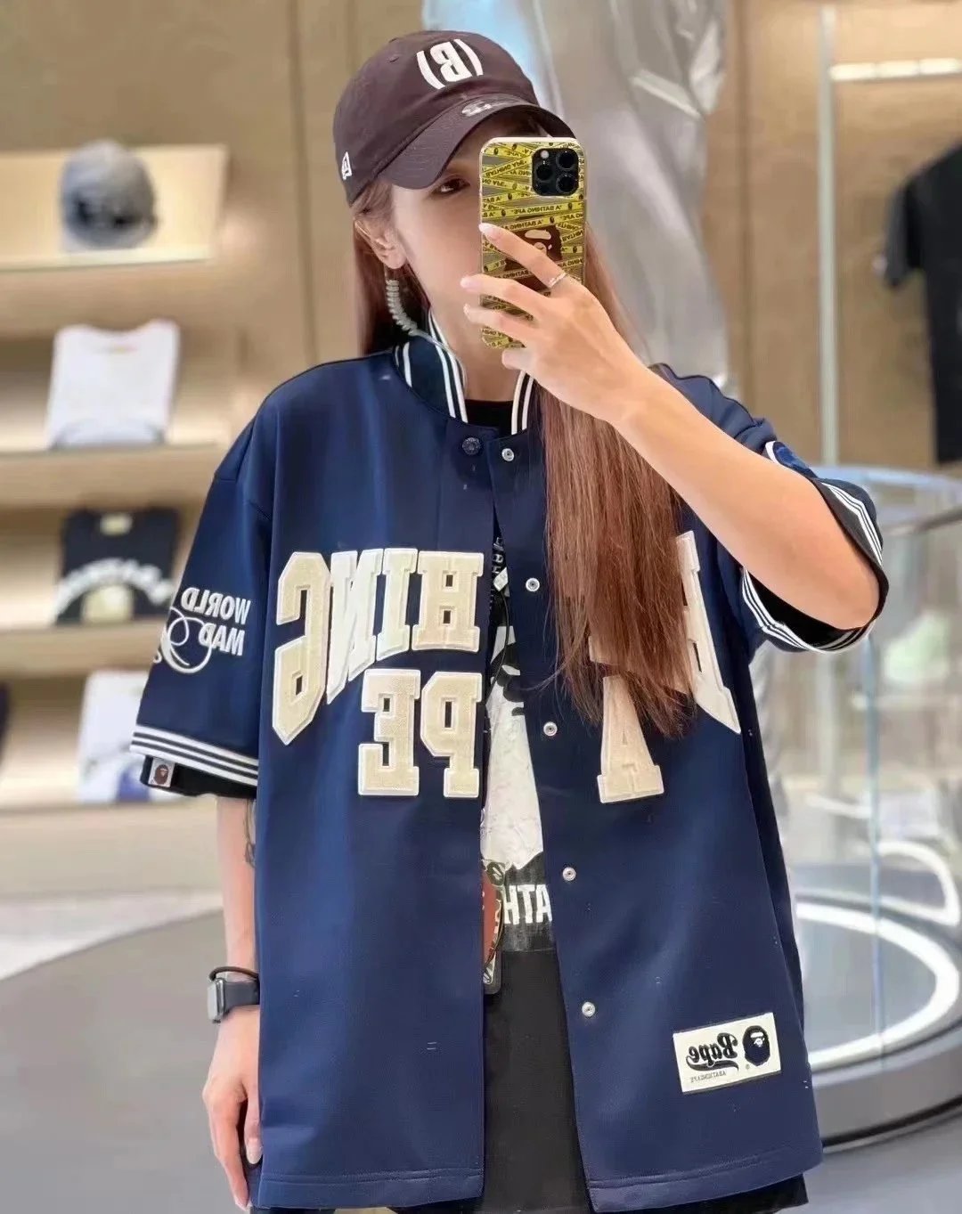 Men's BAPE baseball jackets in navy and white, featuring bold lettering, Ape Head logos, and classic varsity styling. Ideal for streetwear enthusiasts seeking iconic urban apparel.