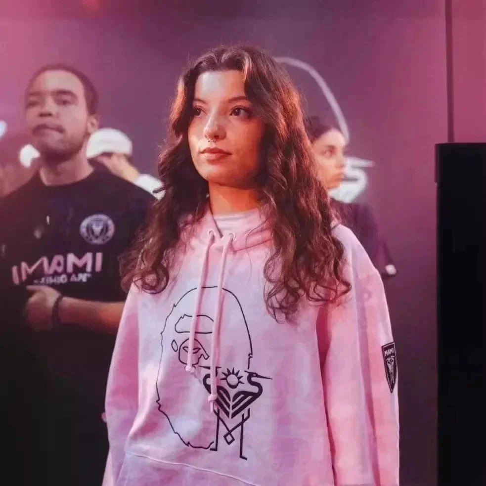 Limited edition BAPE Miami collaboration set featuring hoodies, t-shirts, and shorts in pink, black, and grey camo patterns with signature Ape Head and 'MIAMI' branding.