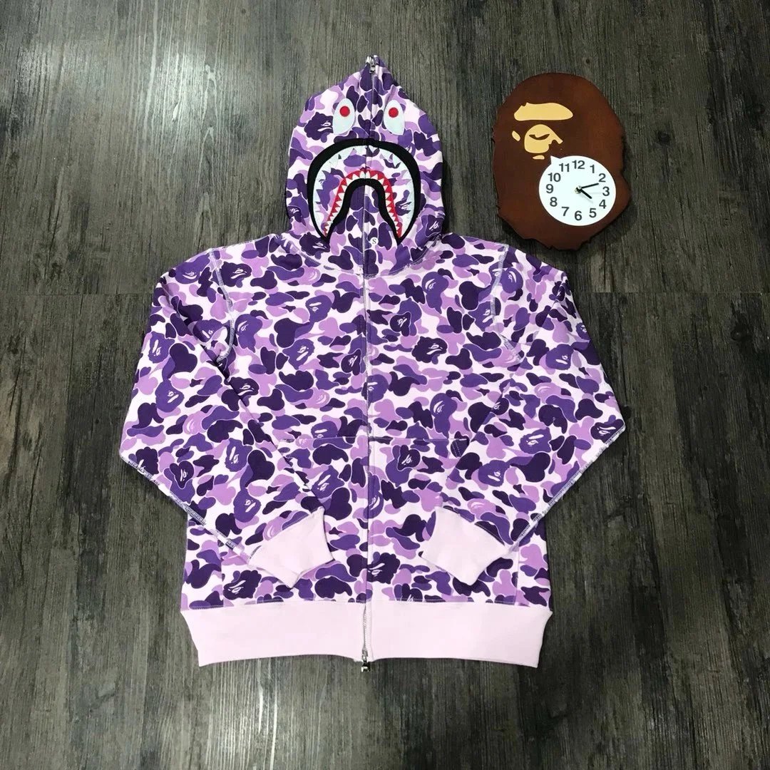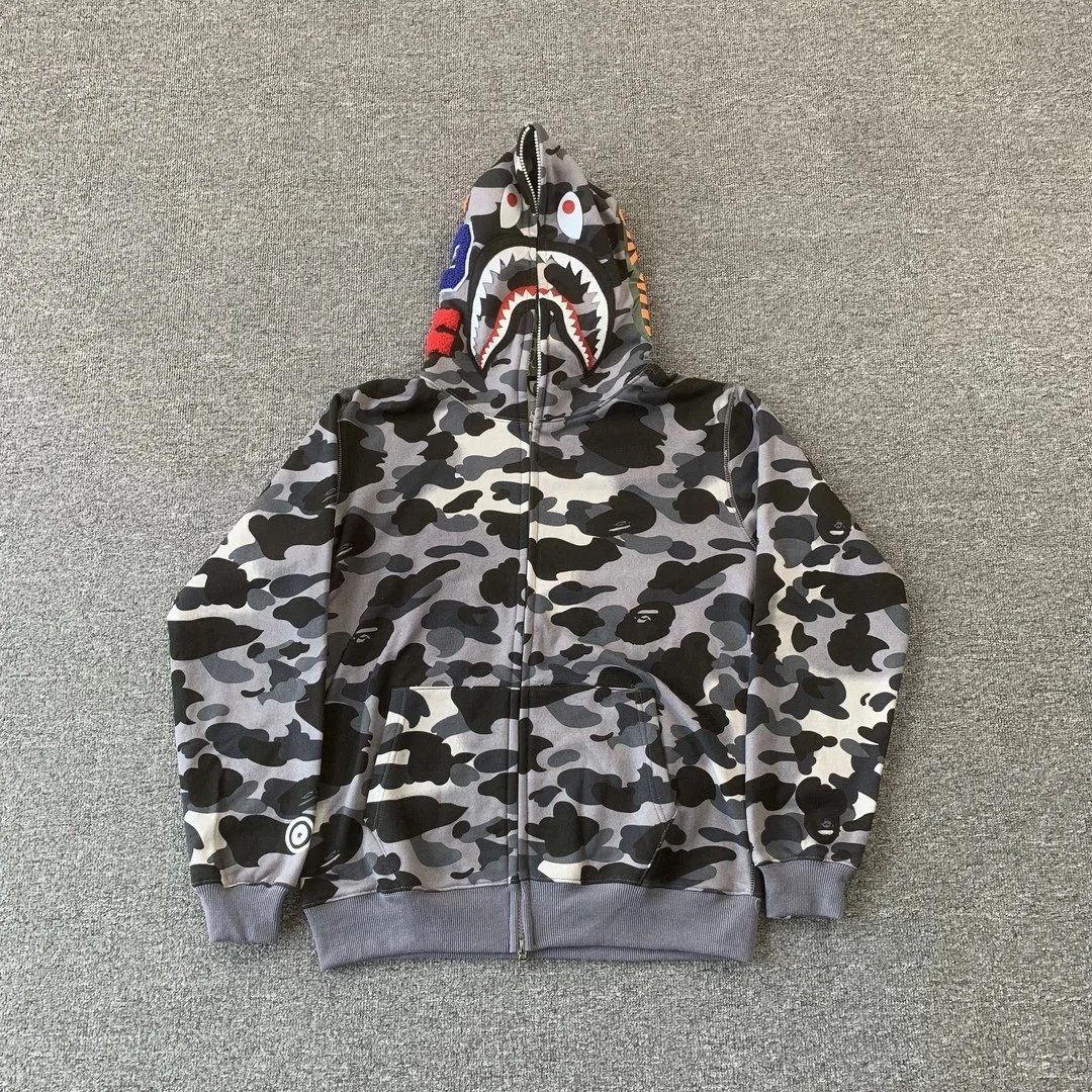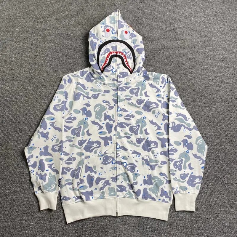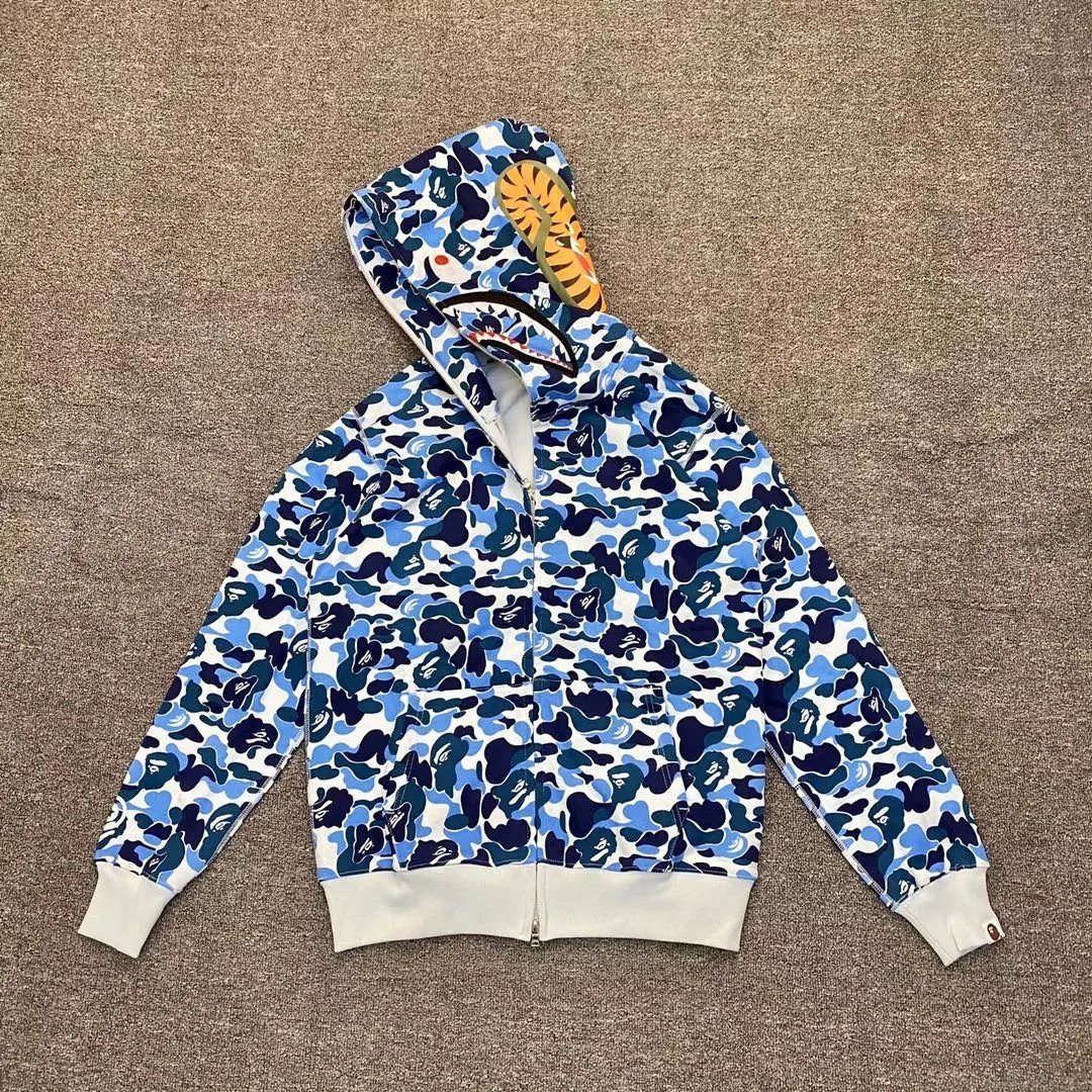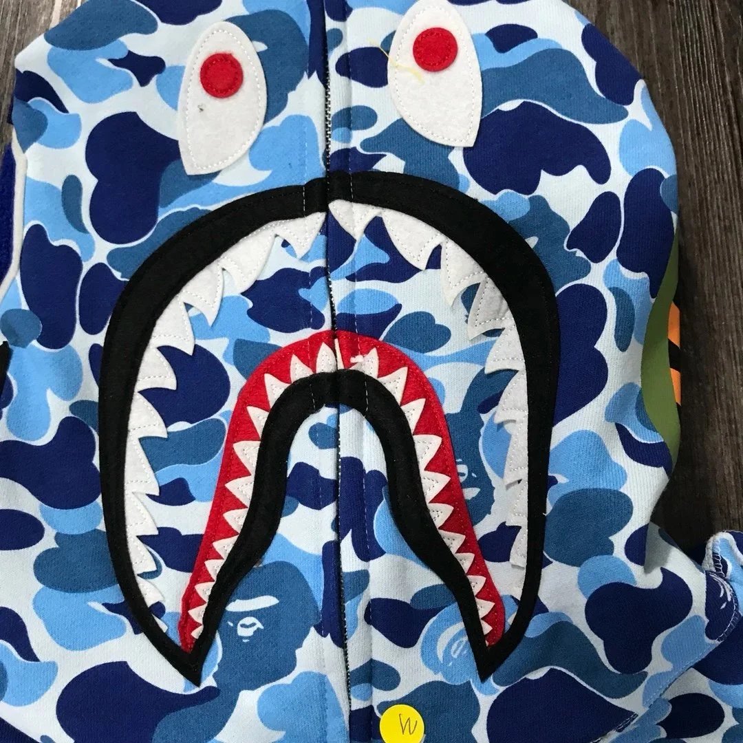 Authentic BAPE shark face zip-up hoodie in classic blue camouflage pattern. Iconic streetwear piece with bold graphic hood design.