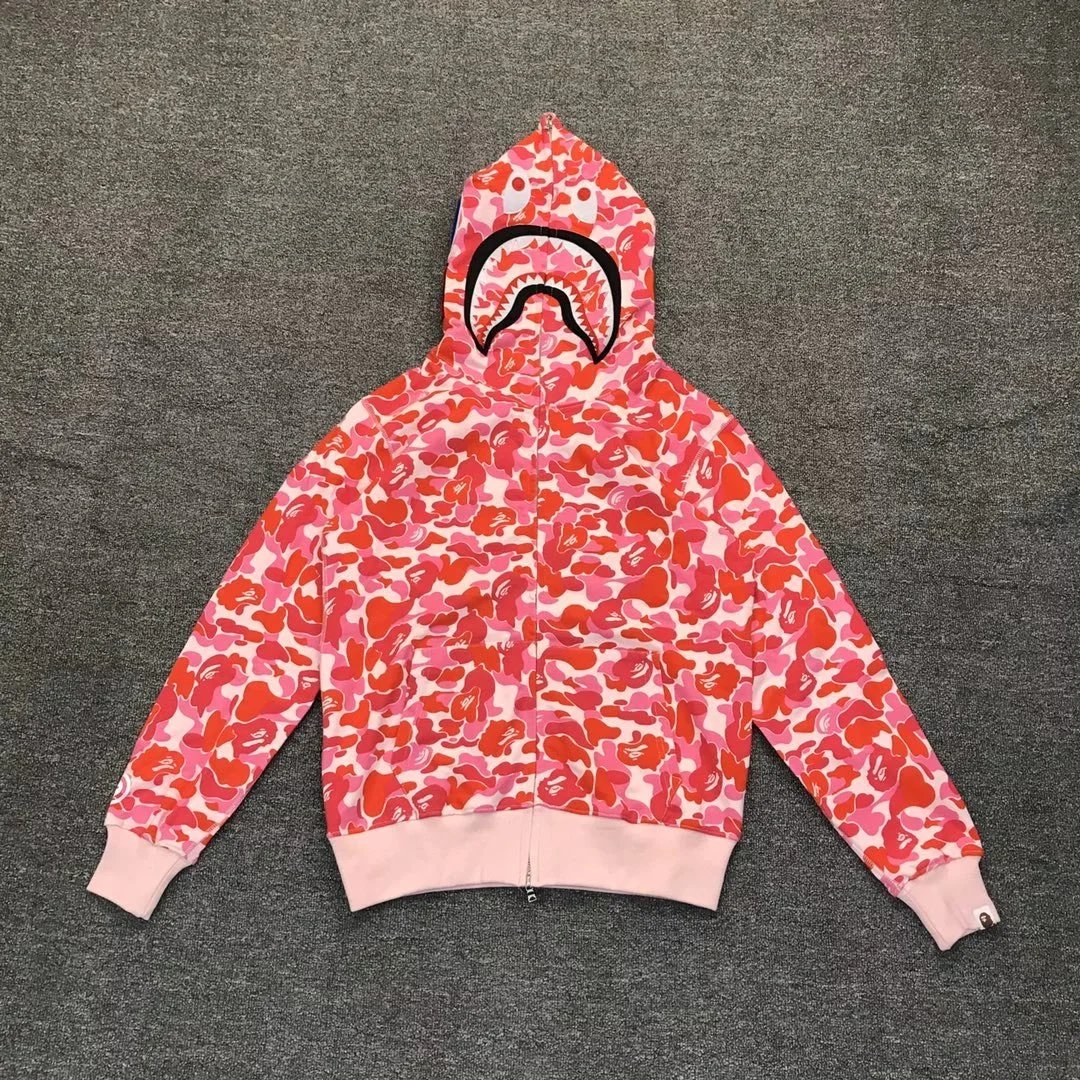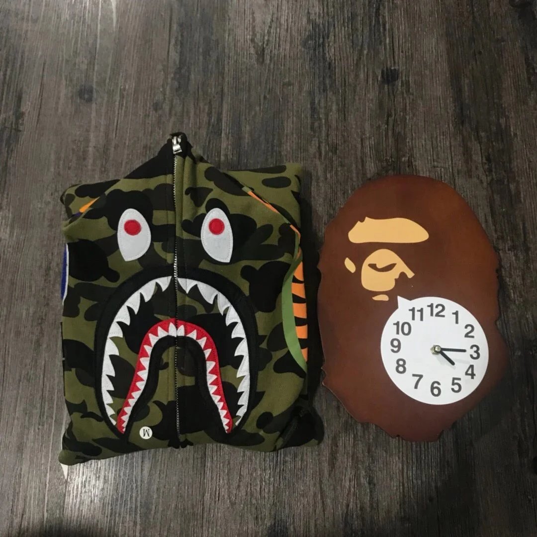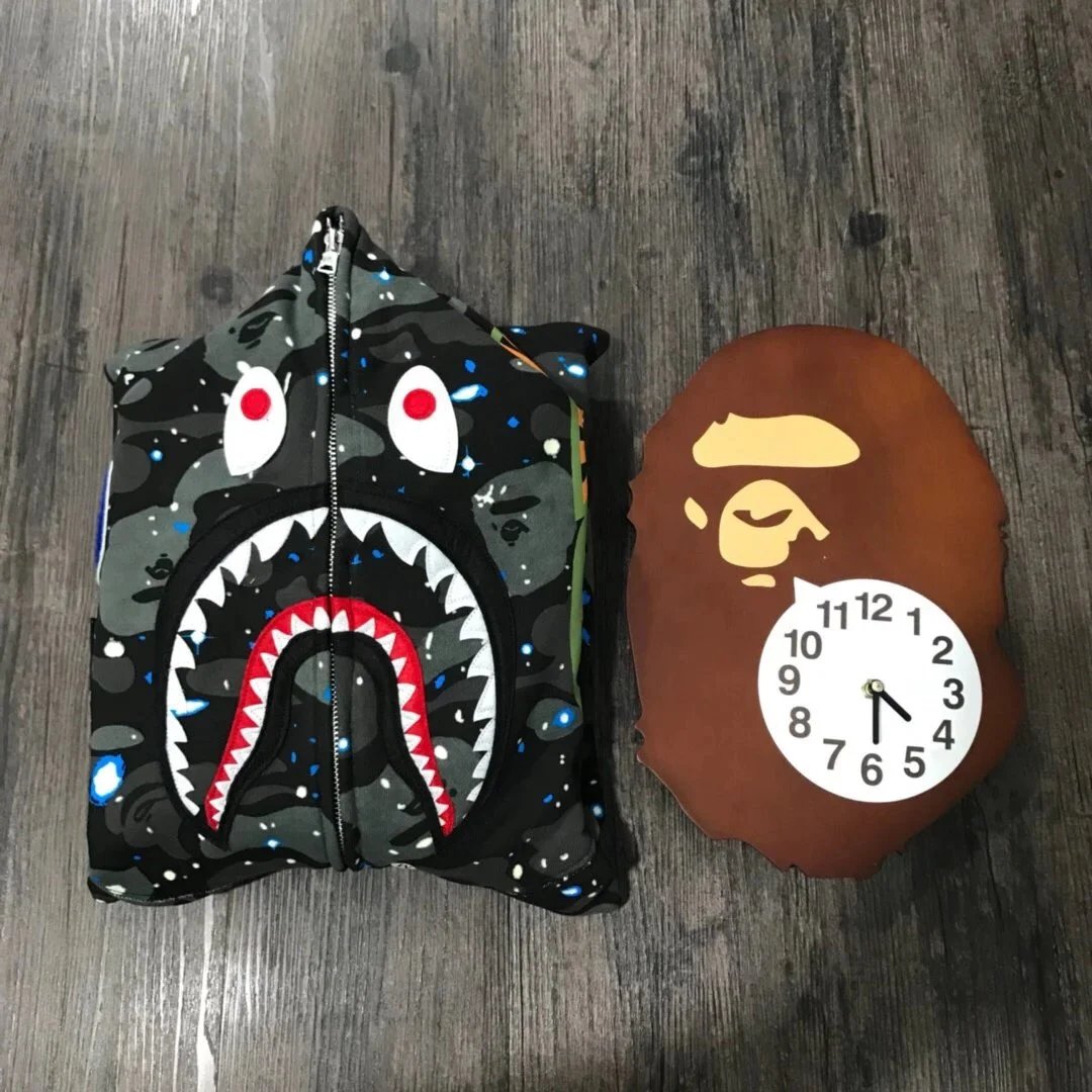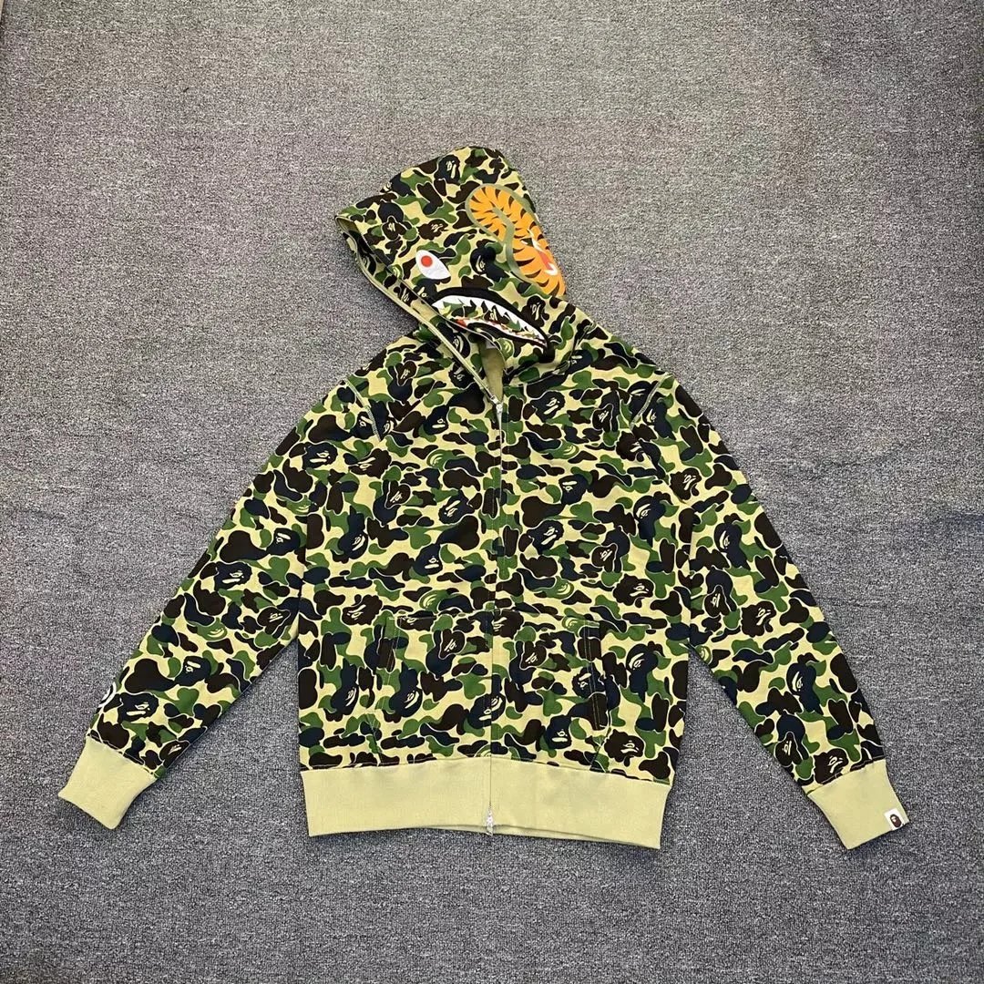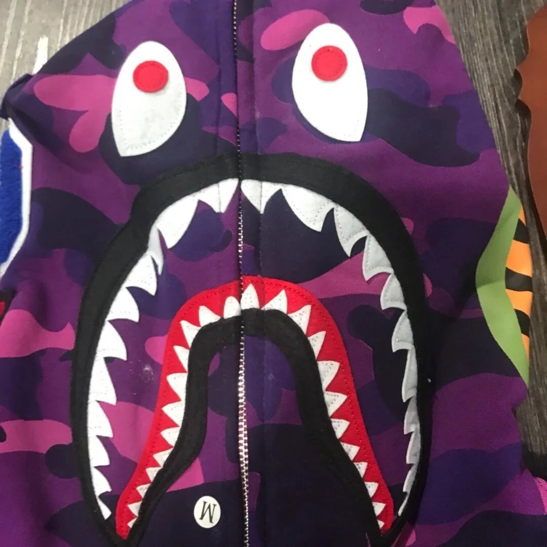 Authentic BAPE shark face zip-up hoodie in classic blue camouflage pattern. Iconic streetwear piece with bold graphic hood design.