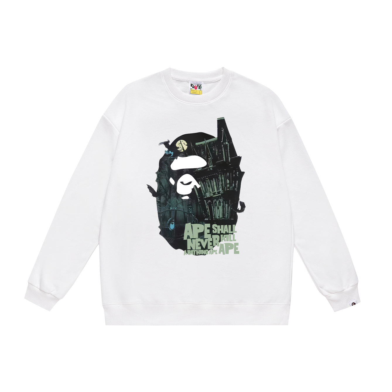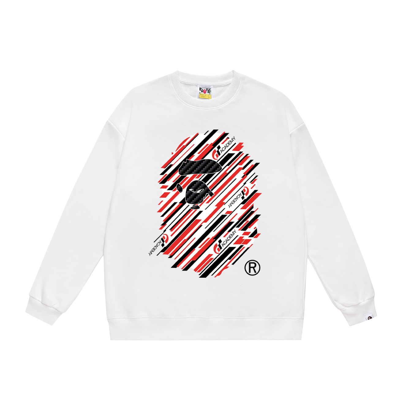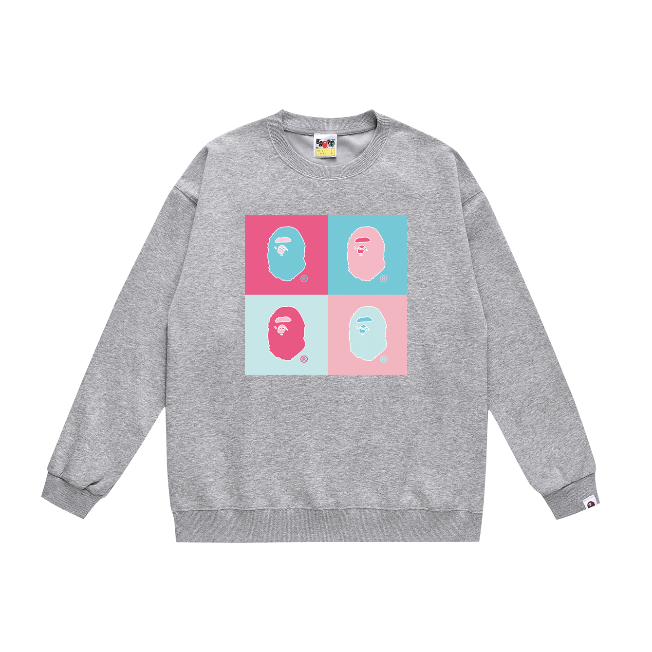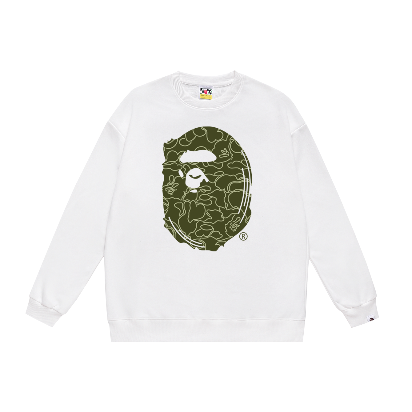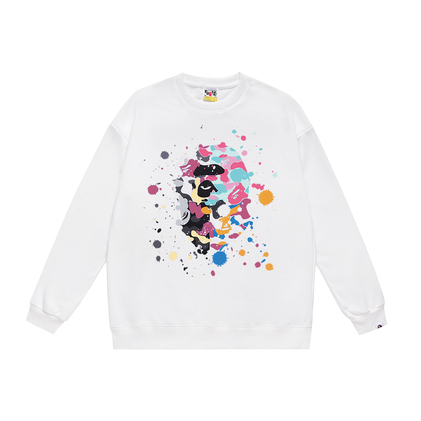 White BAPE crewneck sweatshirt featuring a bold multi-camo square graphic with four iconic Ape Head logos in contrasting colors.