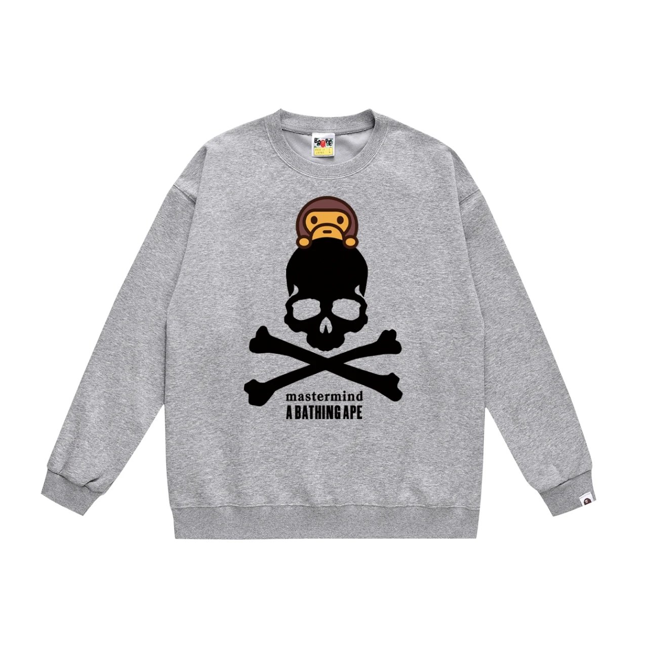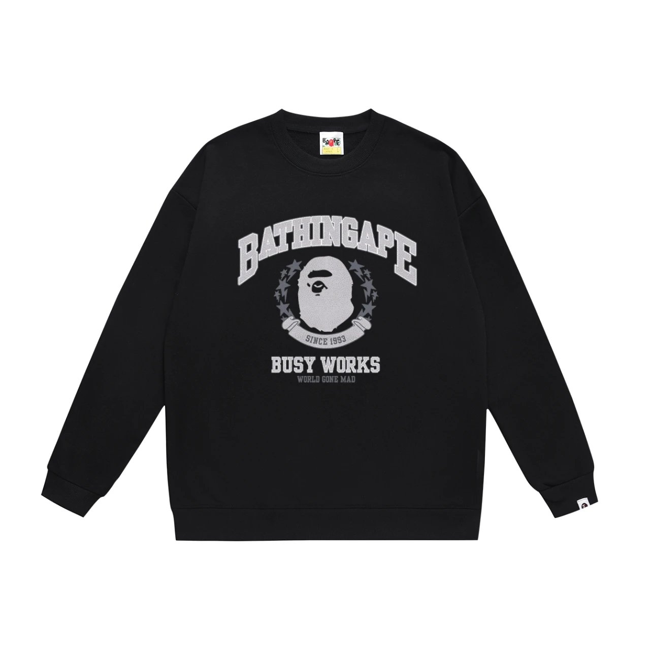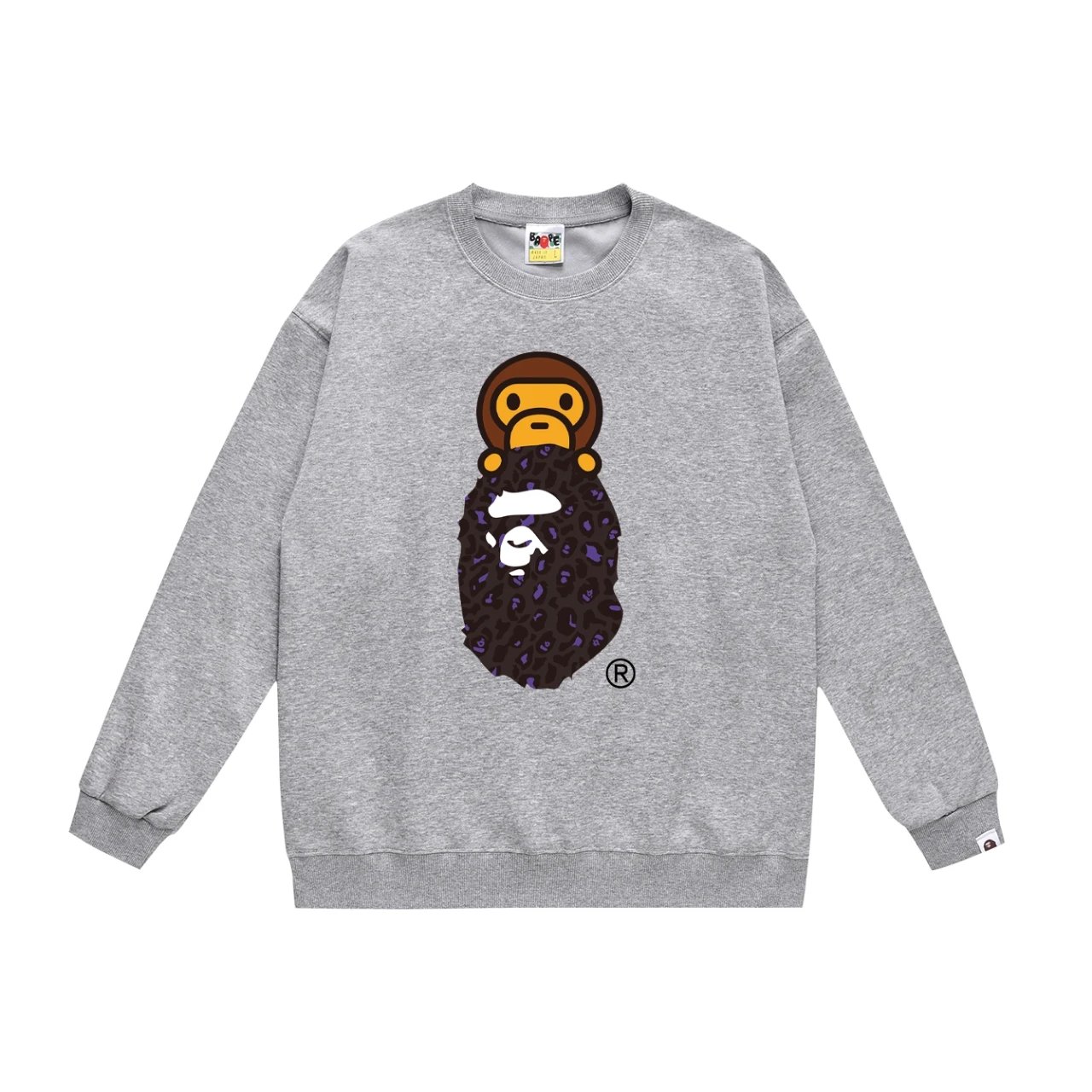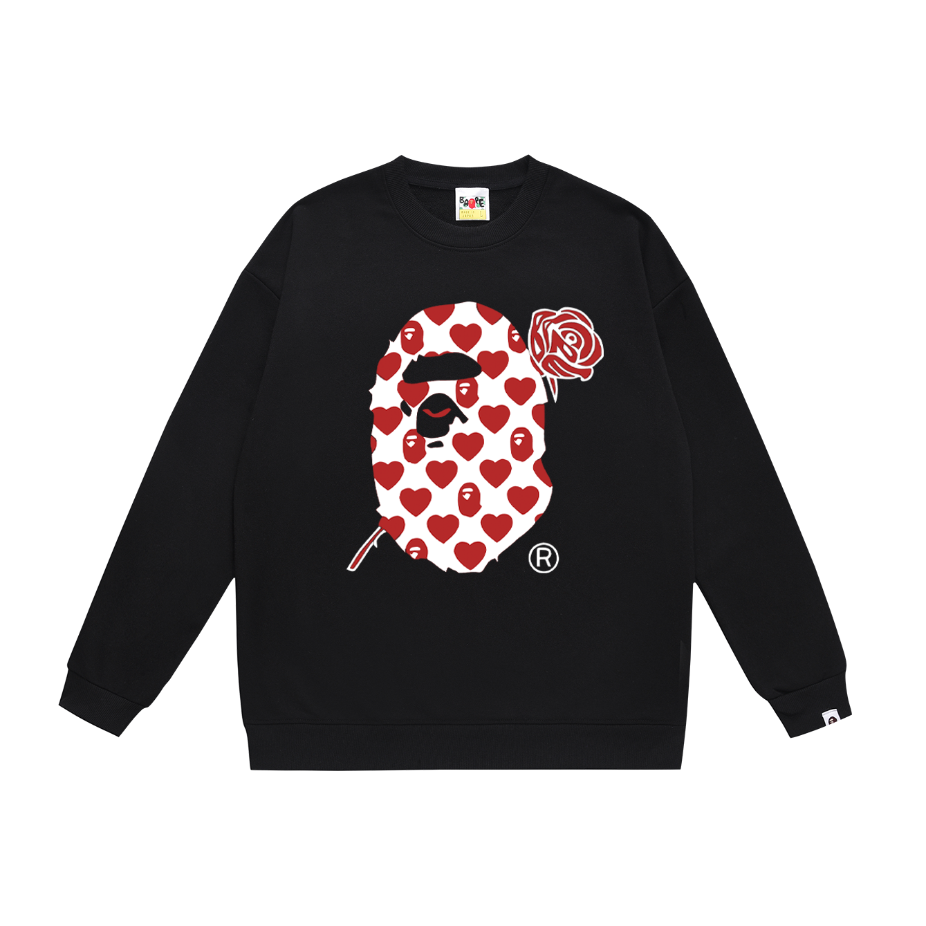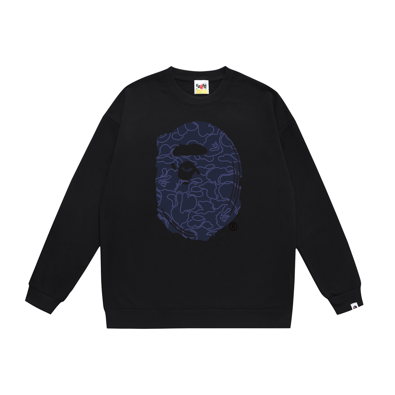 White BAPE crewneck sweatshirt featuring a bold multi-camo square graphic with four iconic Ape Head logos in contrasting colors.
