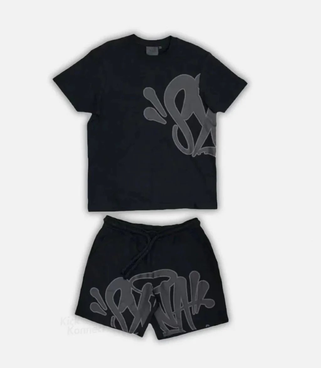 A black two-piece set featuring a short-sleeve t-shirt and drawstring shorts, both adorned with bold gray graffiti-style graphics for an urban edge. Ideal for casual wear or street-inspired looks.