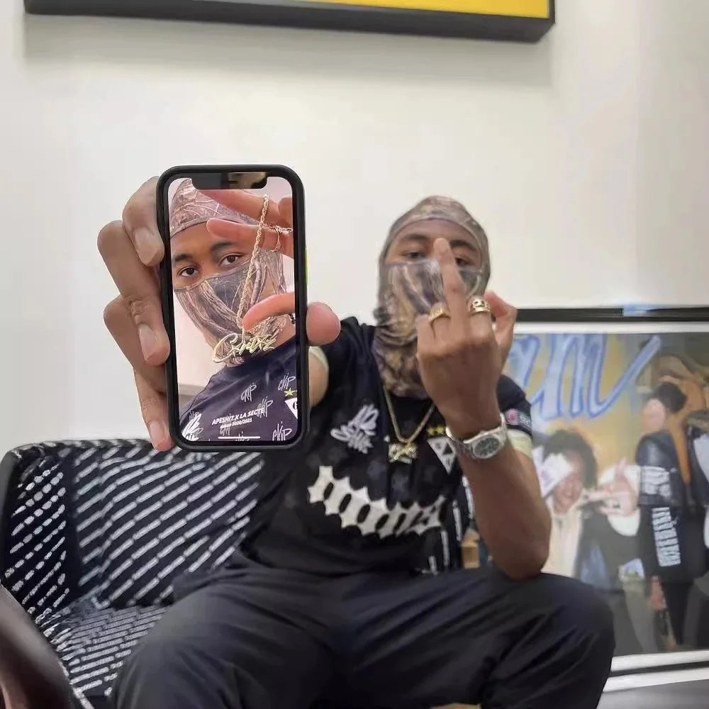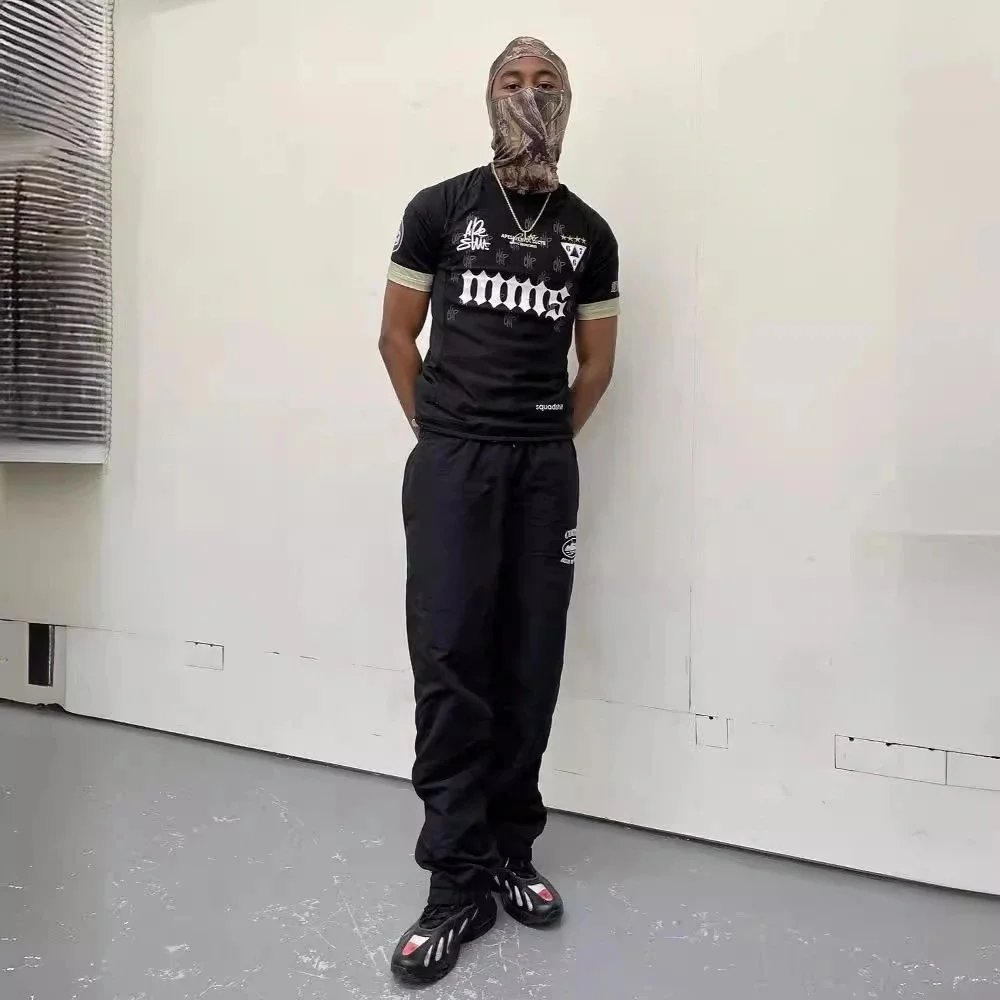 Stylish black athleisure set featuring a bold logo tee and matching sweatpants, paired with a camouflage face covering for a street-ready look. Ideal for urban casual wear.