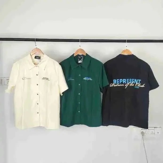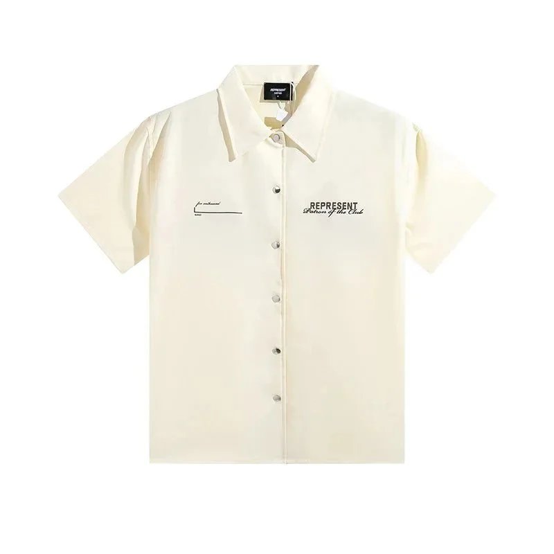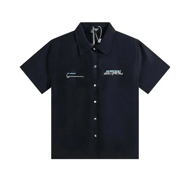A sleek black short-sleeve button-up shirt featuring subtle embroidered logos on the chest. Designed for casual or workwear use with a modern, clean aesthetic.