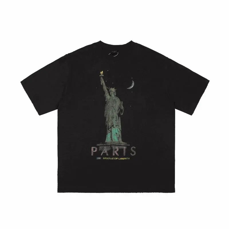 Black short-sleeve t-shirt featuring a vintage-style Statue of Liberty graphic with 'PARIS' text and crescent moon. Ideal for urban wear with a bold, artistic statement.