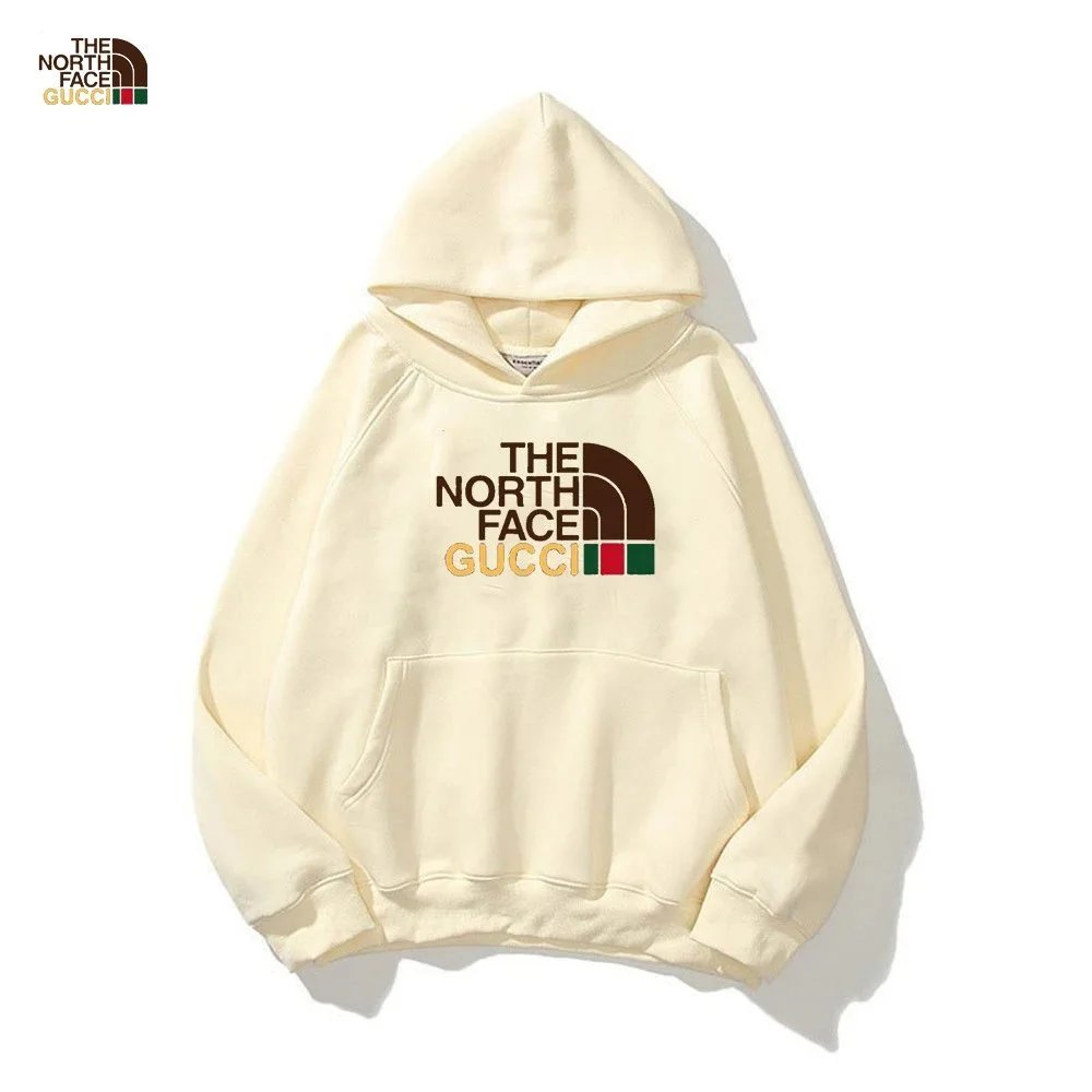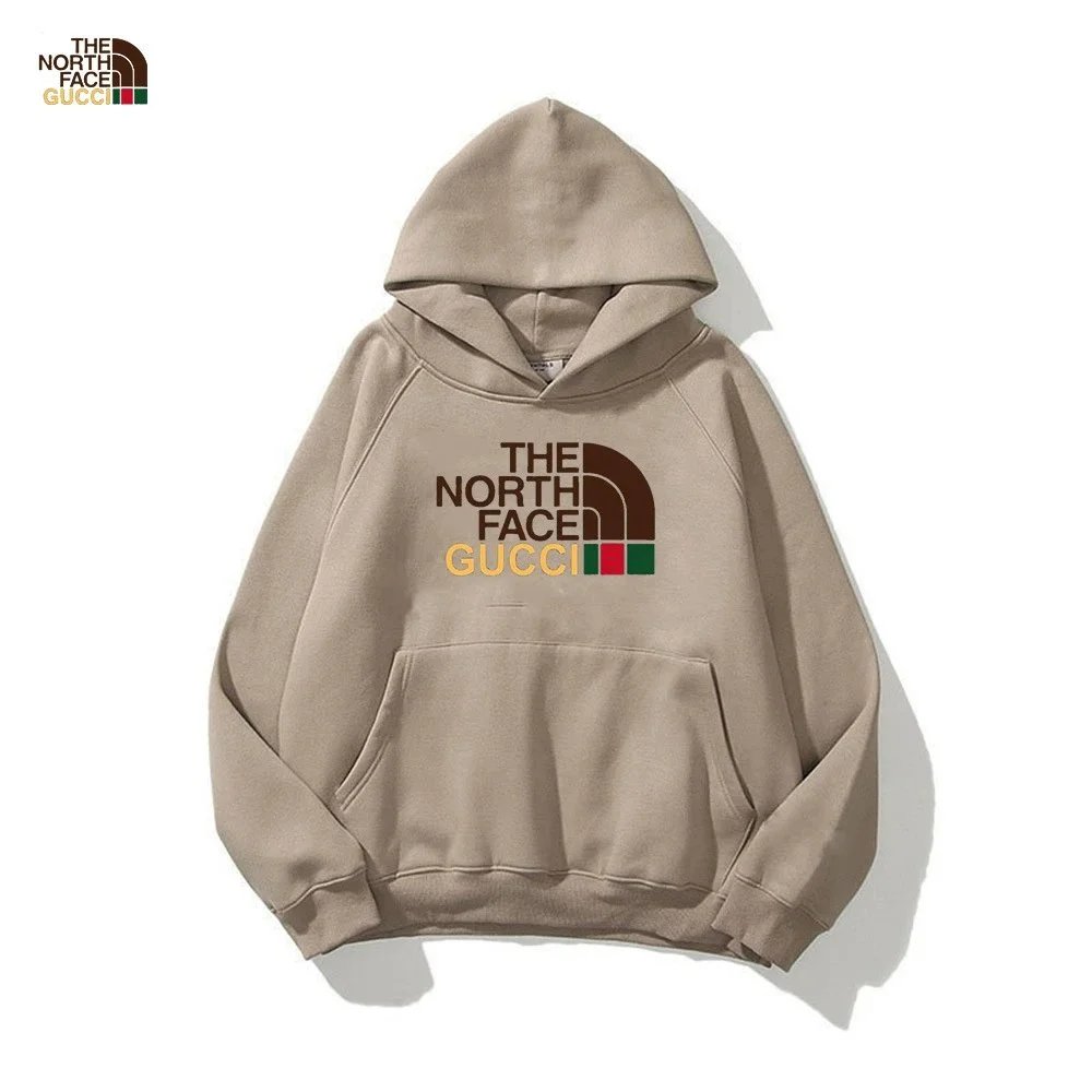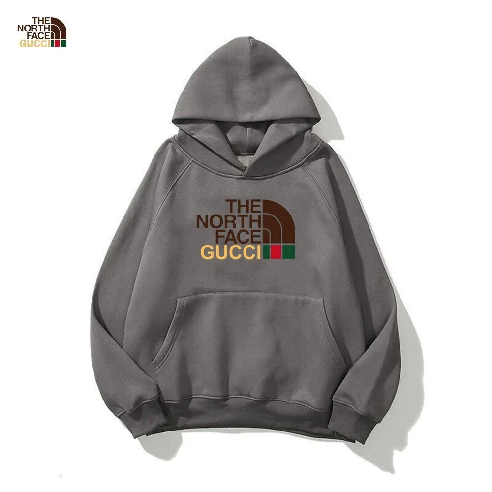 This black hooded sweatshirt features a bold collaboration graphic combining The North Face and Gucci logos. Designed for urban wear, it blends outdoor branding with luxury fashion elements.