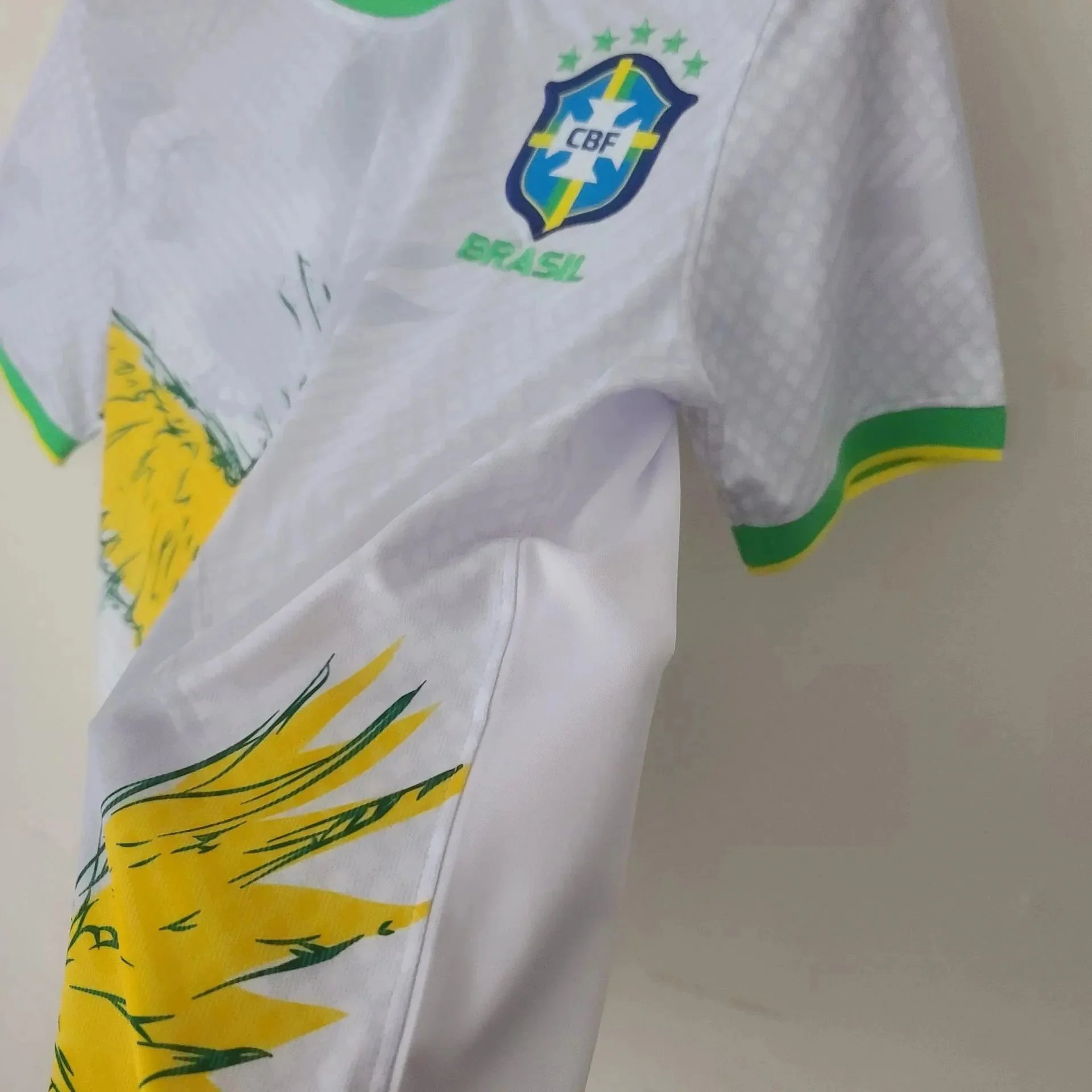 Official Brazil national team jerseys featuring iconic yellow, green, blue, and white designs with CBF crest. Includes unique patterns like palm leaves and flying birds for fans and collectors.