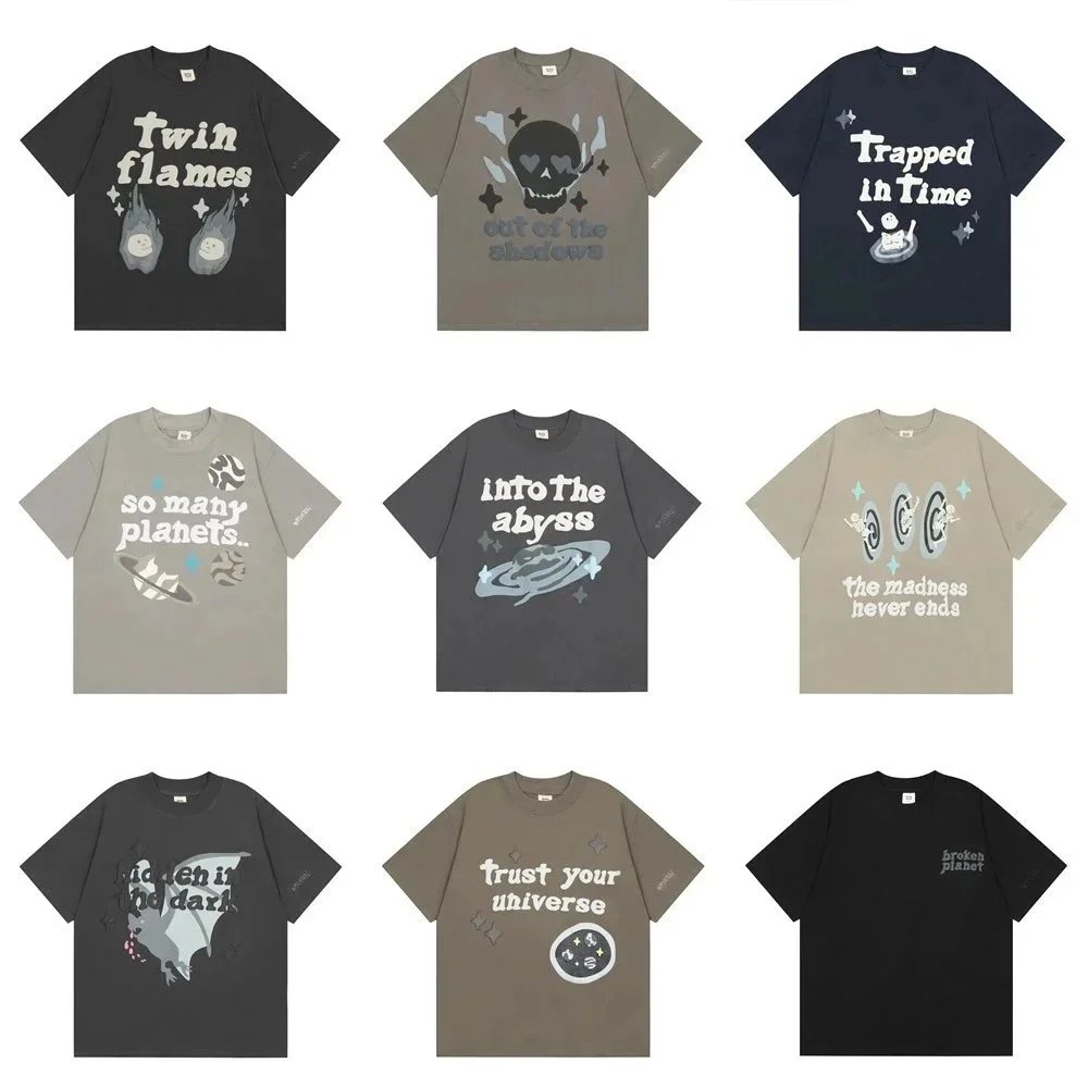 Discover the Broken Planet collection featuring bold cosmic-themed t-shirts with unique quotes like 'Trapped in Time' and 'Into The Abyss'. Each piece combines edgy graphics with a moody, space-inspired aesthetic.