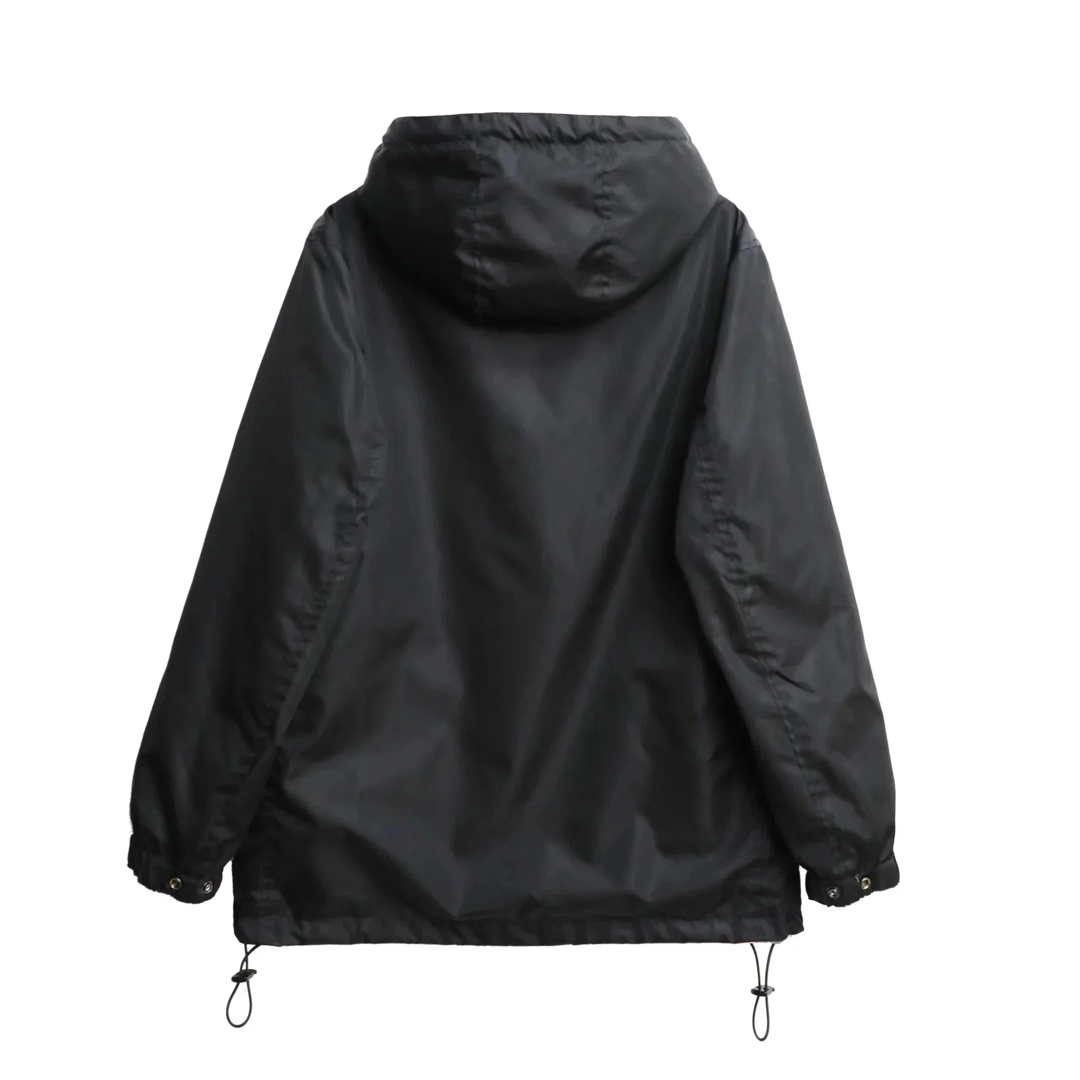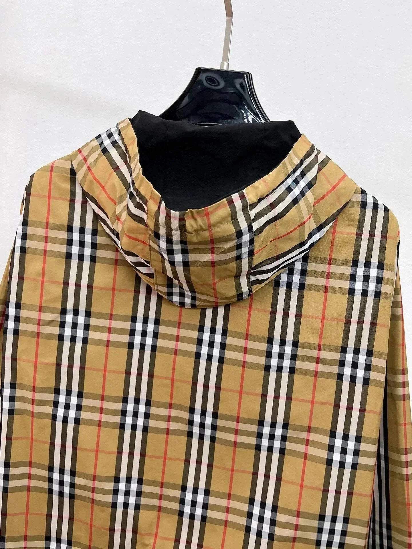 Stylish Burberry black hooded jacket featuring iconic check lining and logo patch. Perfect for a sophisticated, weather-ready look.