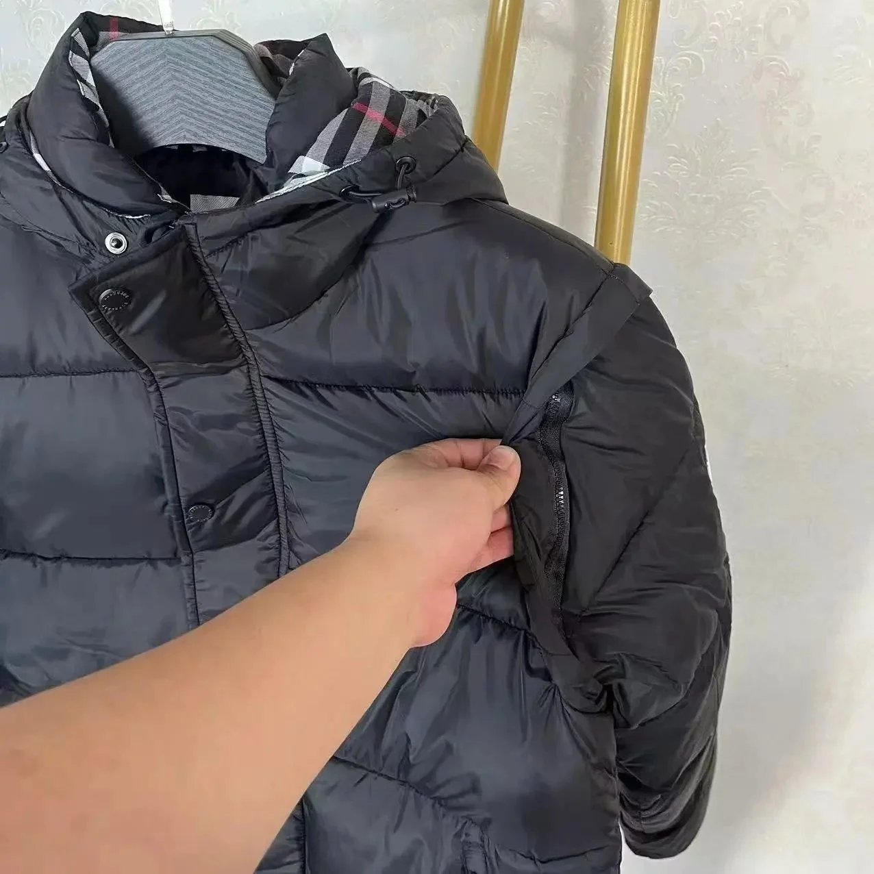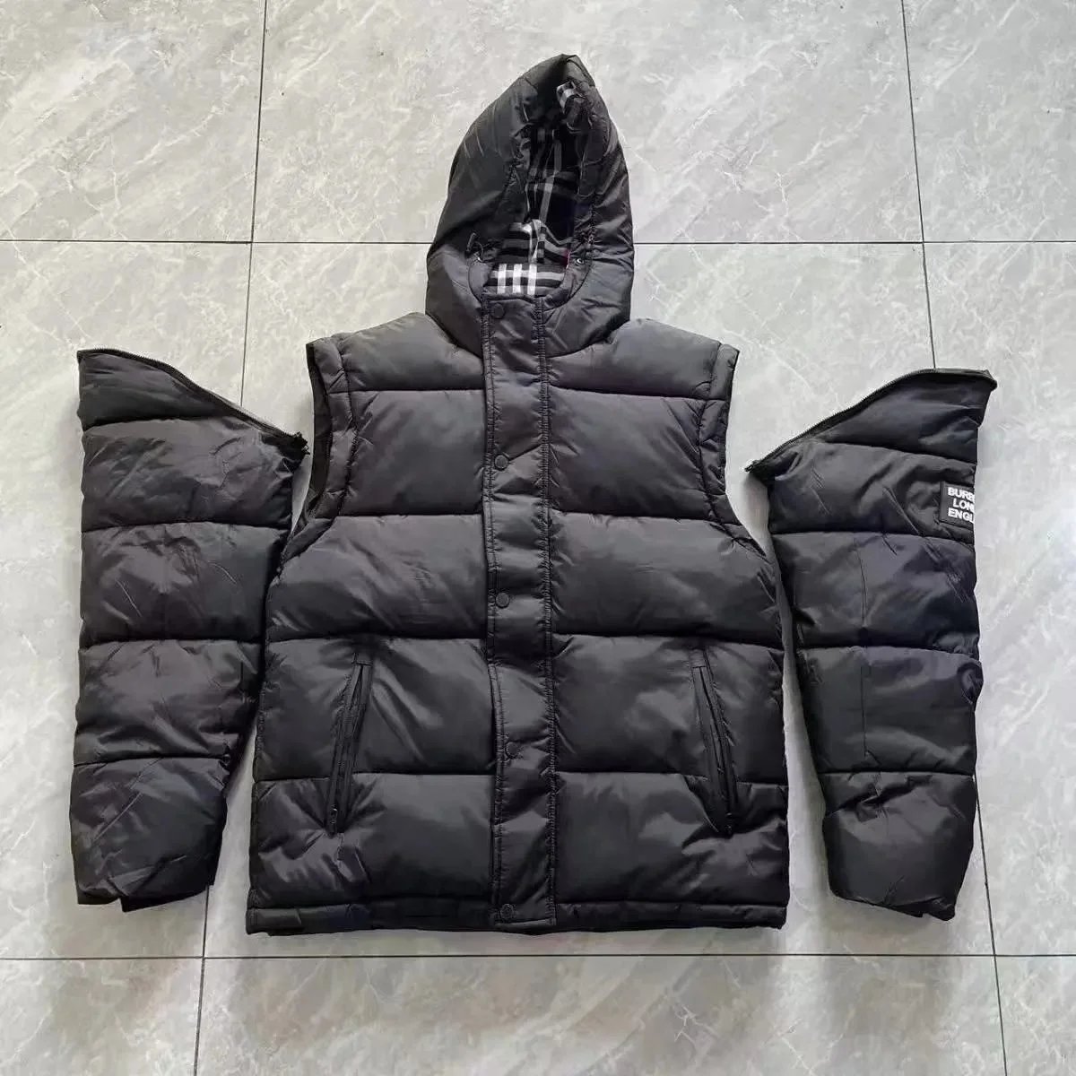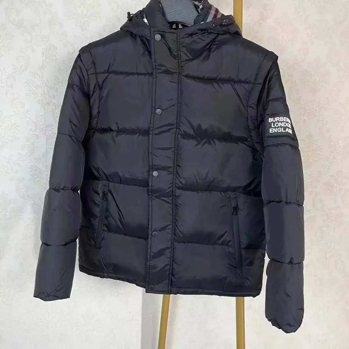 Stylish Burberry black hooded puffer jacket featuring a classic check-lined hood and signature logo patch. Perfect for cold weather with premium insulation and timeless design.
